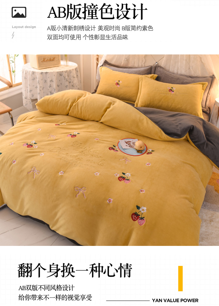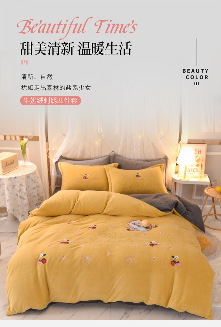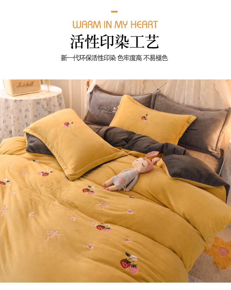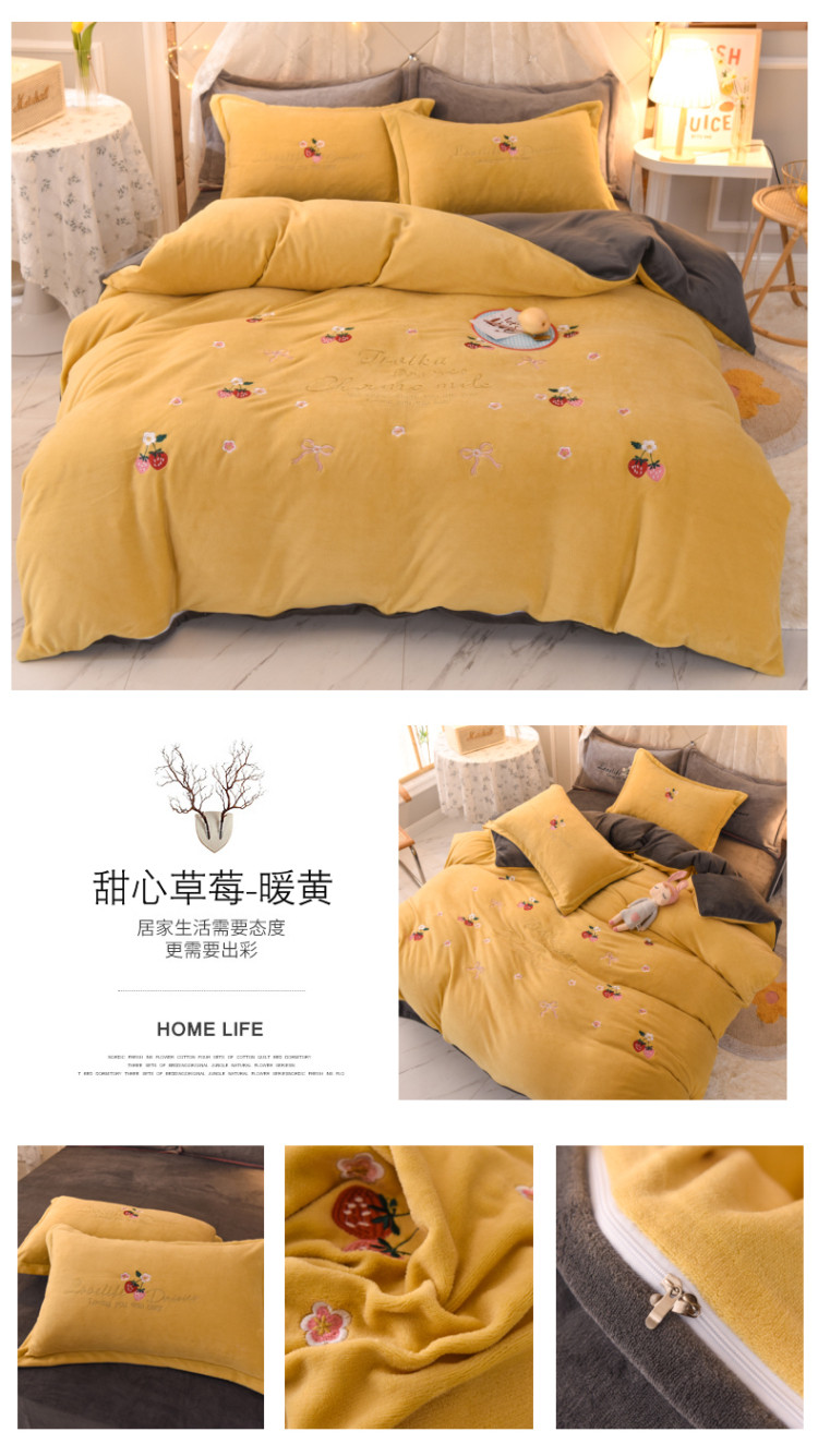 商品名称:捌月牛奶绒小清新刺绣四件套 甜心草莓-暖黄