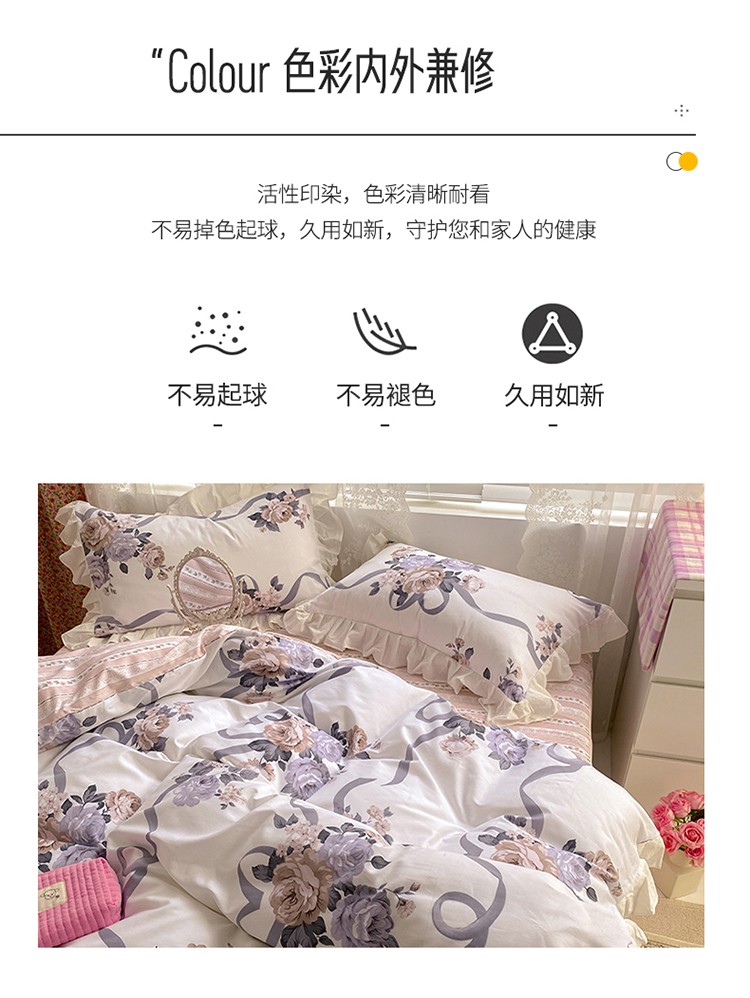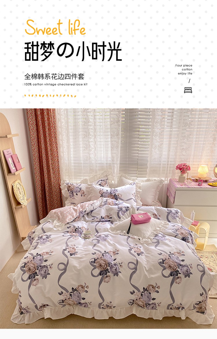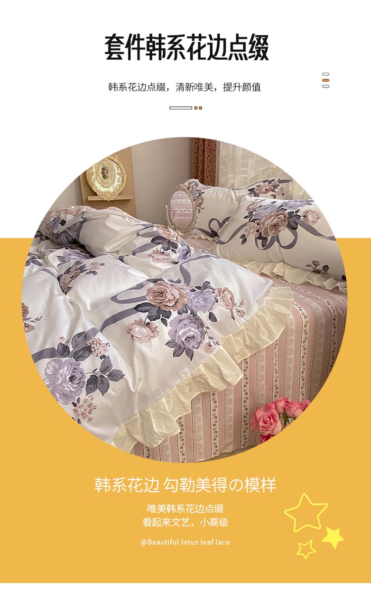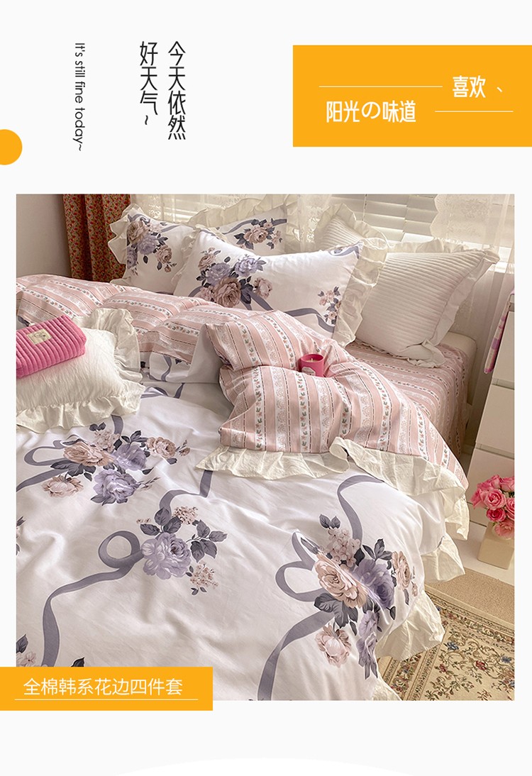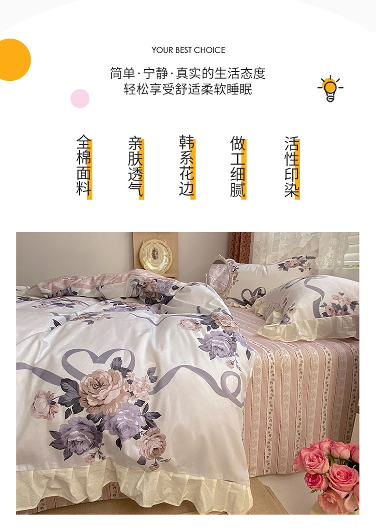 雅居纺 2022新款全棉韩版花边四件套 丝带玫瑰