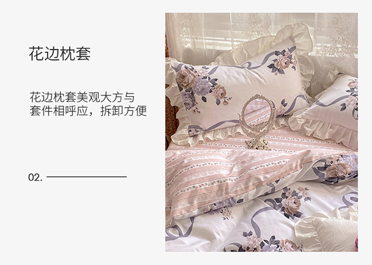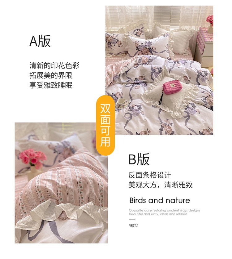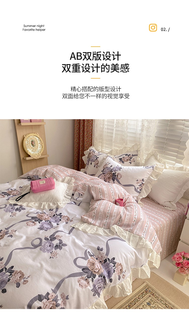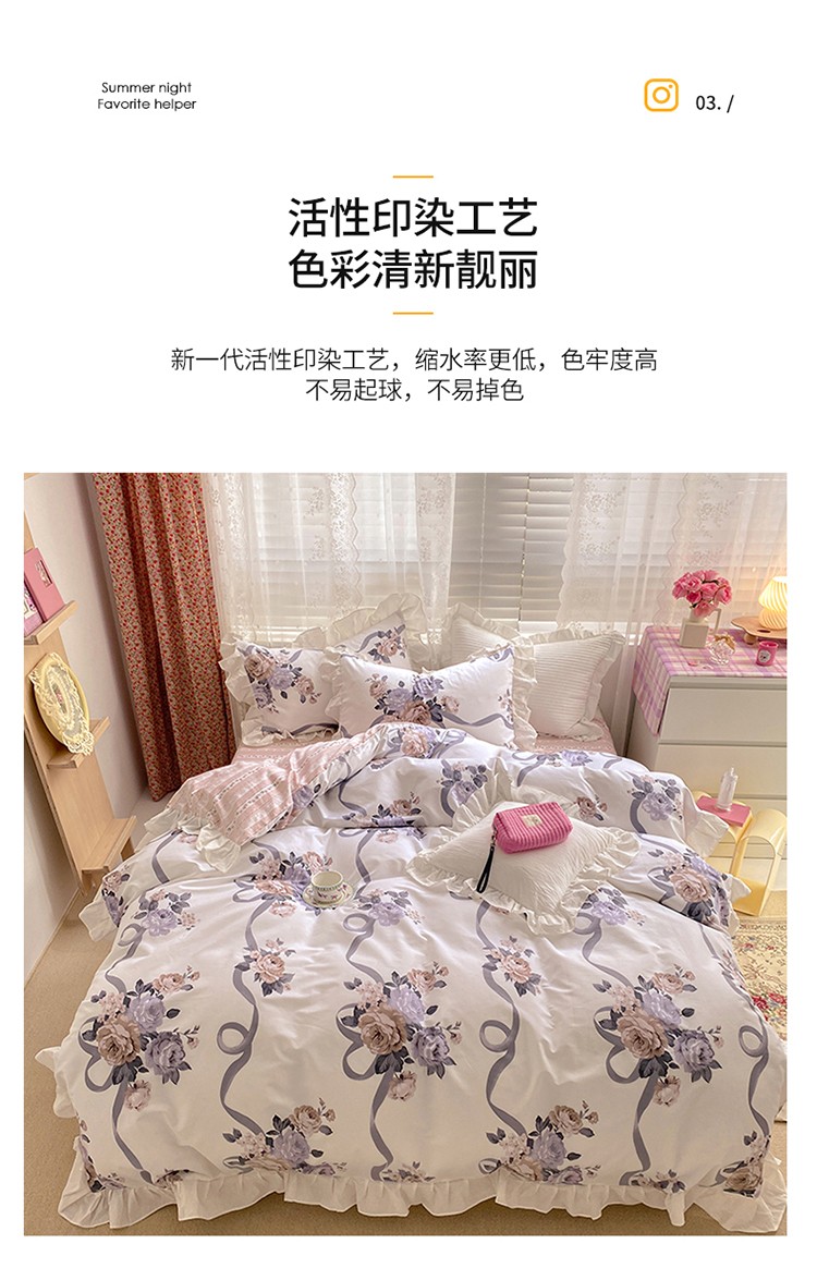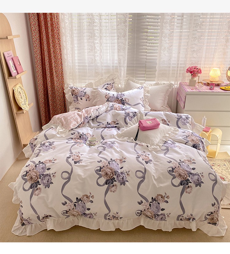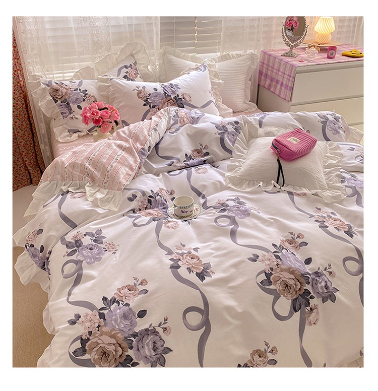 雅居纺 2022新款全棉韩版花边四件套 丝带玫瑰