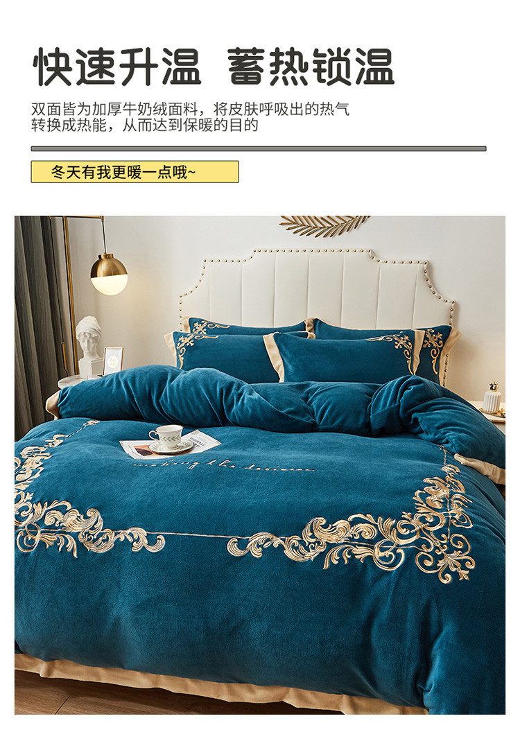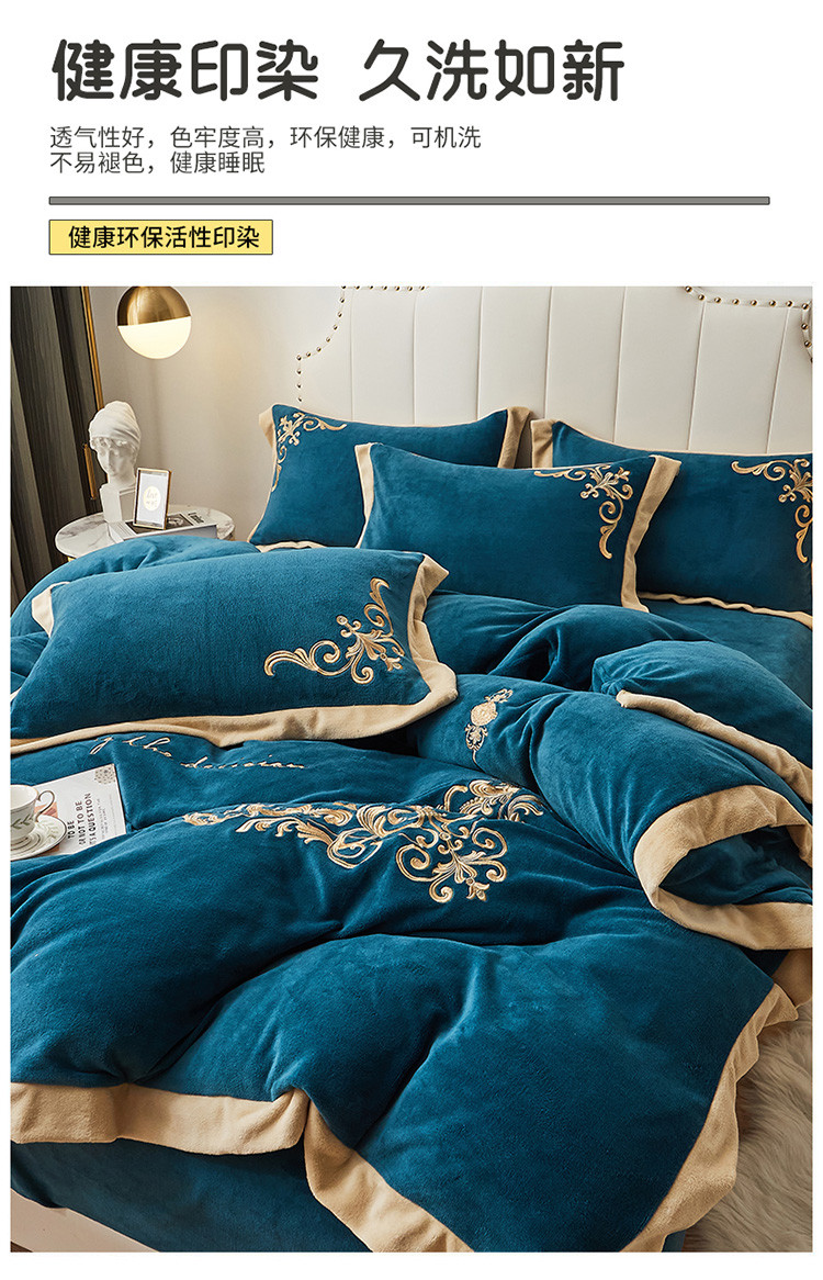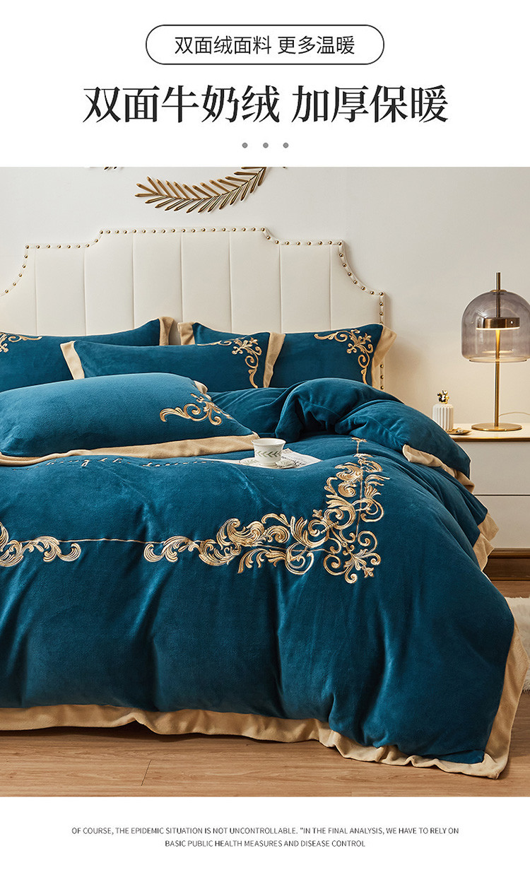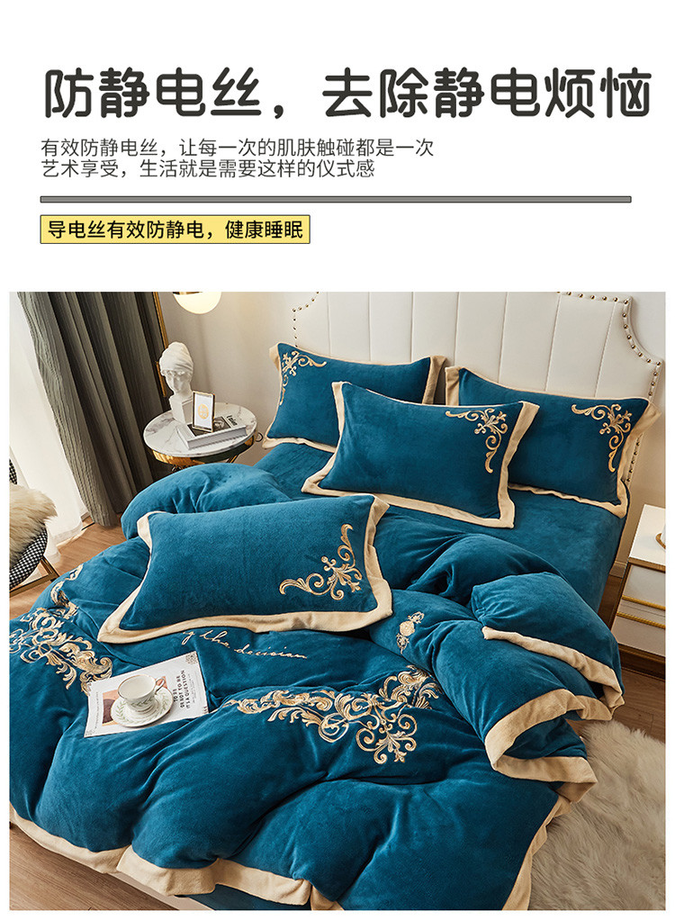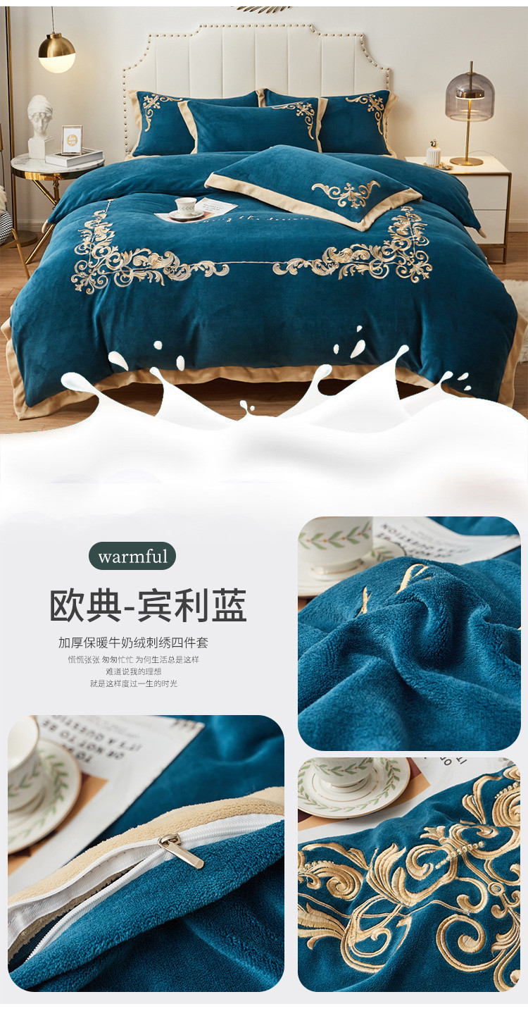 商品名称:22新款保暖加厚牛奶绒四件套宝宝绒欧尚刺绣四件套欧典宾利蓝