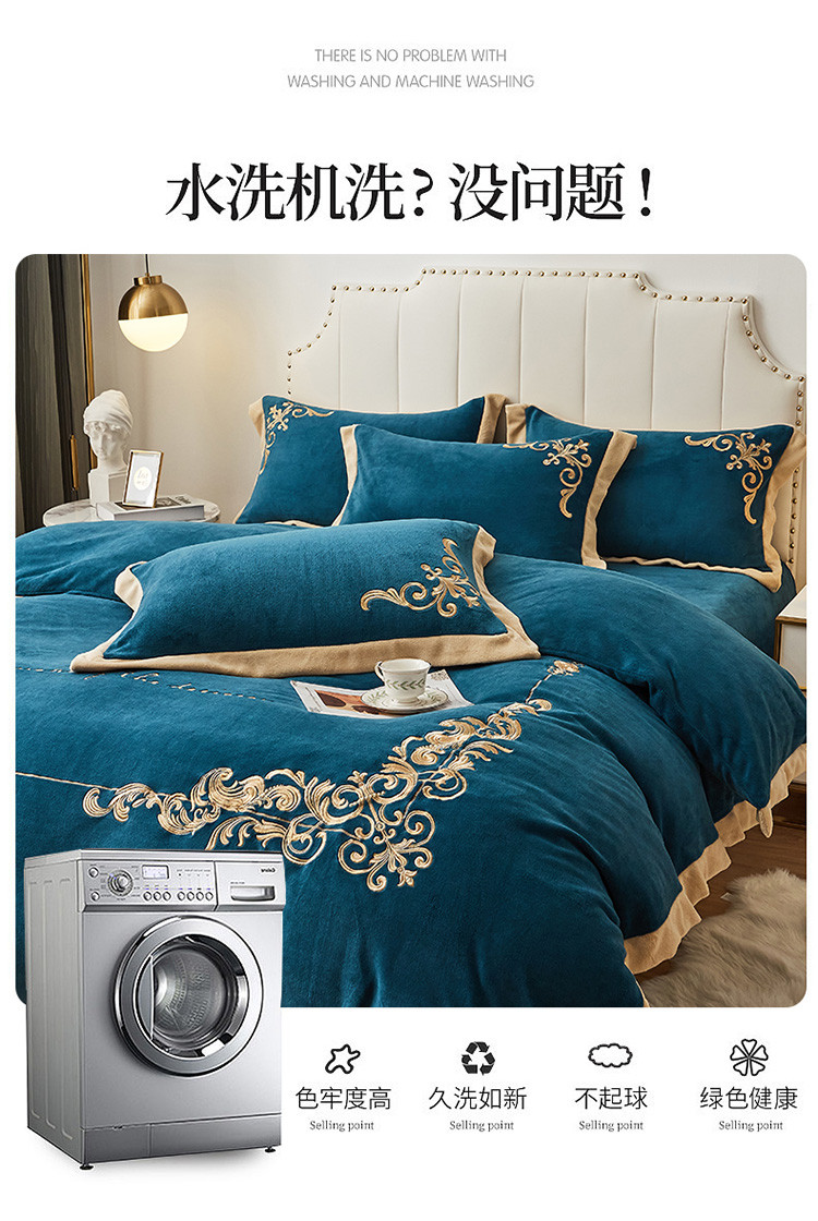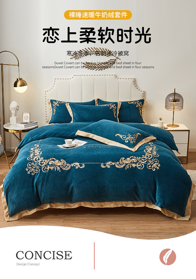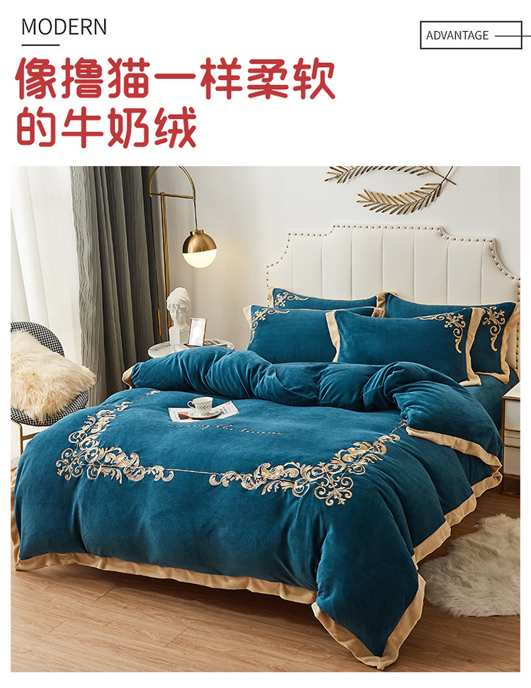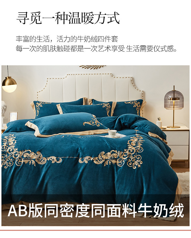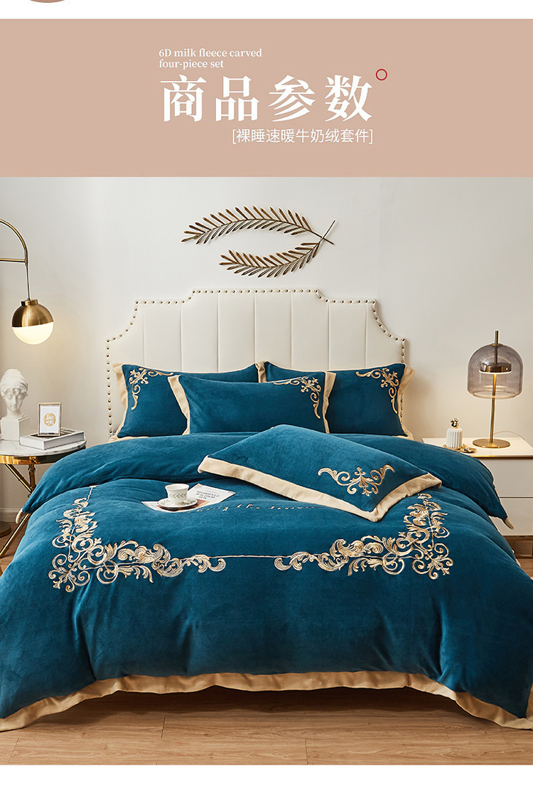 商品名称:22新款保暖加厚牛奶绒四件套宝宝绒欧尚刺绣四件套欧典宾利蓝