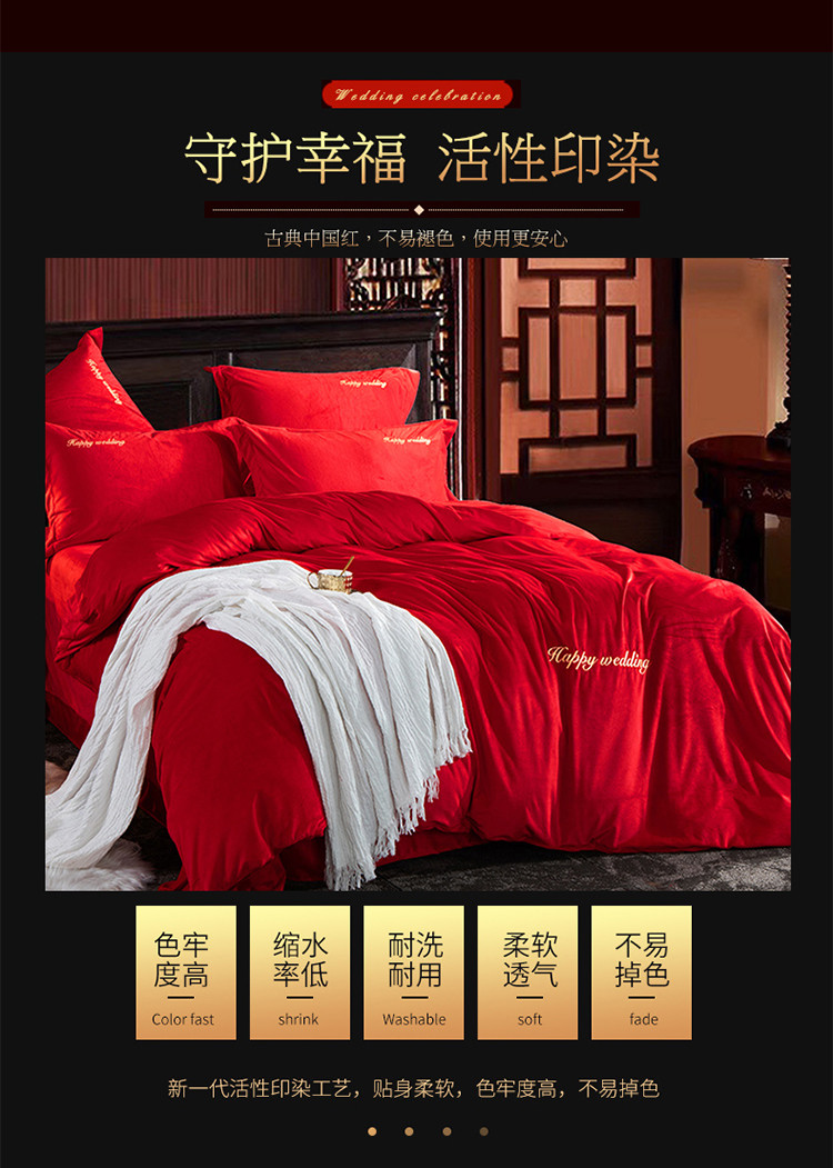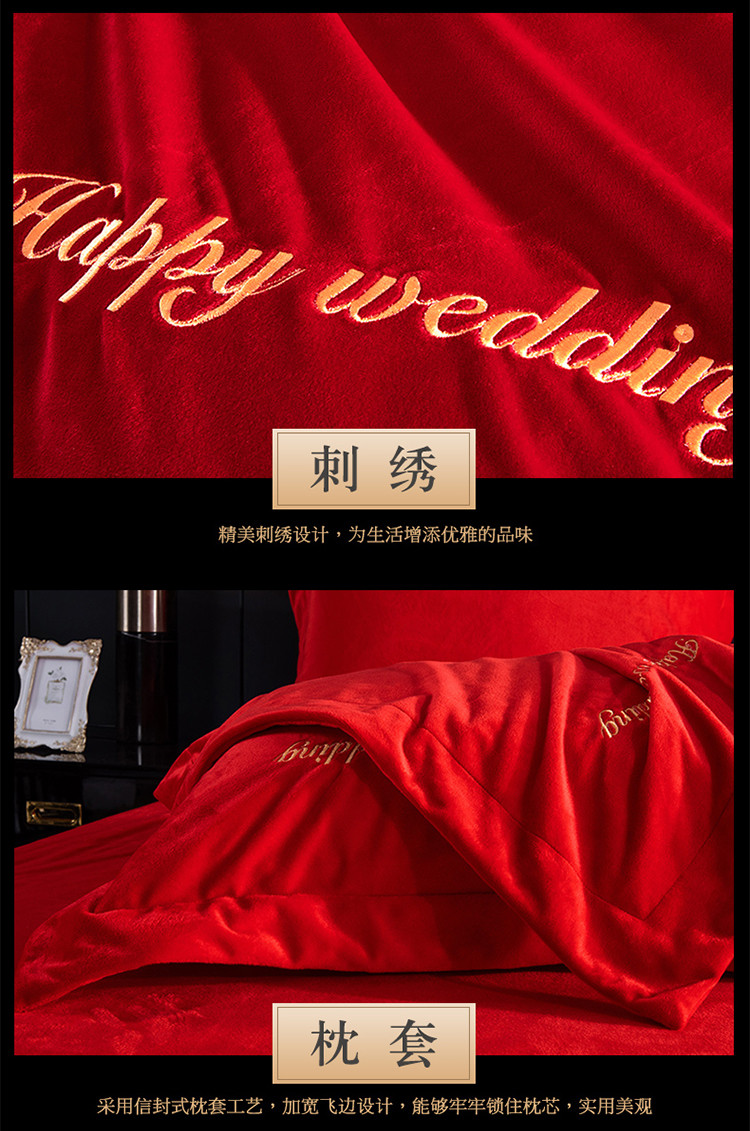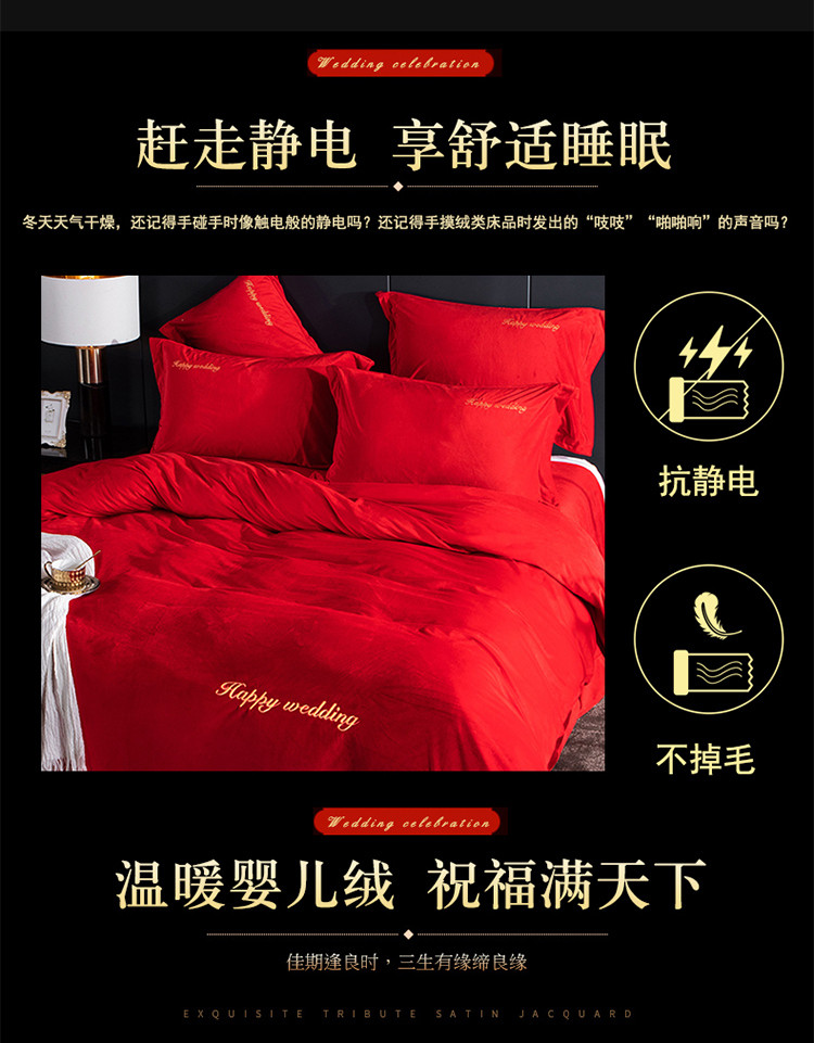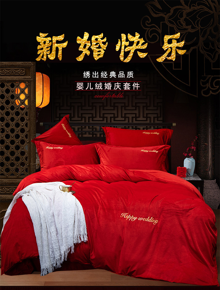 慕她家纺 婴儿绒婚庆四件套大红色刺绣结婚水晶法兰绒牛奶绒 新婚快乐
