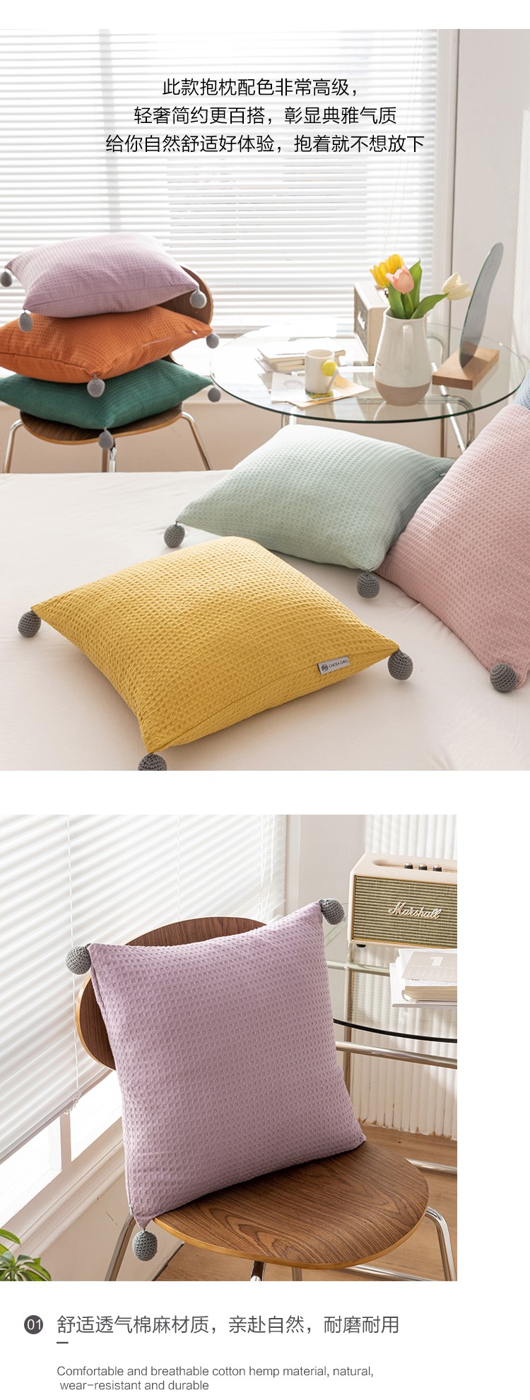 (总)美茉家居 2023新款棉麻双针抱枕,湖蓝,酒红,麻本,摩卡棕,土褐