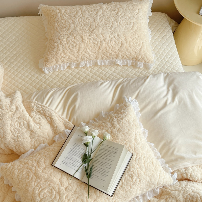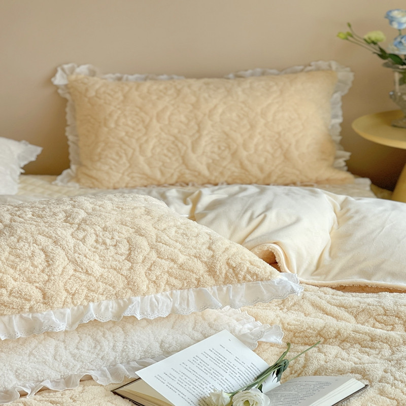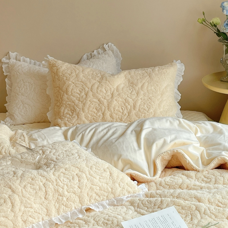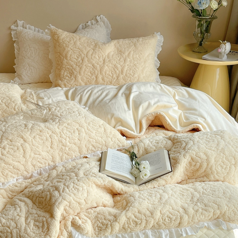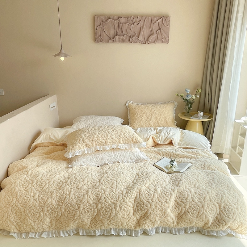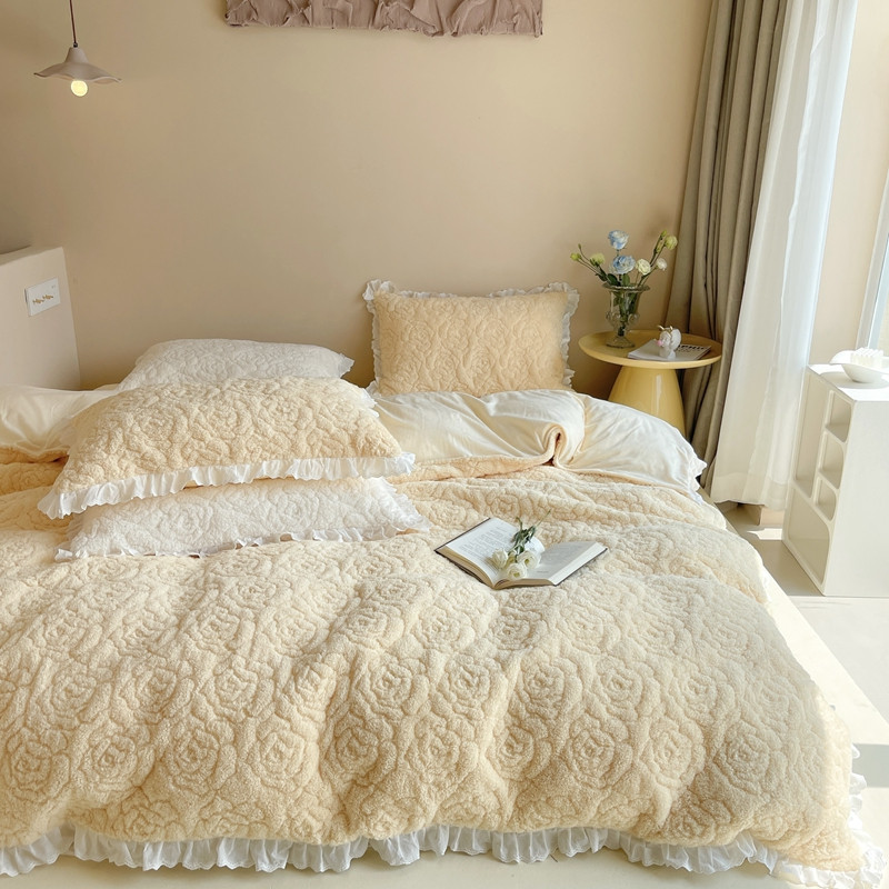 嗨购 2022新款绗绣泰迪绒玫瑰花边四件套 米黄