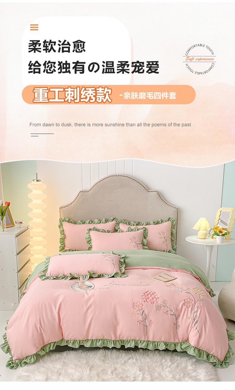 (总)富盛家纺 2025新款牛奶绒床裙款盘花刺绣四件套韩版法式公主风--梦洛伊系列,梦洛伊-粉,梦洛伊-绿,梦洛伊-黄,梦洛伊-白,梦洛伊-蓝,梦洛伊-紫