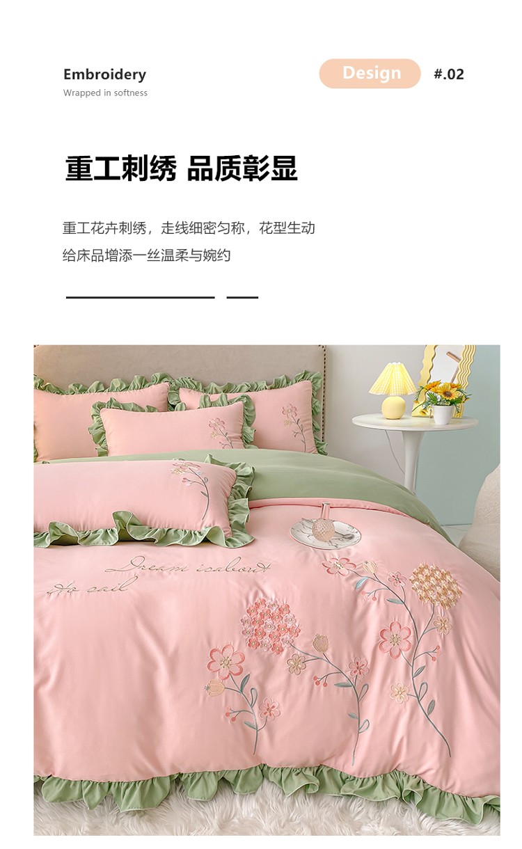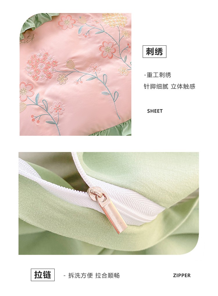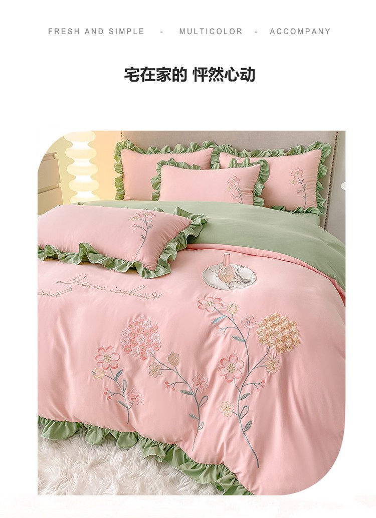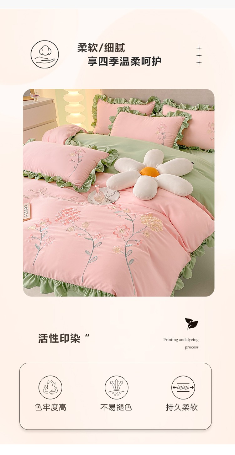 (总)富盛 2024新款水洗亲肤棉刺绣公主风四件套-春暖花开,浅绿+深绿,紫黄,浅绿,粉玉,白粉,粉绿,黄蓝,大红