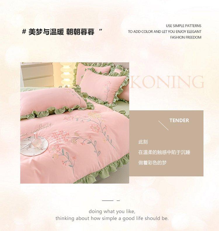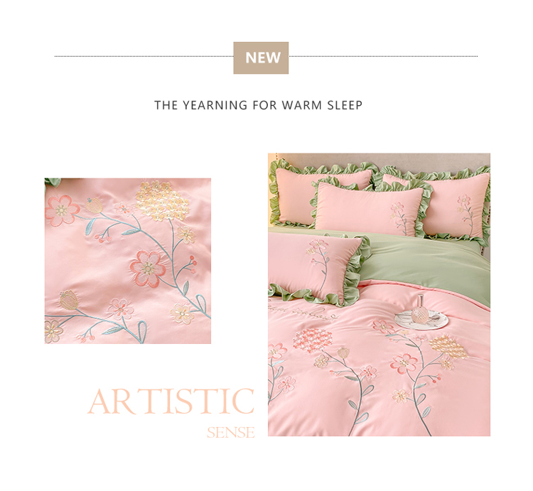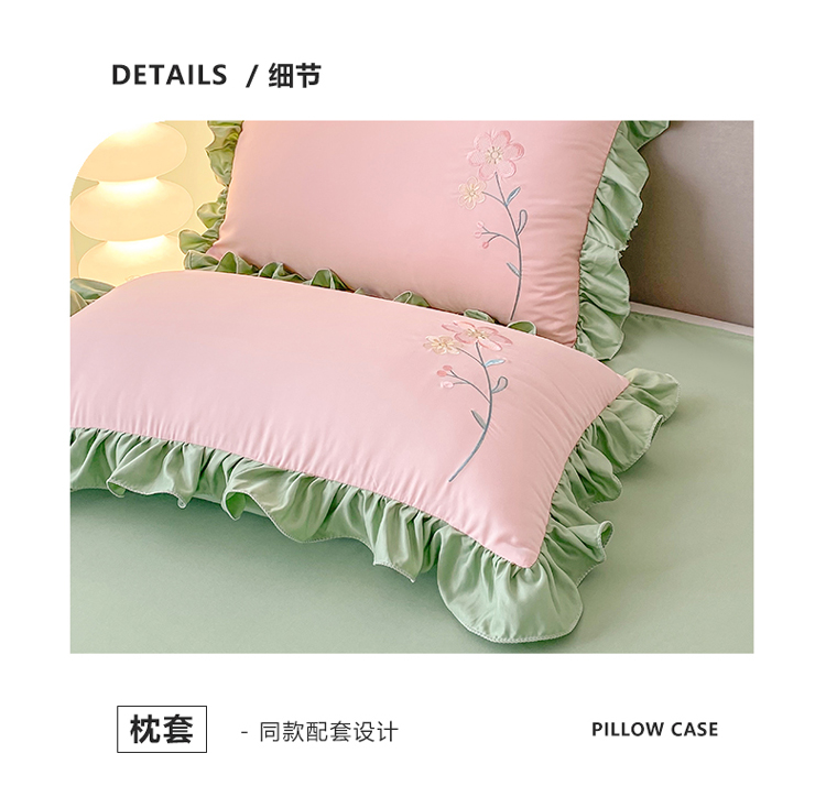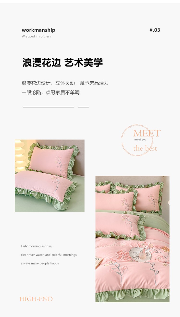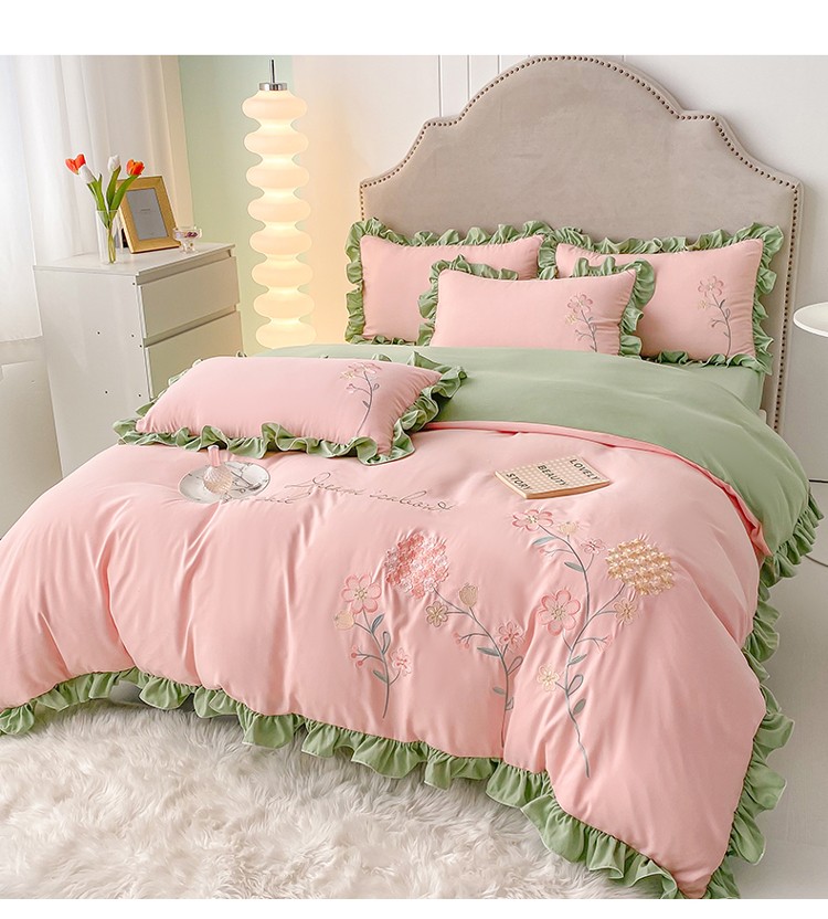 (总)富盛 2024新款水洗亲肤棉刺绣公主风四件套-春暖花开,浅绿+深绿,紫黄,浅绿,粉玉,白粉,粉绿,黄蓝,大红