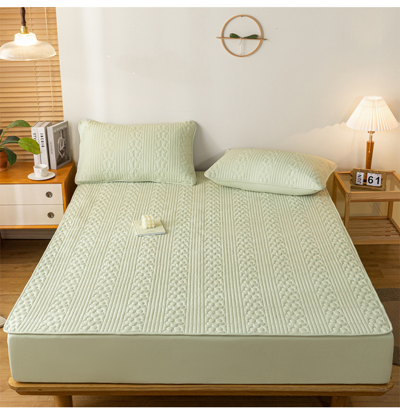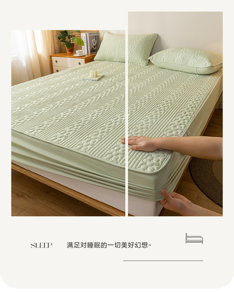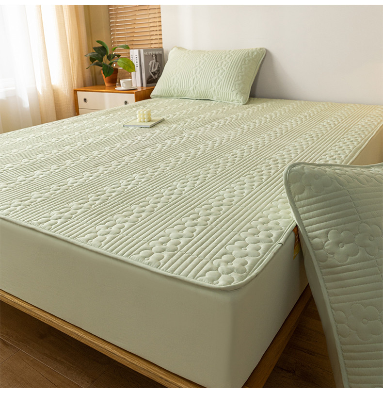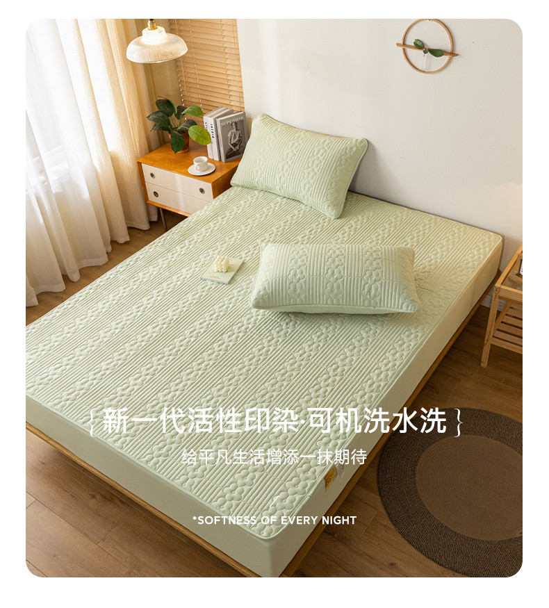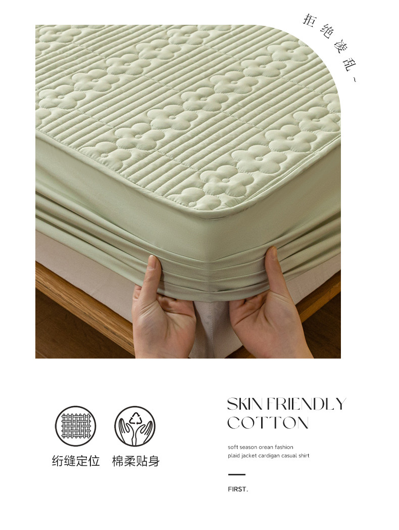 古吉梦2023新款 A类水洗棉夹棉防水床笠花朵系列三件套 花朵-茶绿
