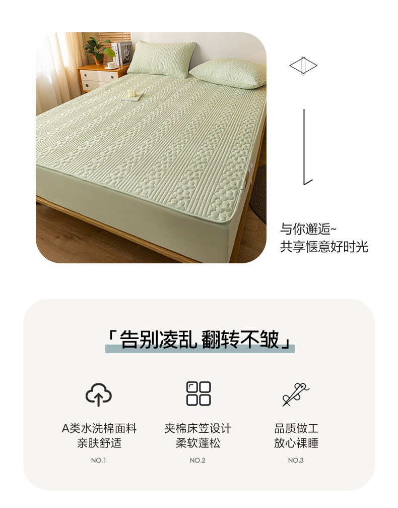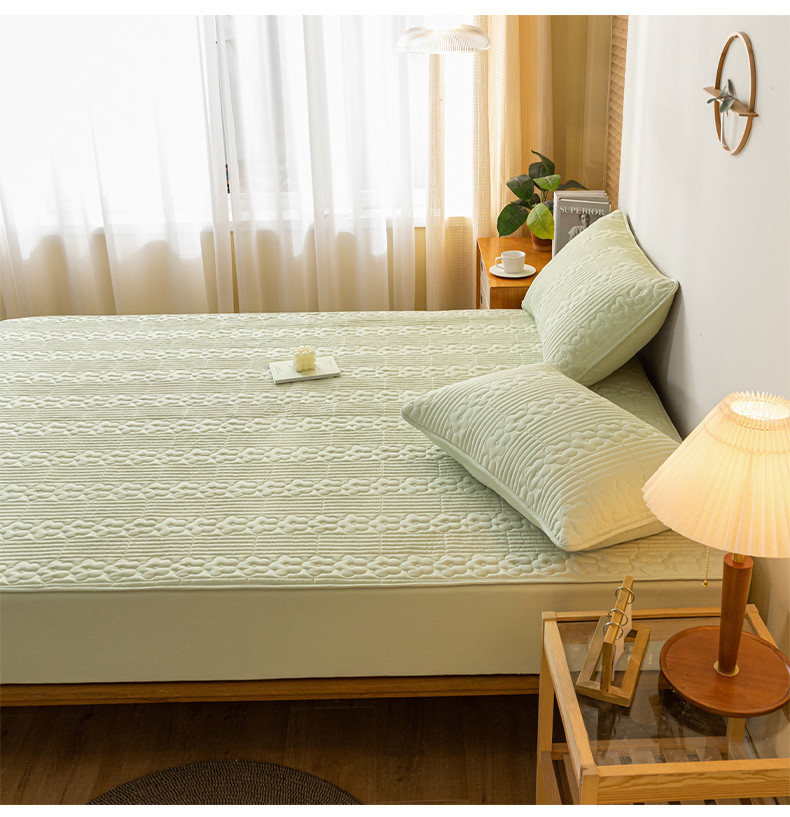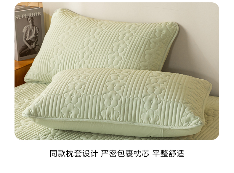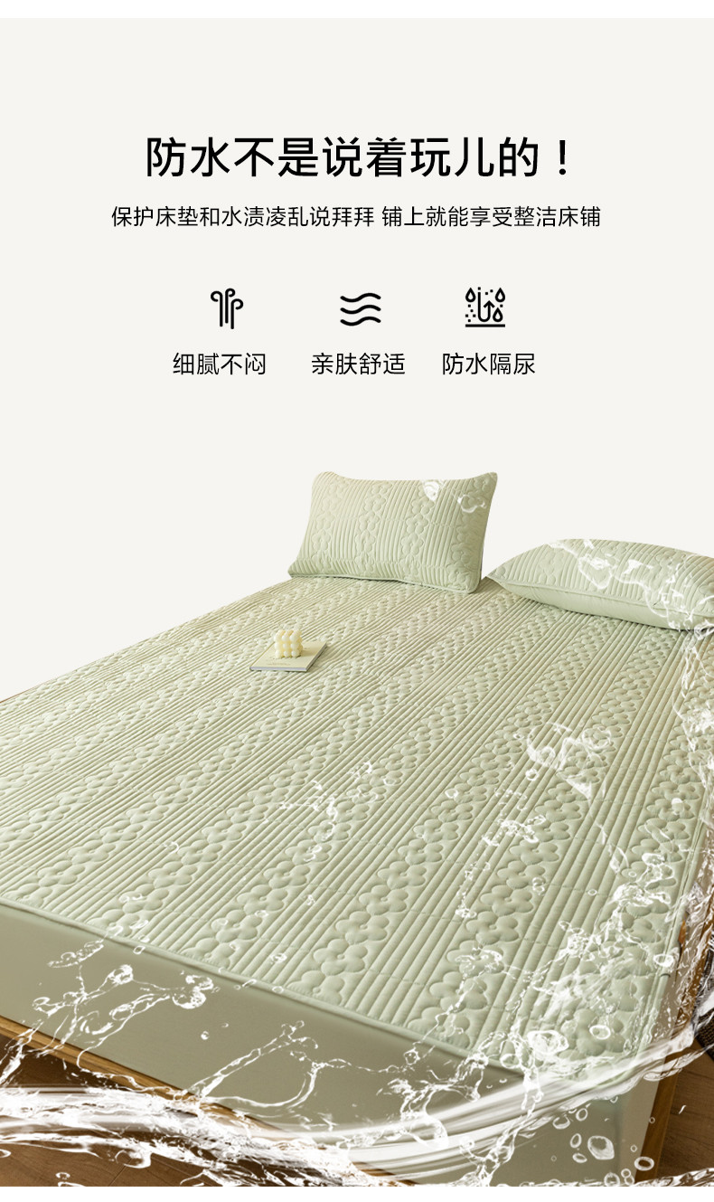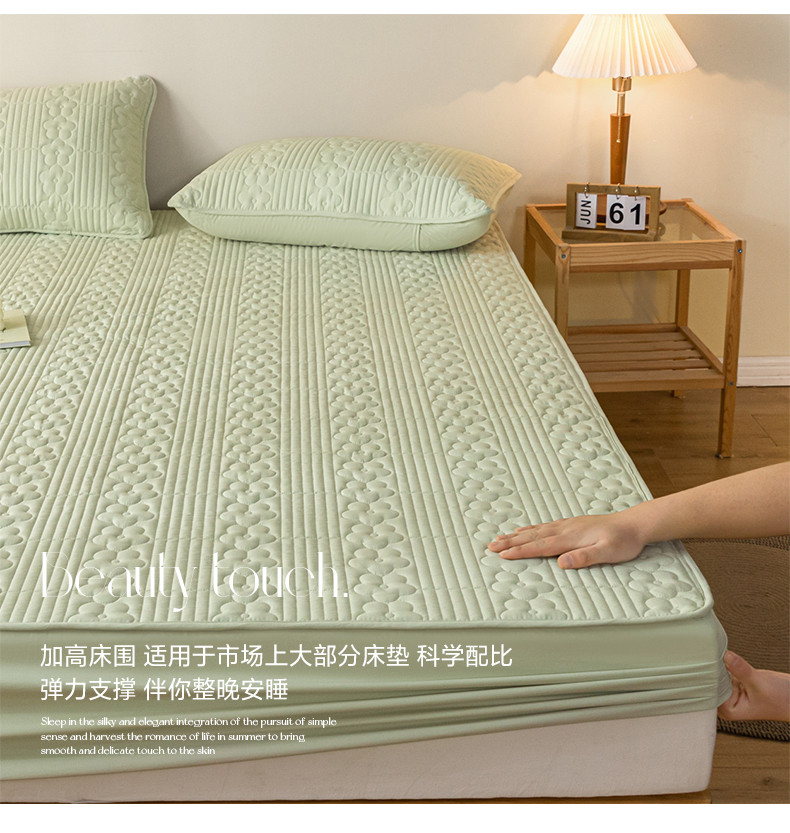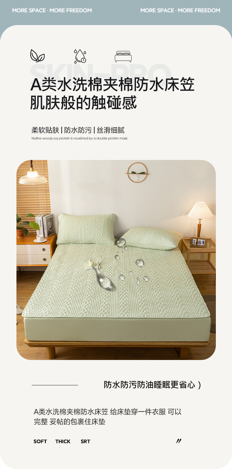 古吉梦2023新款 A类水洗棉夹棉防水床笠花朵系列三件套 花朵-茶绿