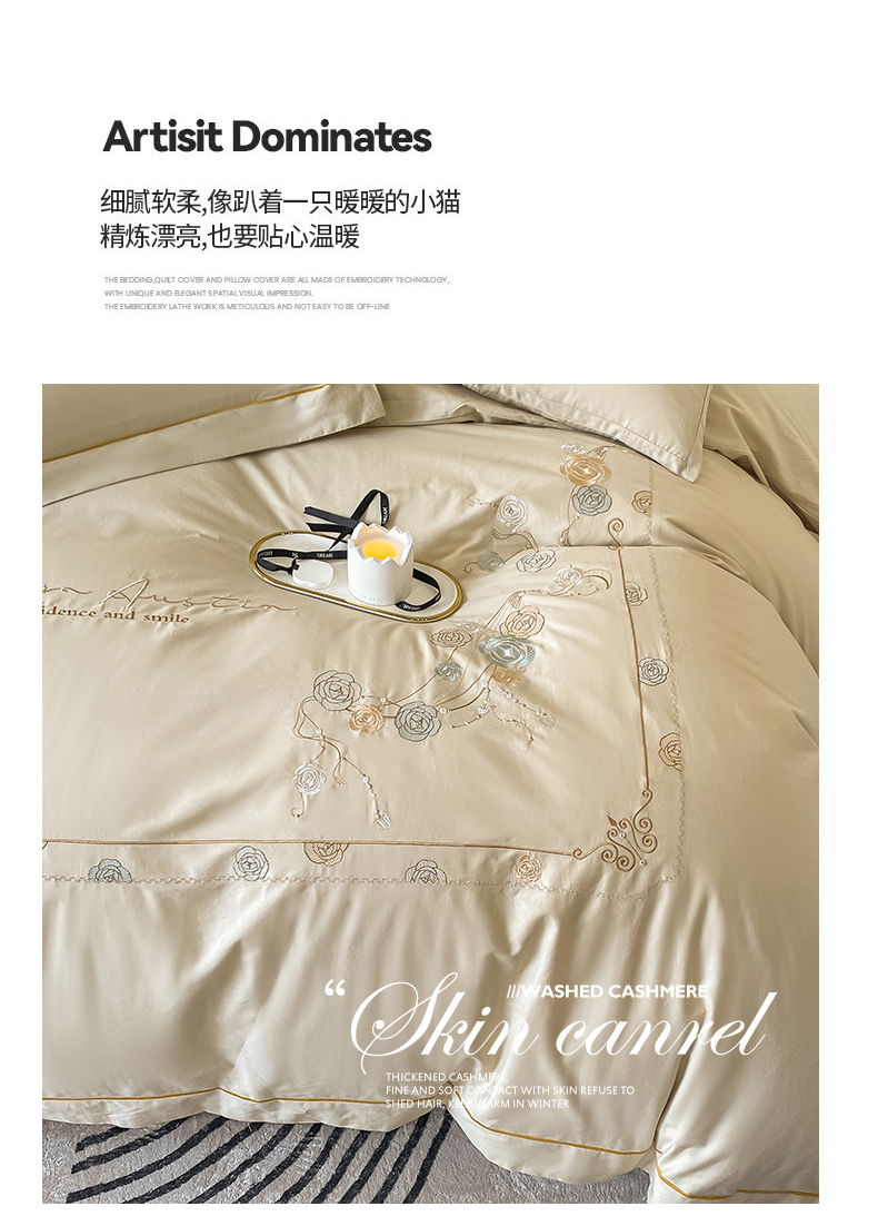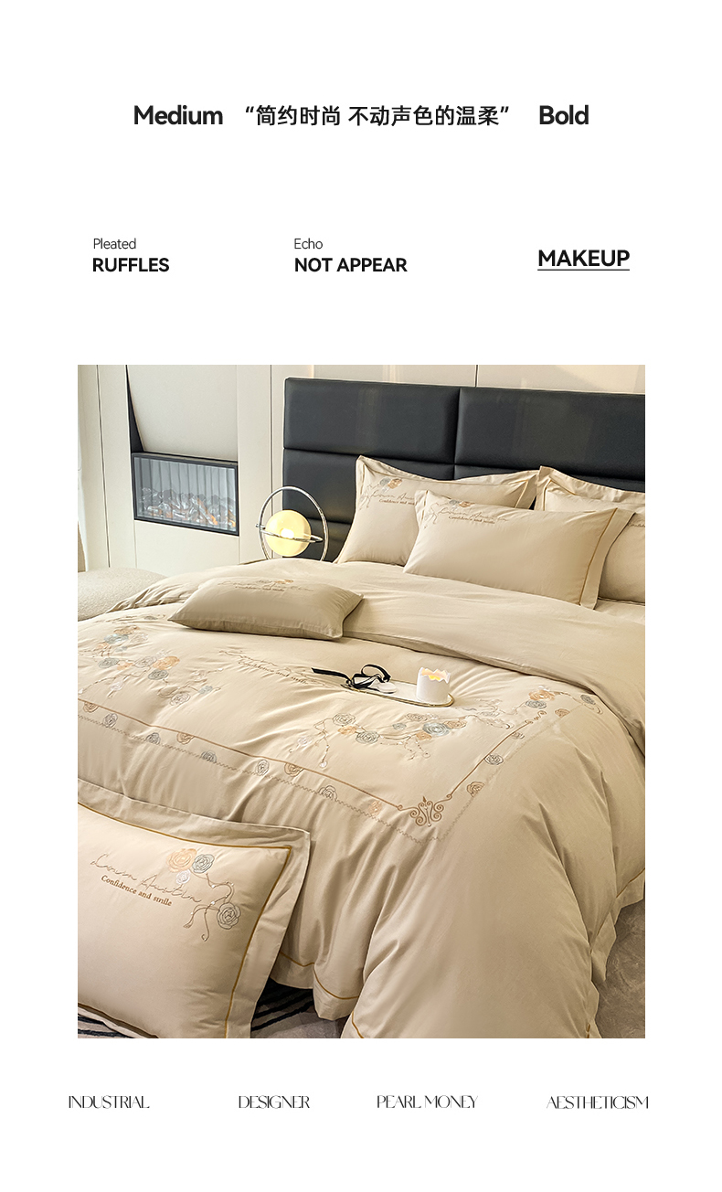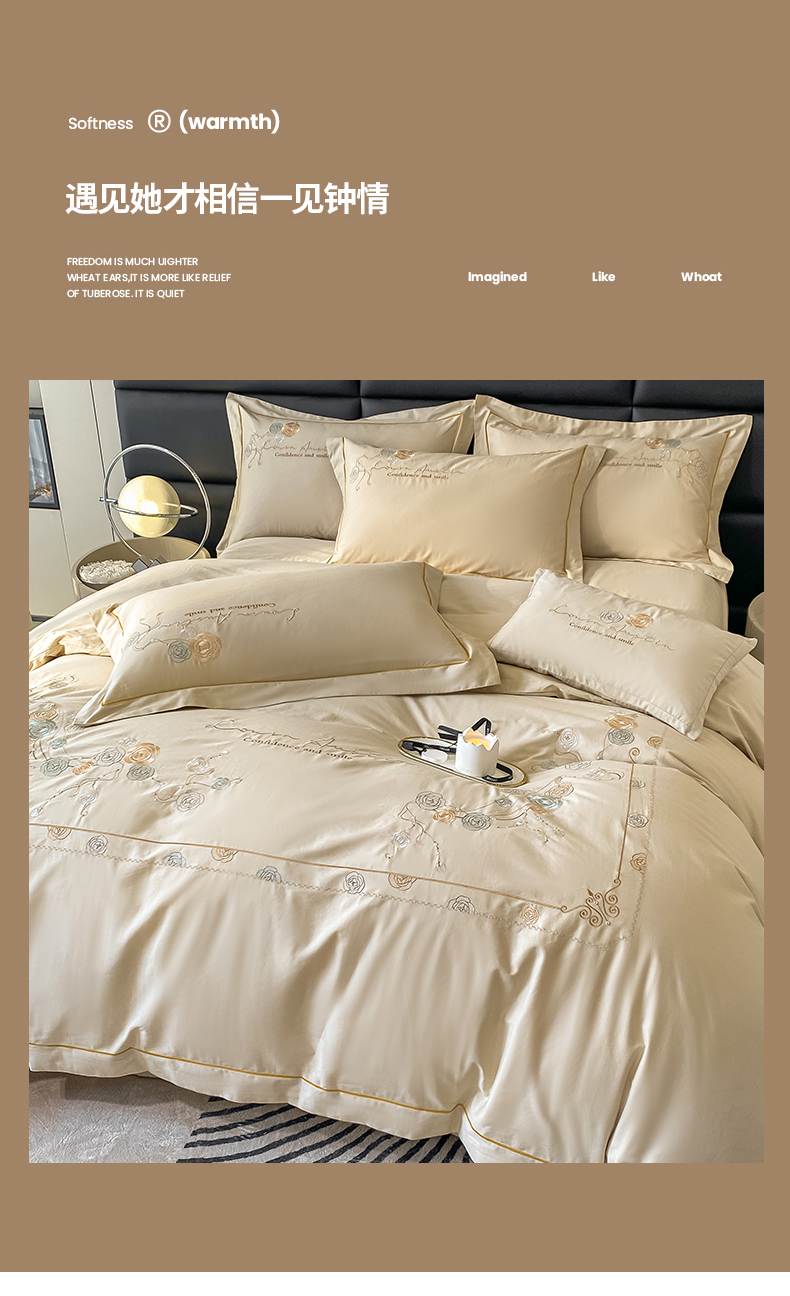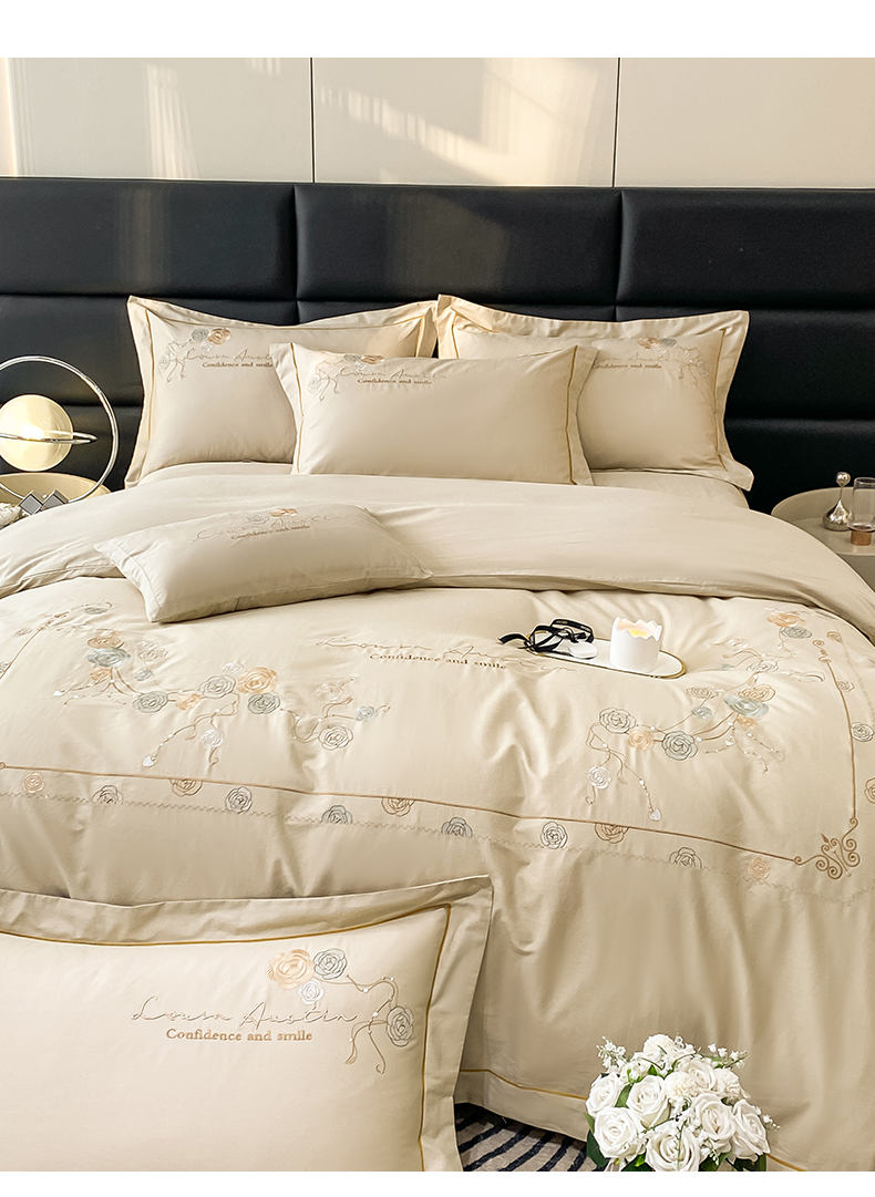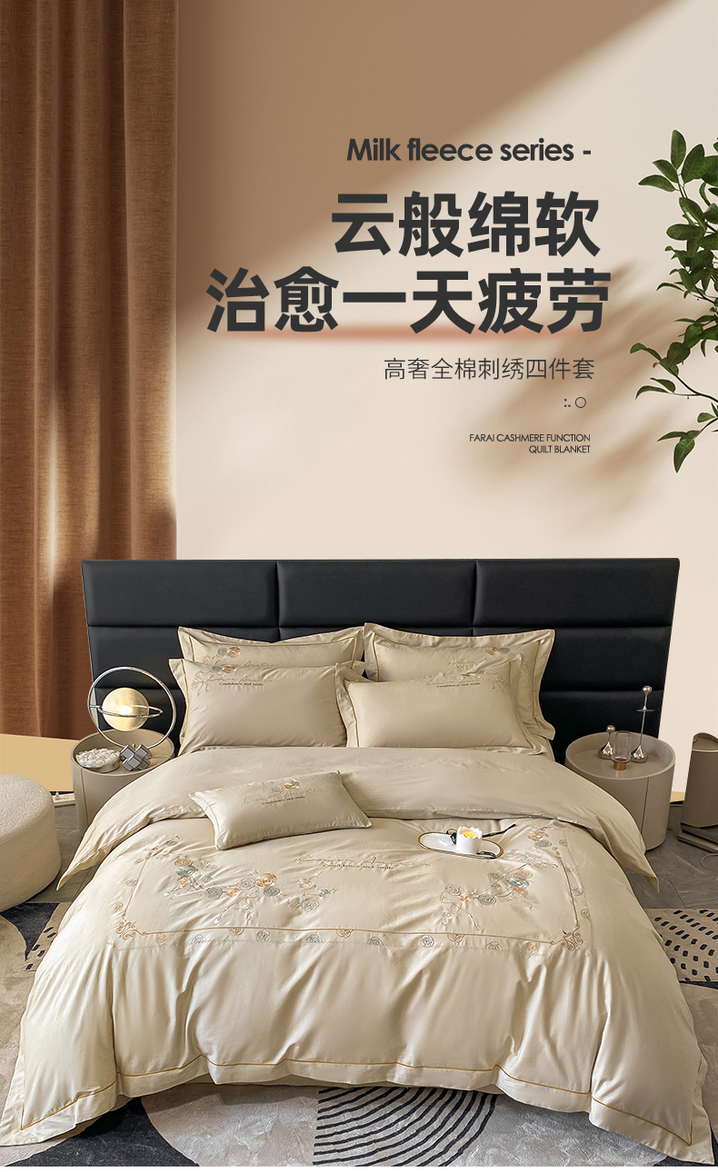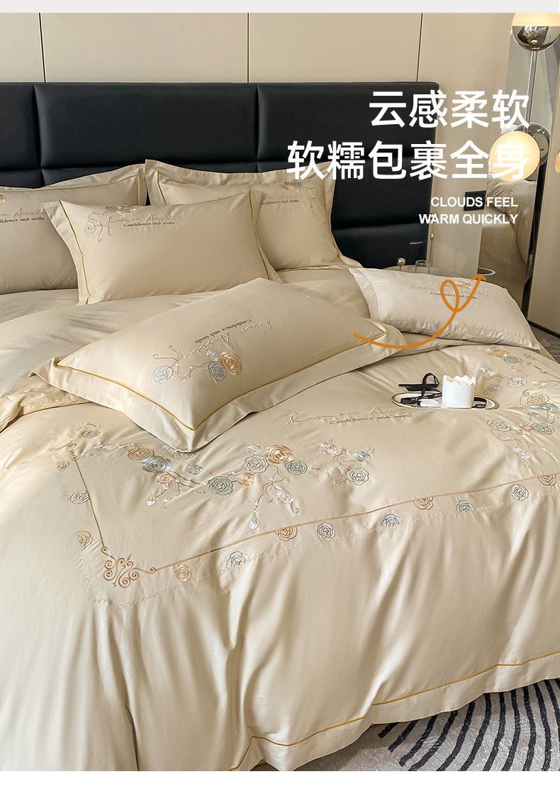 绒世界2024新款全棉刺绣烟雨系列四件套 一袭烟雨-香槟金