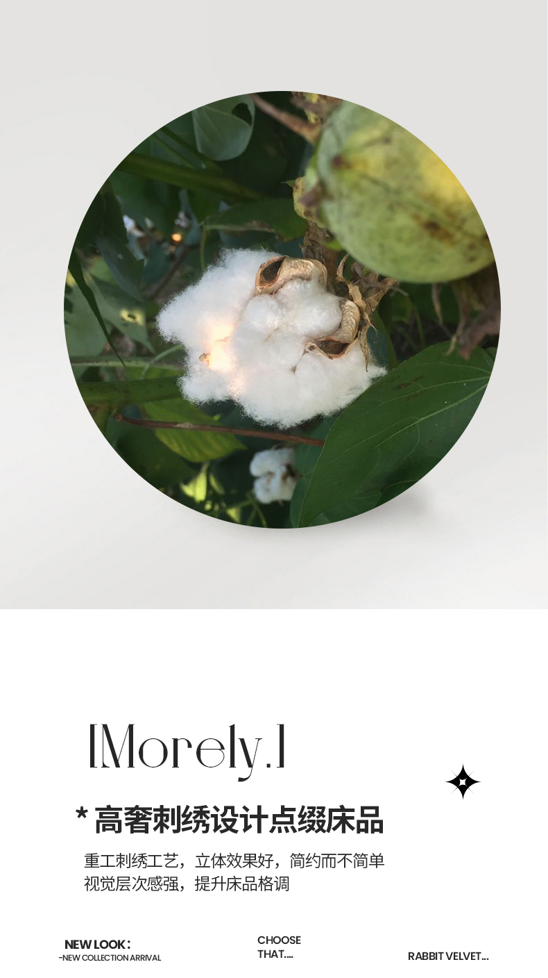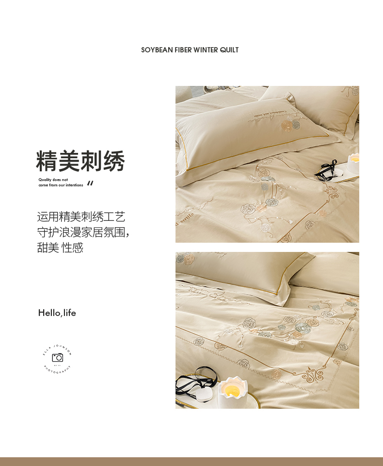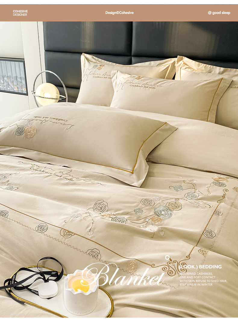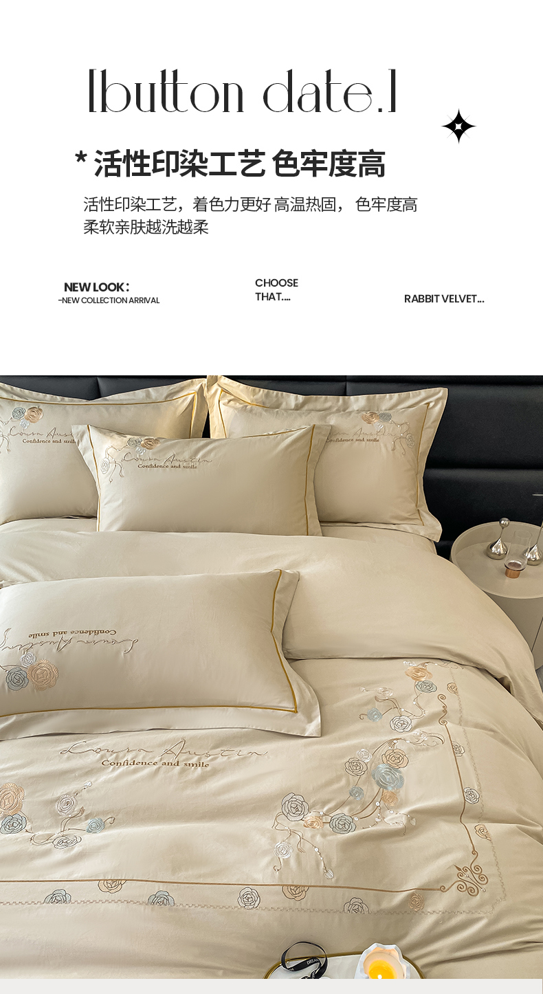商品名称:绒世界2024新款全棉刺绣烟雨系列四件套 一袭烟雨-香槟金