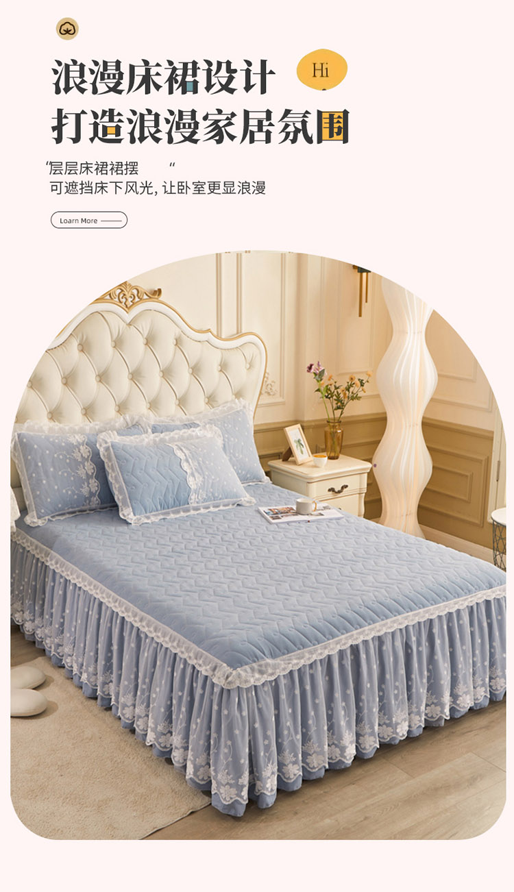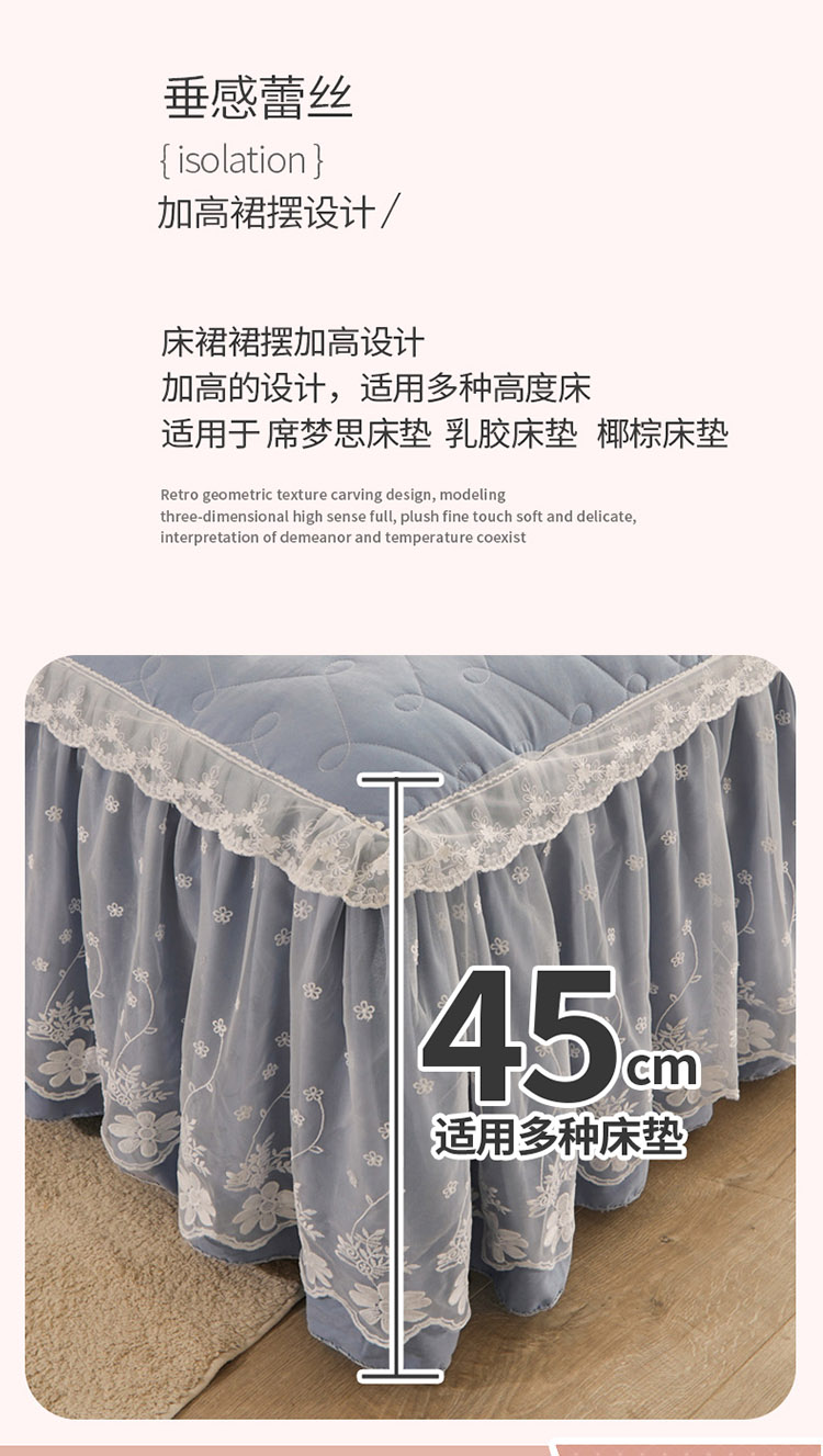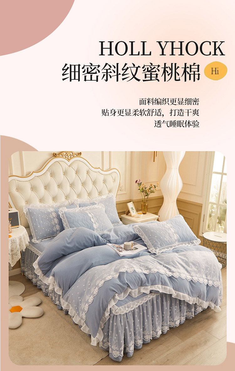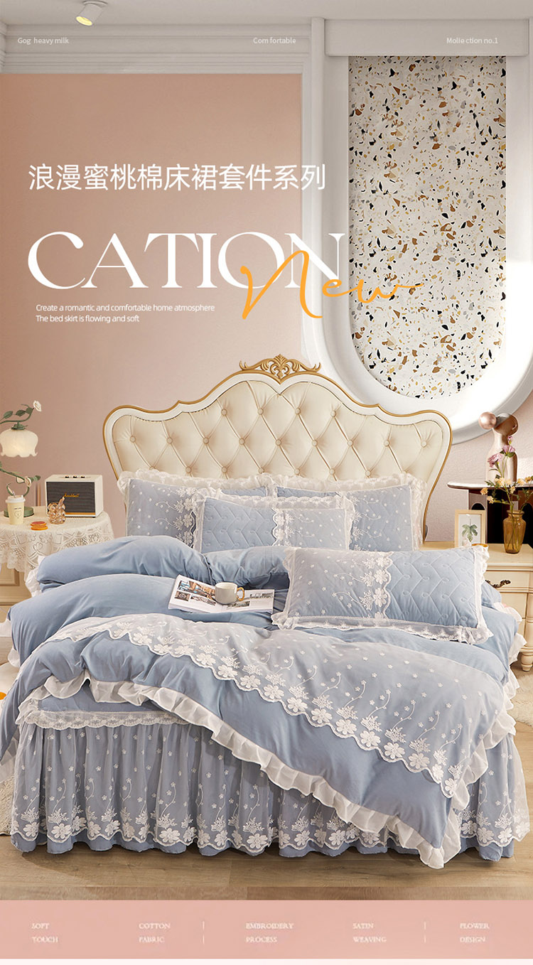 当前位置: 91家纺网 > 商品网购 > 床品套件 > 四件套 > 全棉普通四件套 > 恋尚 2023新款蜜桃棉夹棉床裙款四件套 花婷- 兰灰
