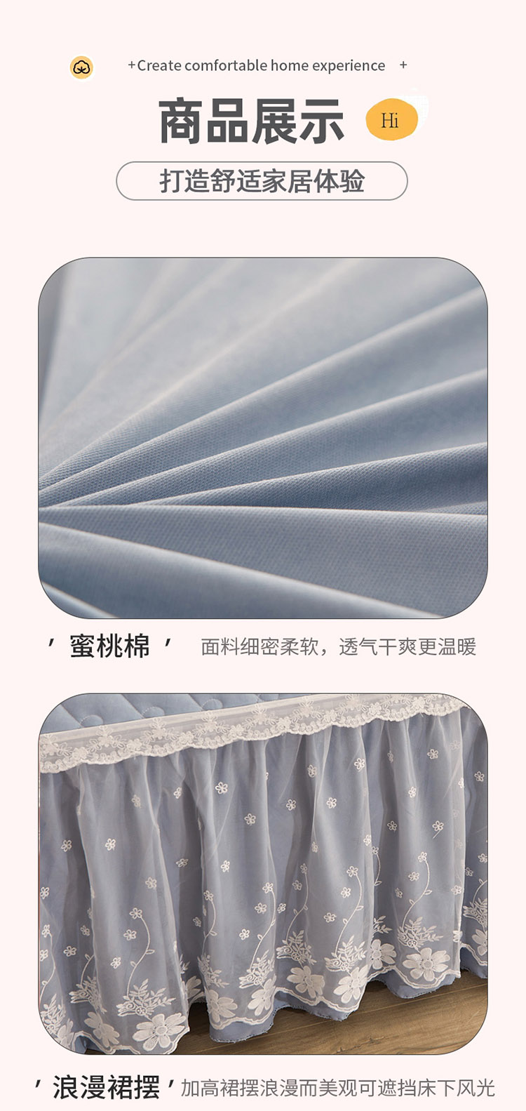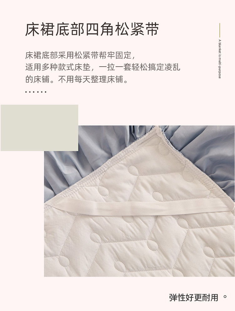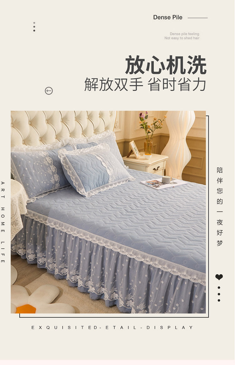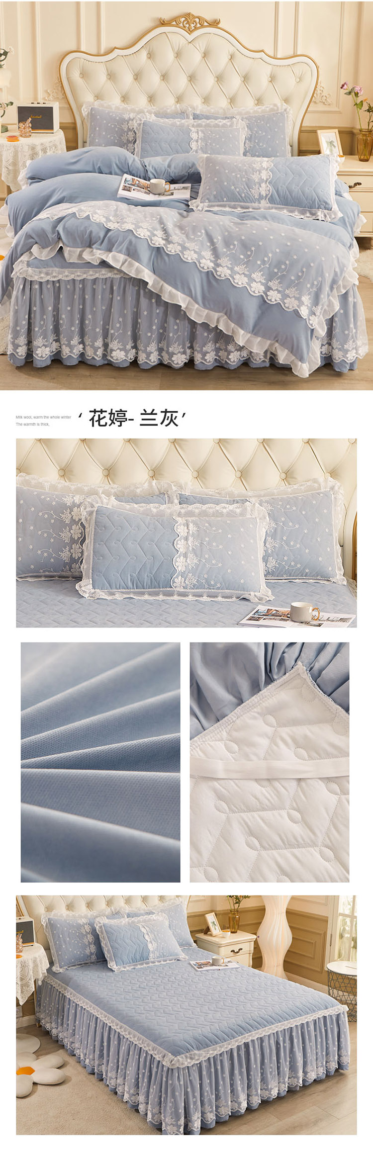 当前位置: 91家纺网 > 商品网购 > 床品套件 > 四件套 > 全棉普通四件套 > 恋尚 2023新款蜜桃棉夹棉床裙款四件套 花婷- 兰灰