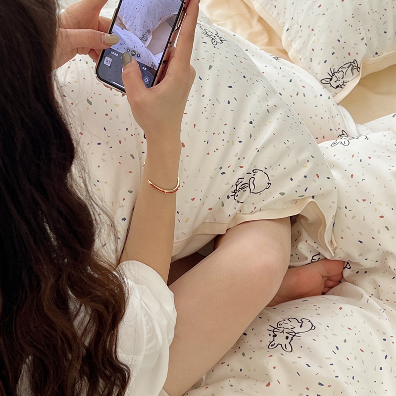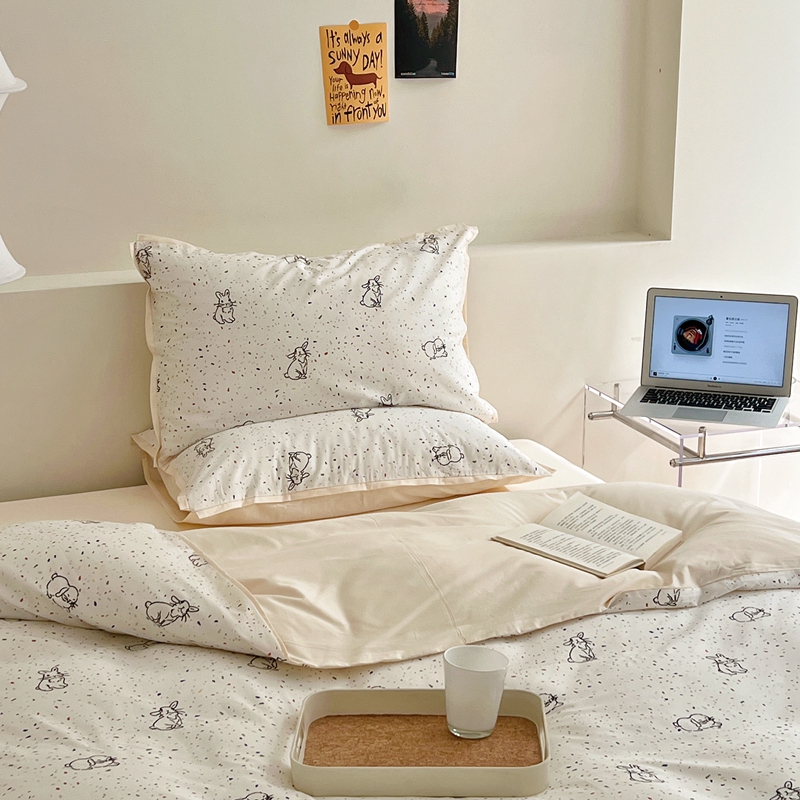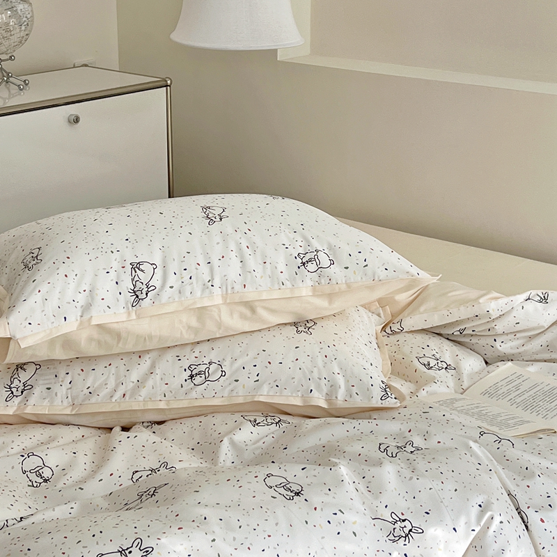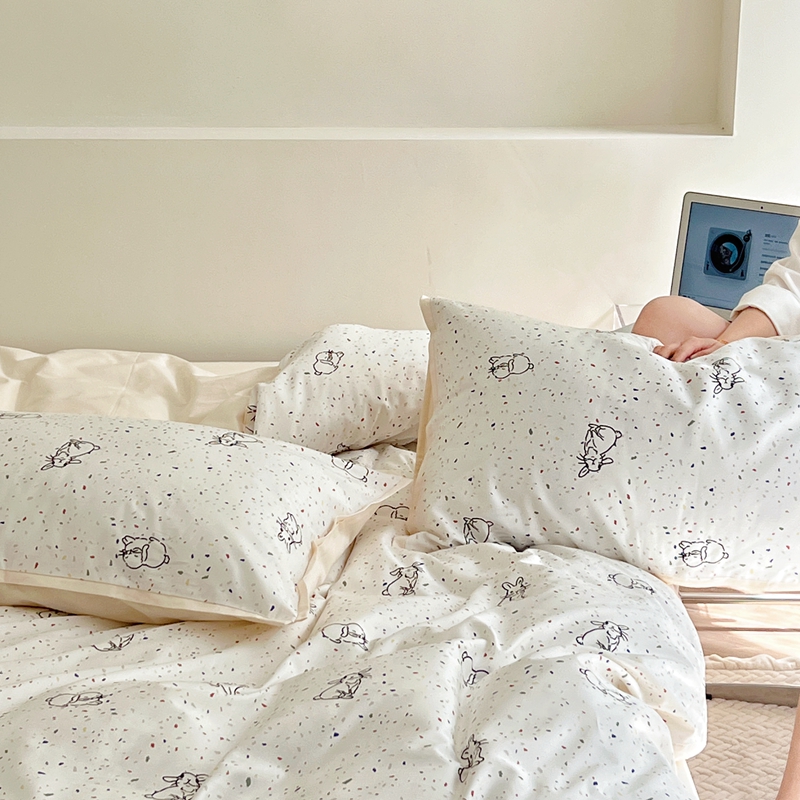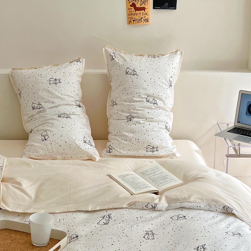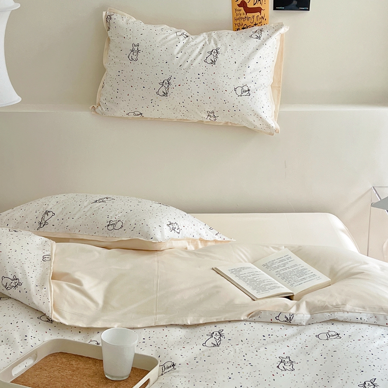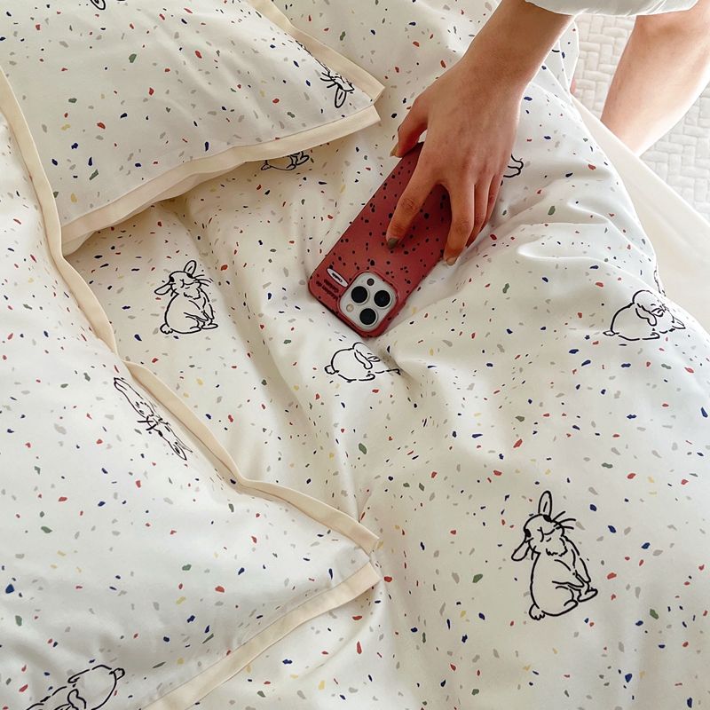当前位置: 91家纺网 > 商品网购 > 床品套件 > 四件套 > 全棉普通四件套 > 蕊姿 50sA类数码印花四件套 彩点小兔 米色