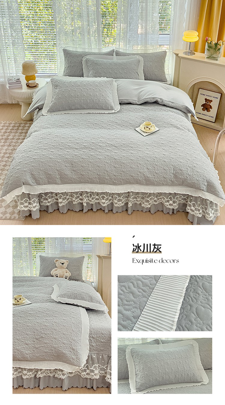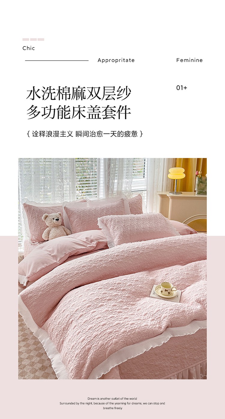 (总)2025水洗棉麻双层纱纯色多功能蕾丝床盖四件套 夹棉被套夏被两用套件直播爆款, 公主粉,抹茶绿,浪漫紫, 天空蓝, 冰川灰