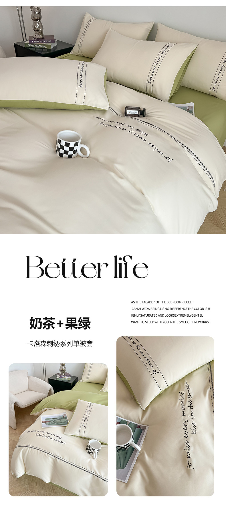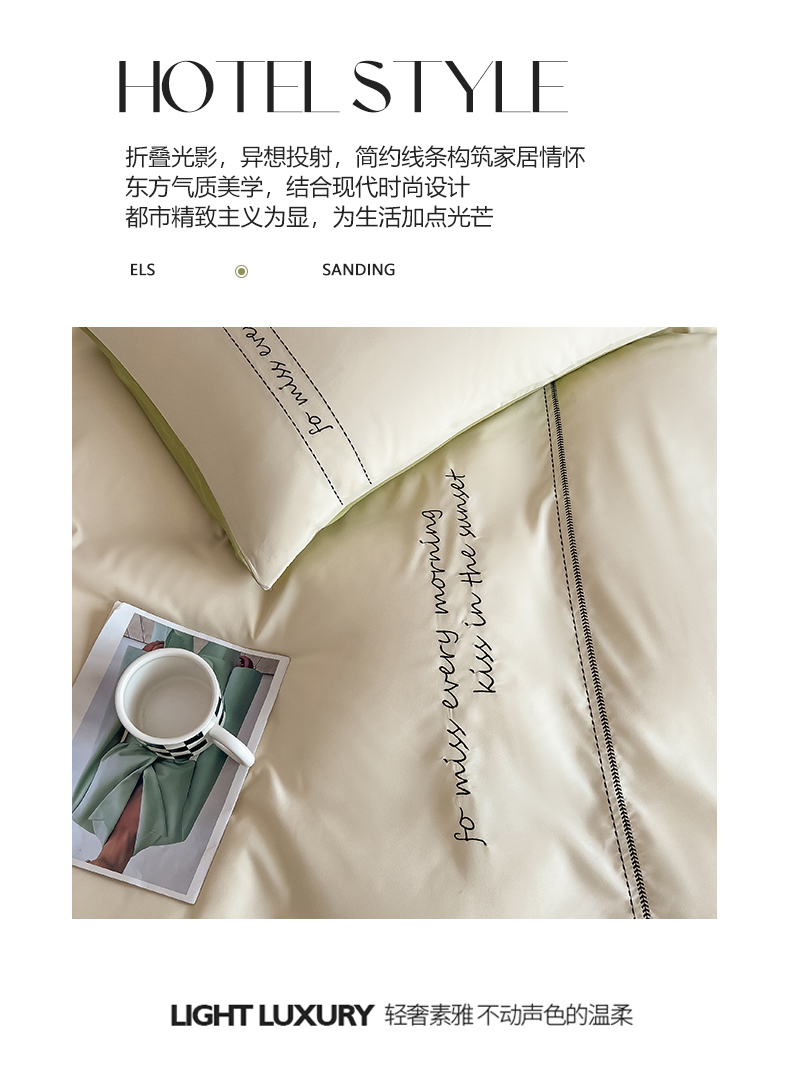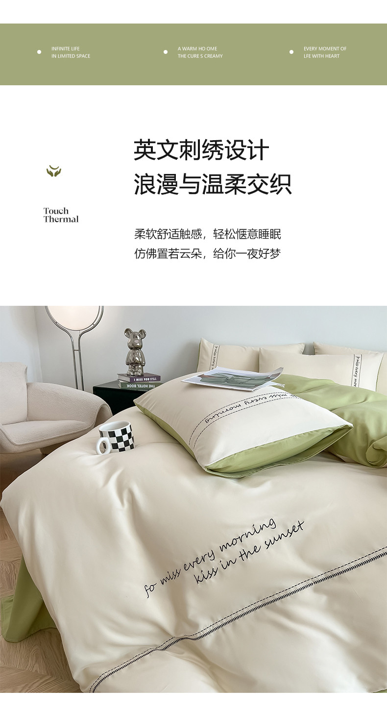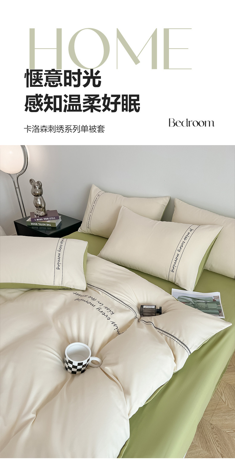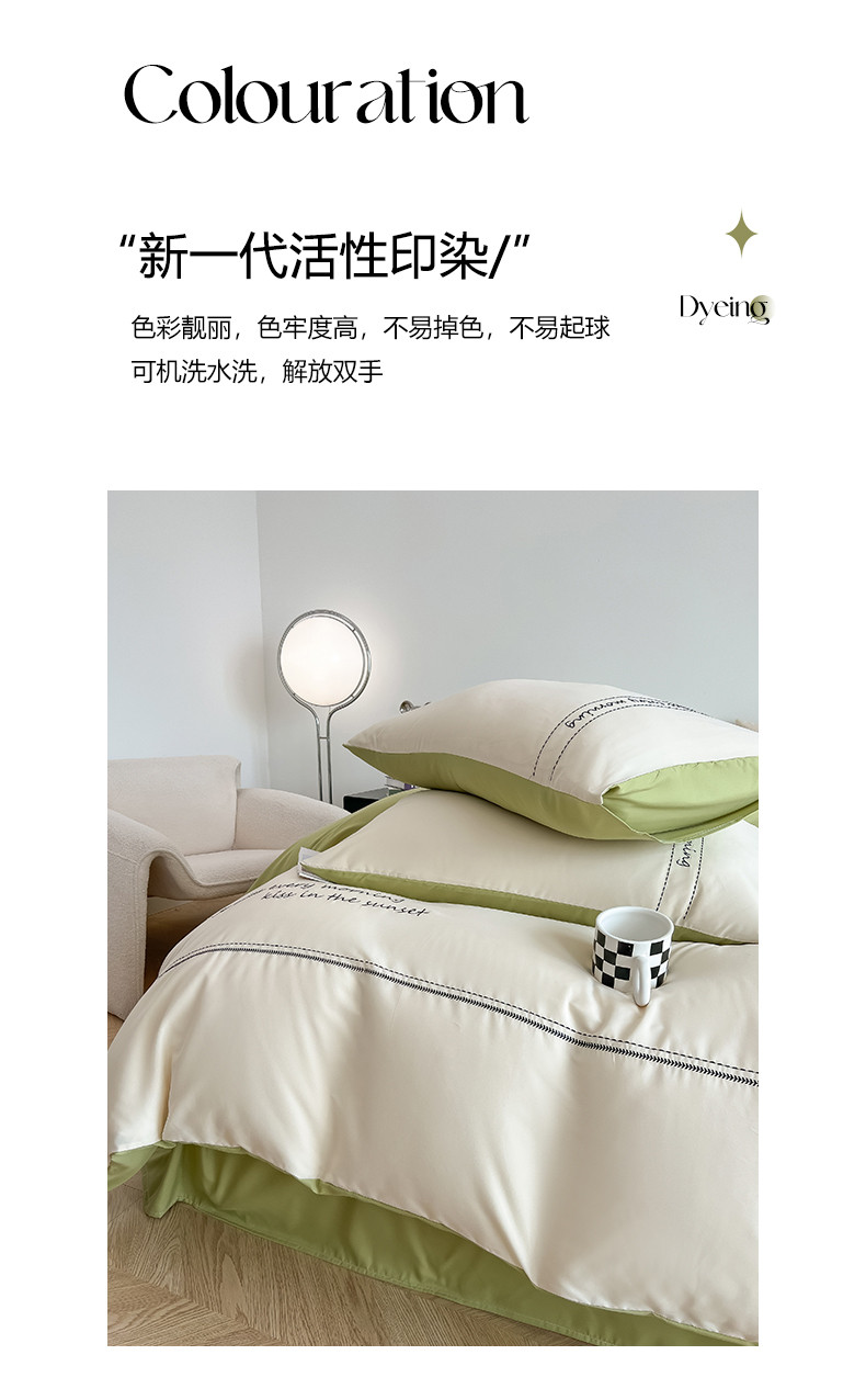 当前位置: 91家纺网 > 商品网购 > 床上用品 > 被套 > 尤米 2023新款磨毛刺绣纯色双拼卡洛森系列--单被套 奶茶+果绿