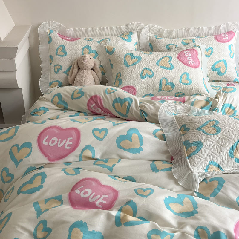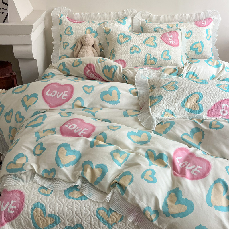 添越 2024小清新韩版蕾丝款花边纯棉夹棉床盖三件套全棉爱心熊-蕾丝款,爱心熊-蕾丝款