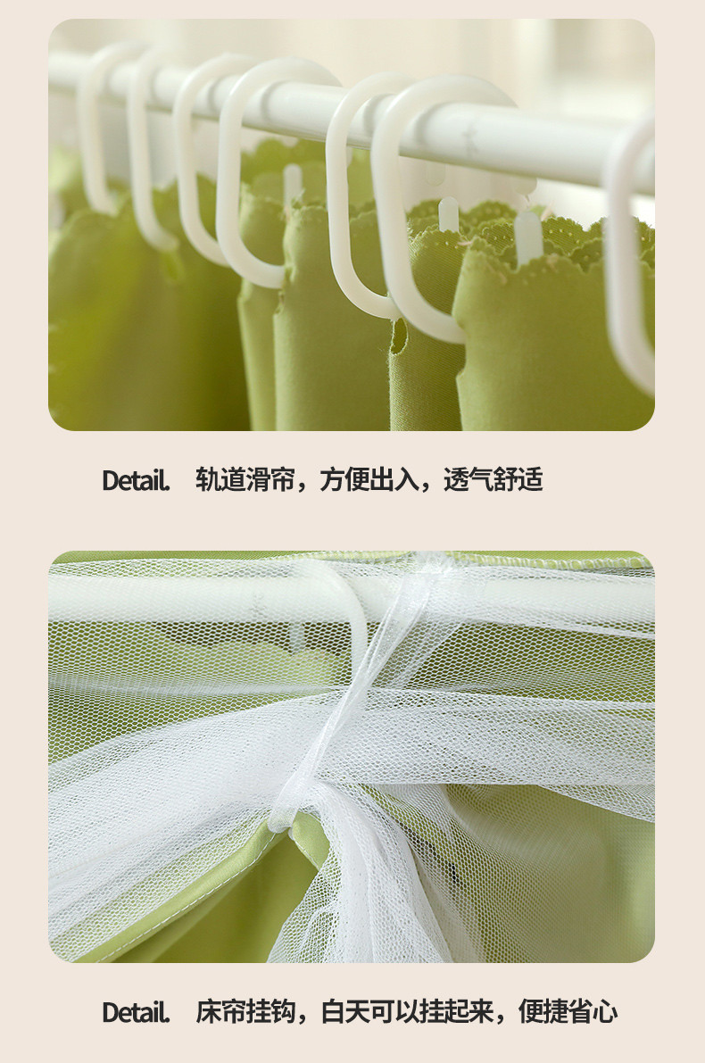 • 91家纺网 家纺一手货源 找家纺 (总)夏彩 2025新款蕾丝U型防摔坐床蚊帐-88630,绿雅灰,藕玉色,香槟色