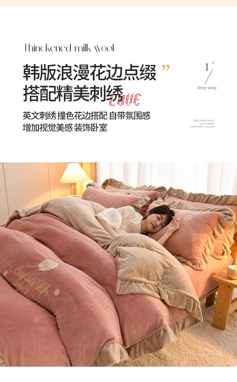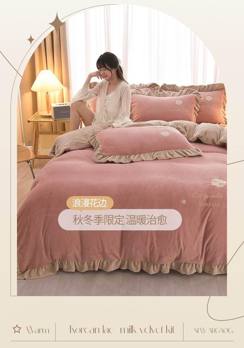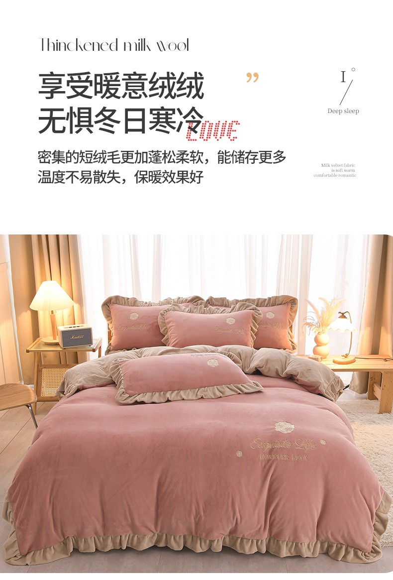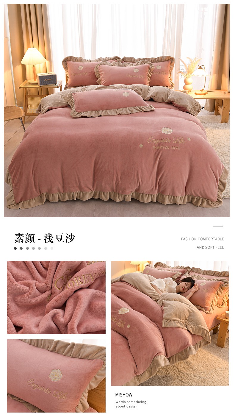 商品名称:湘雪家居 2025新款纯色双层花边牛奶绒四件套 素颜-浅豆沙