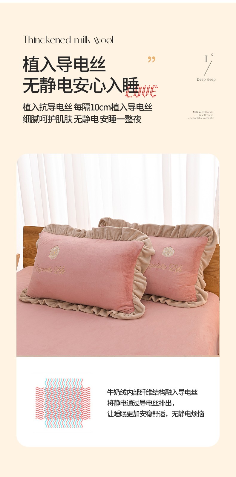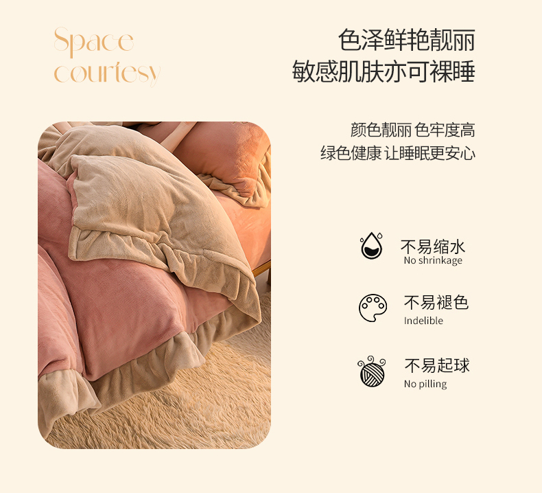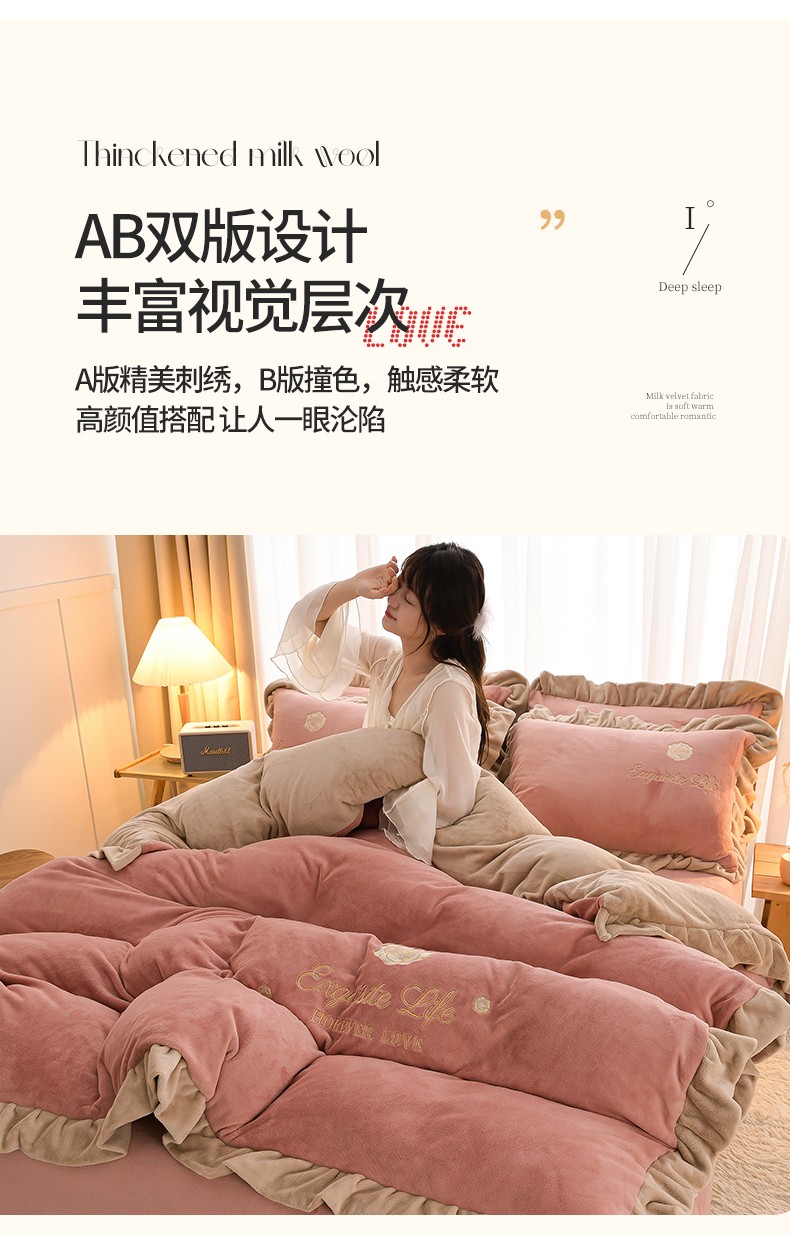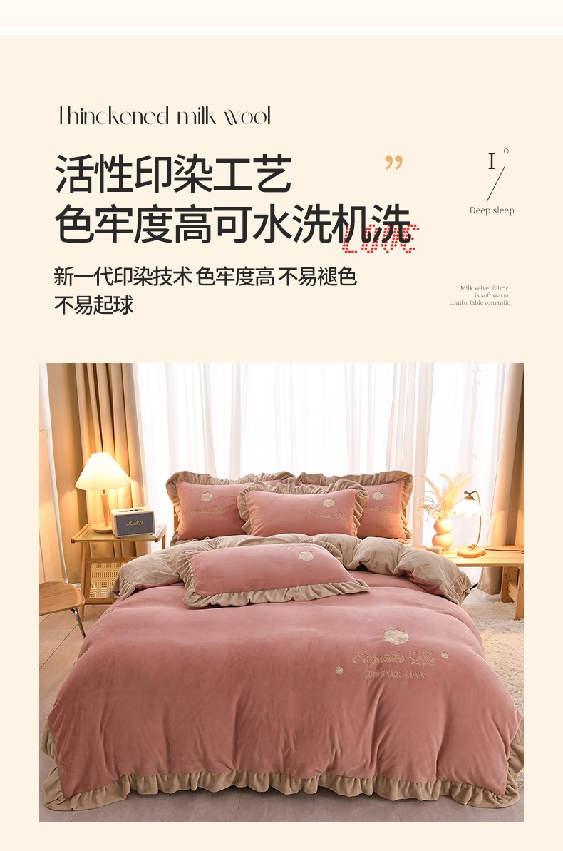 商品名称:湘雪家居 2025新款纯色双层花边牛奶绒四件套 素颜-浅豆沙