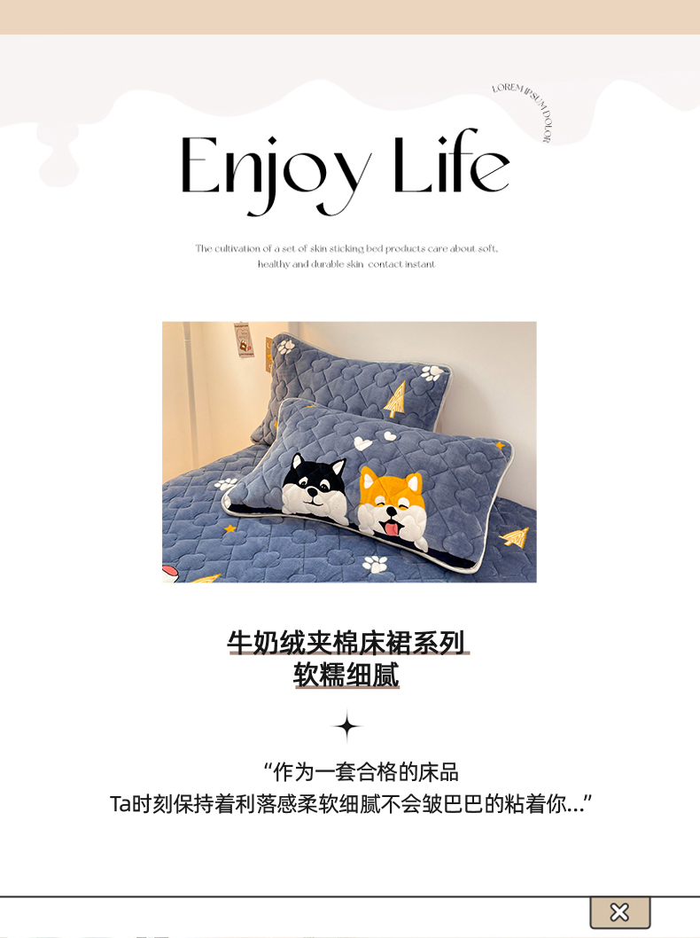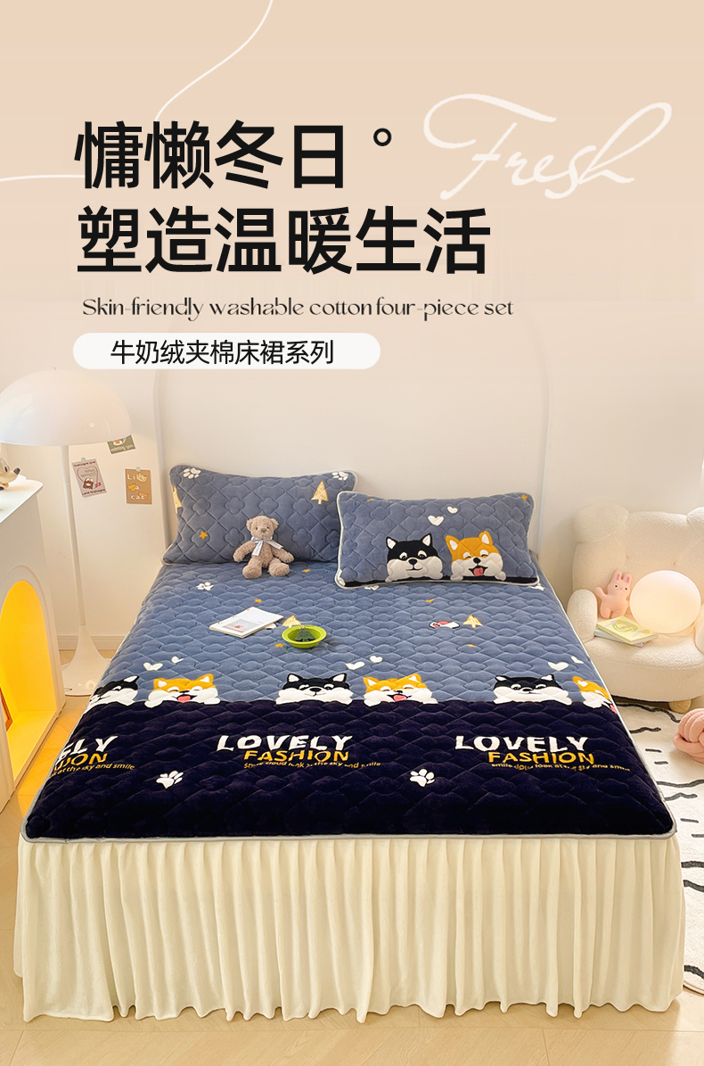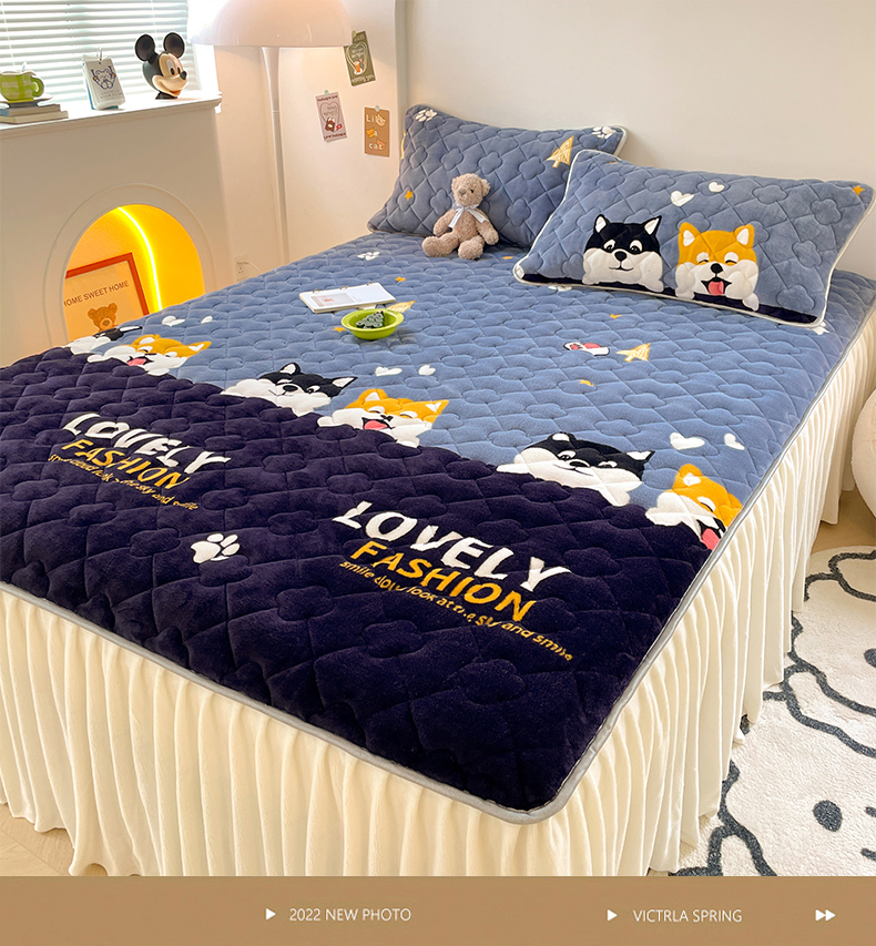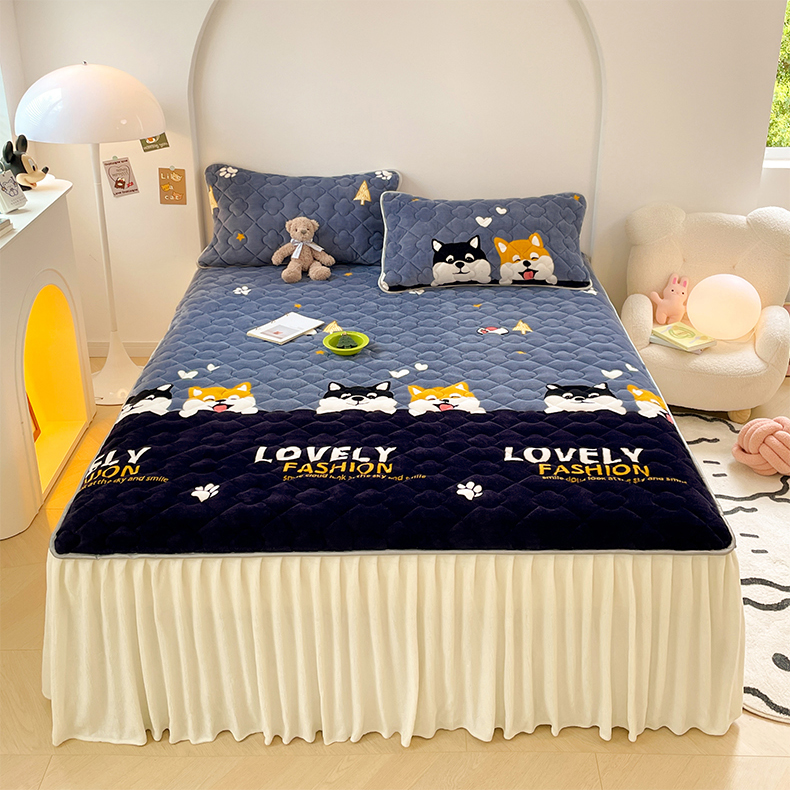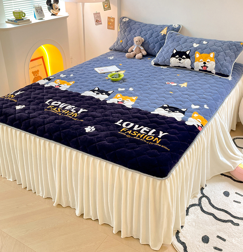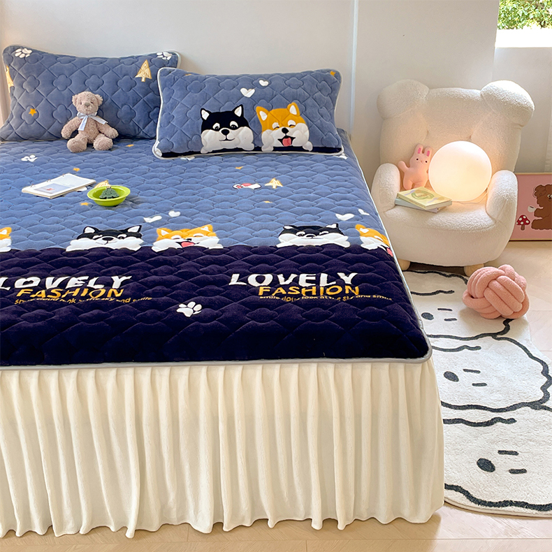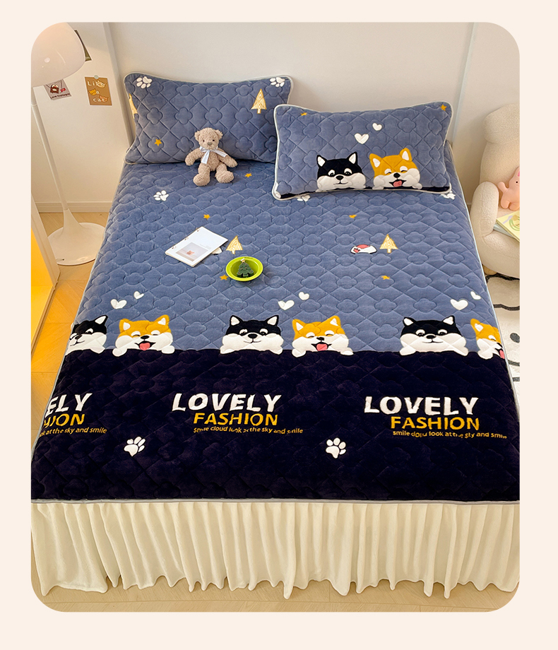 梦舒羽 牛奶绒夹棉床裙床罩床单床盖床护垫套三件套 可爱狗狗