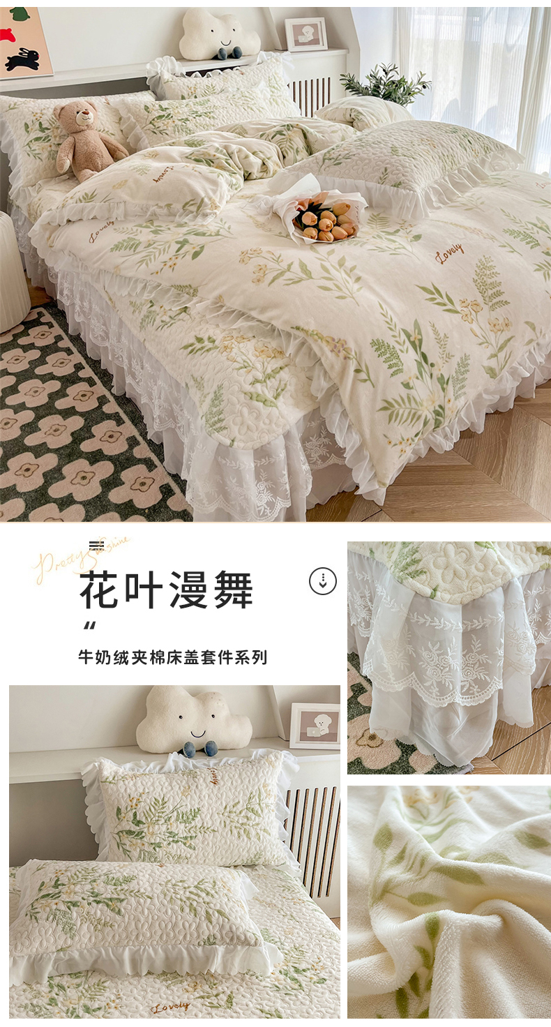商品名称:添越 2024新款牛奶绒夹棉床盖三件套四件套 花叶漫舞