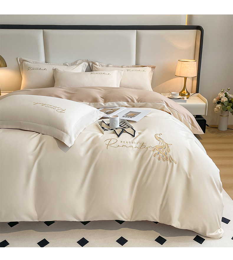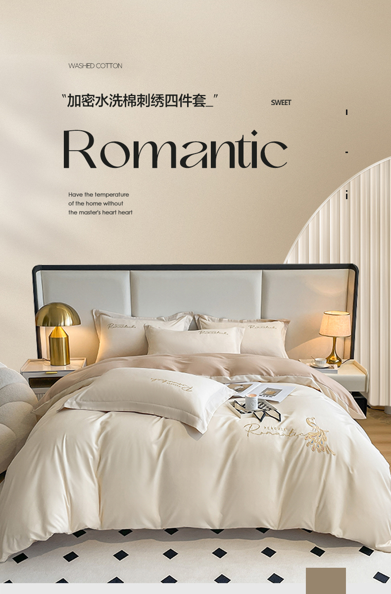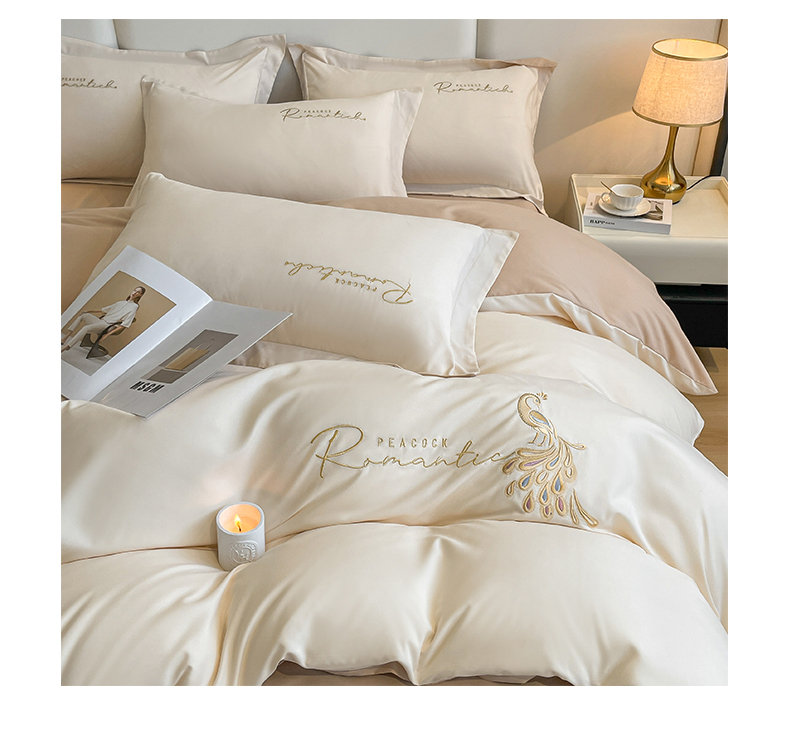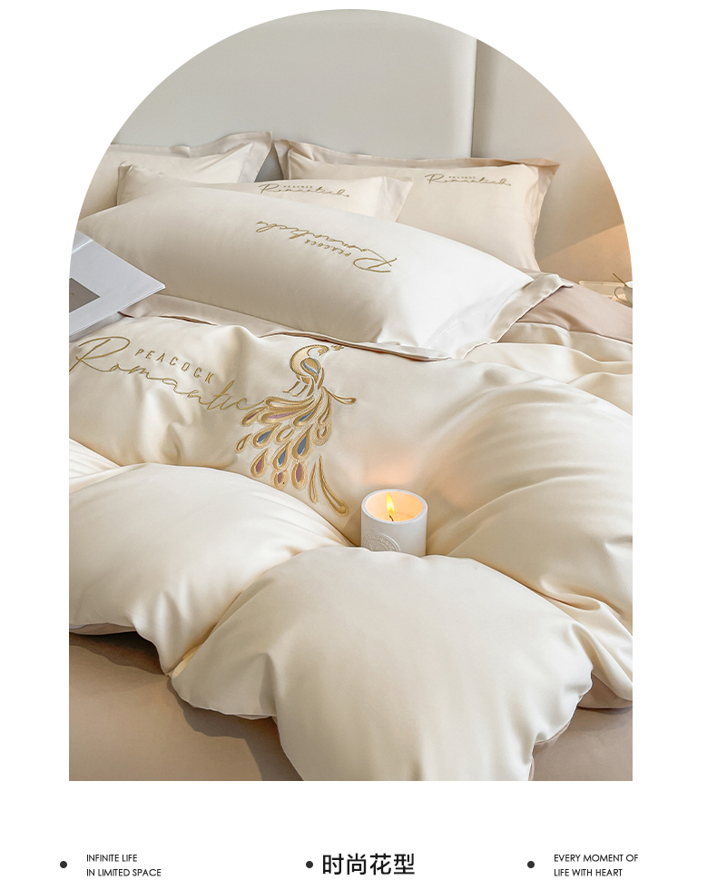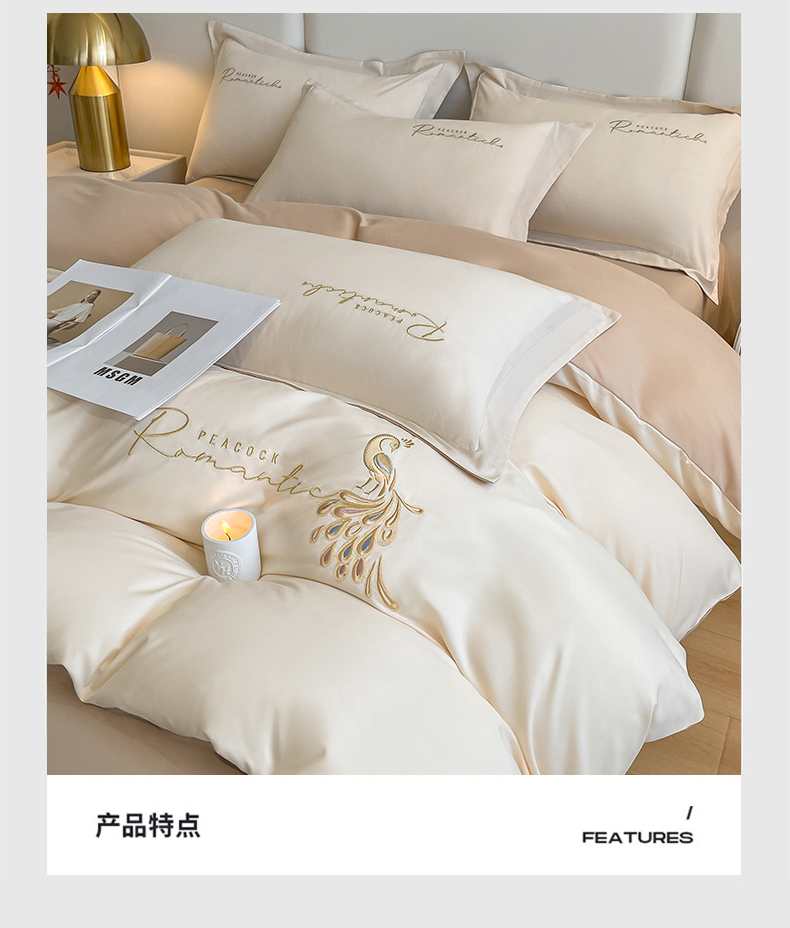 商品名称:花愿(原花纪) 2023新款加密水洗棉刺绣四件套-蓝孔雀 奶昔白+奶茶