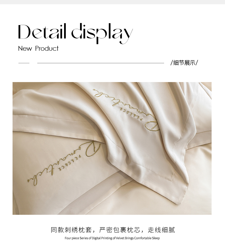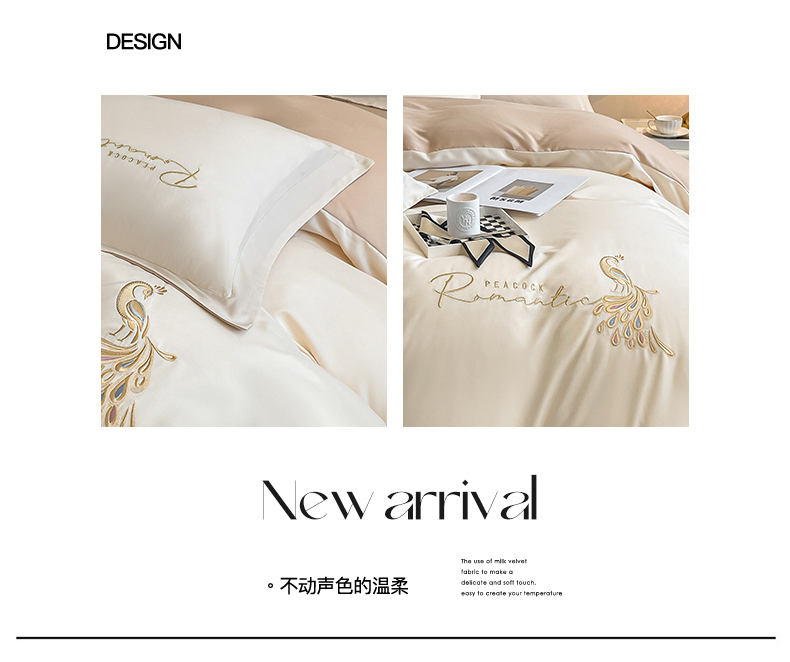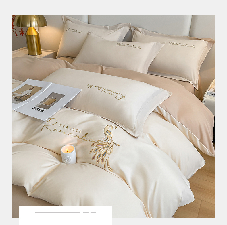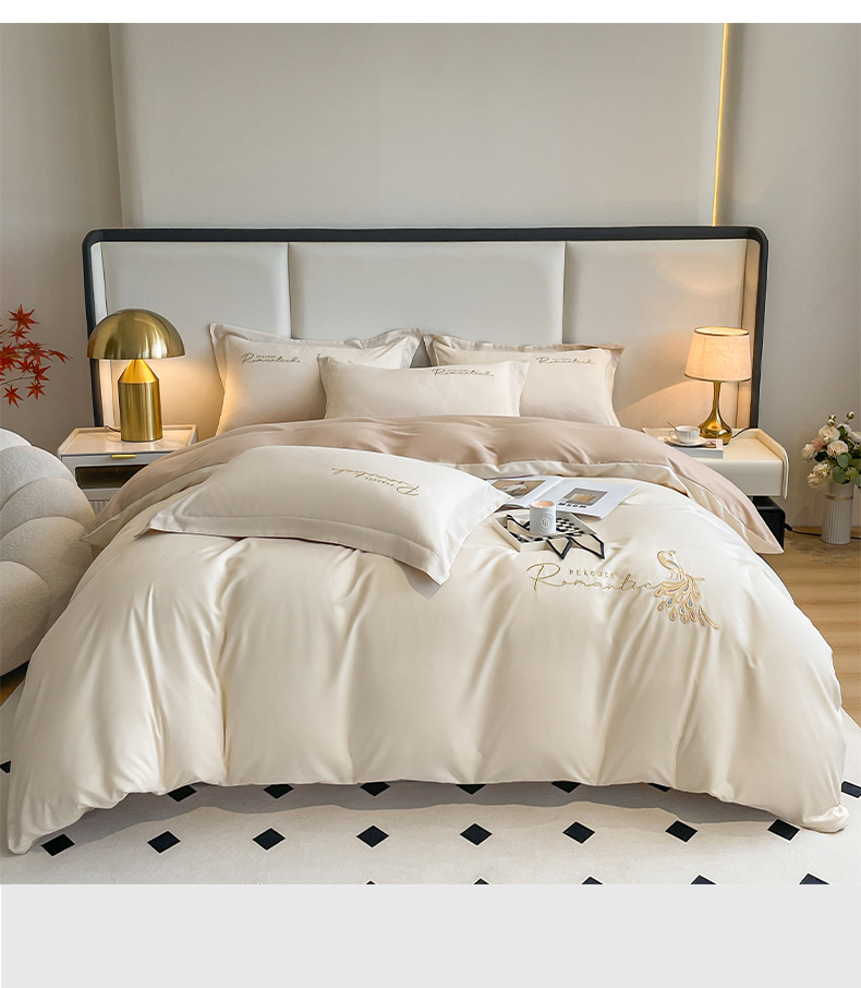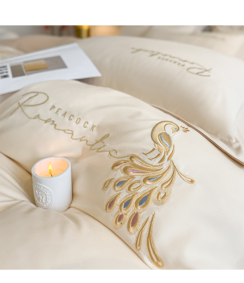 商品名称:花愿(原花纪) 2023新款加密水洗棉刺绣四件套-蓝孔雀 奶昔白+奶茶