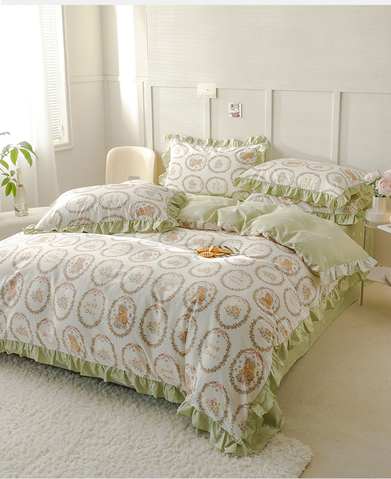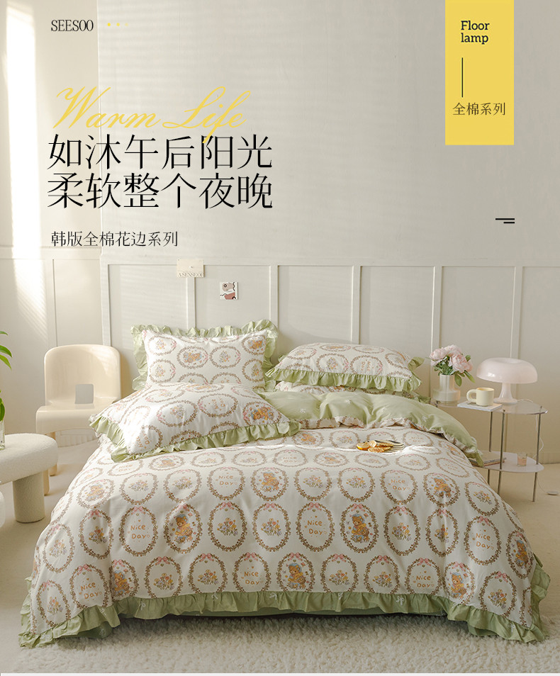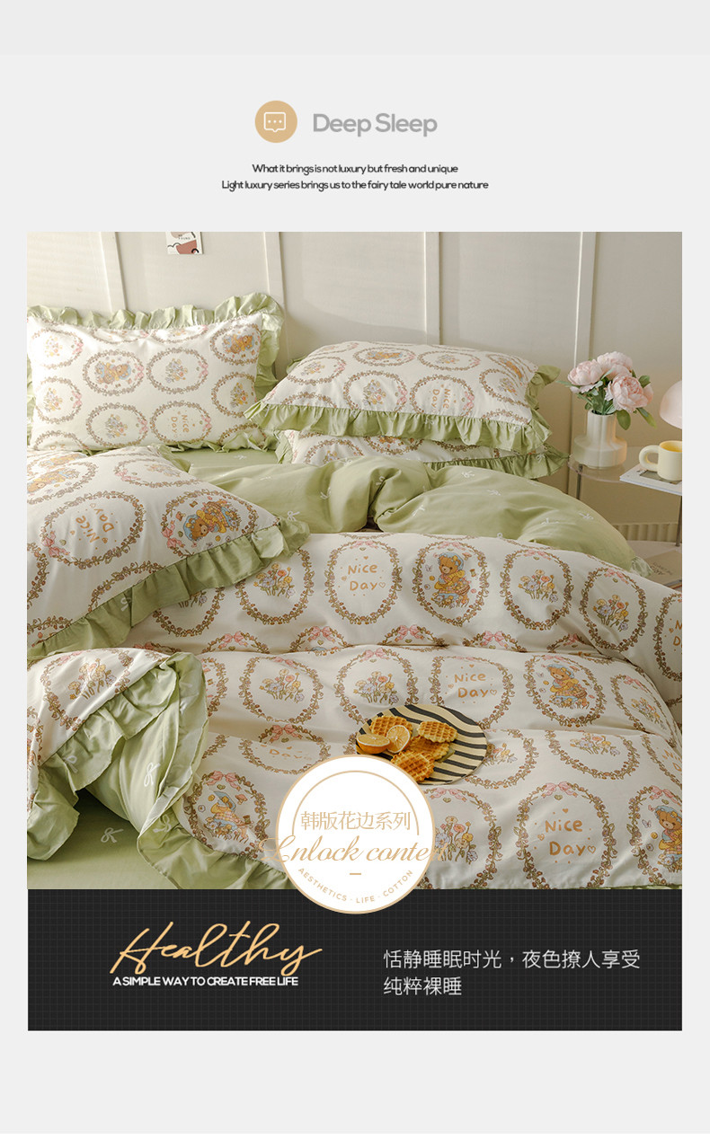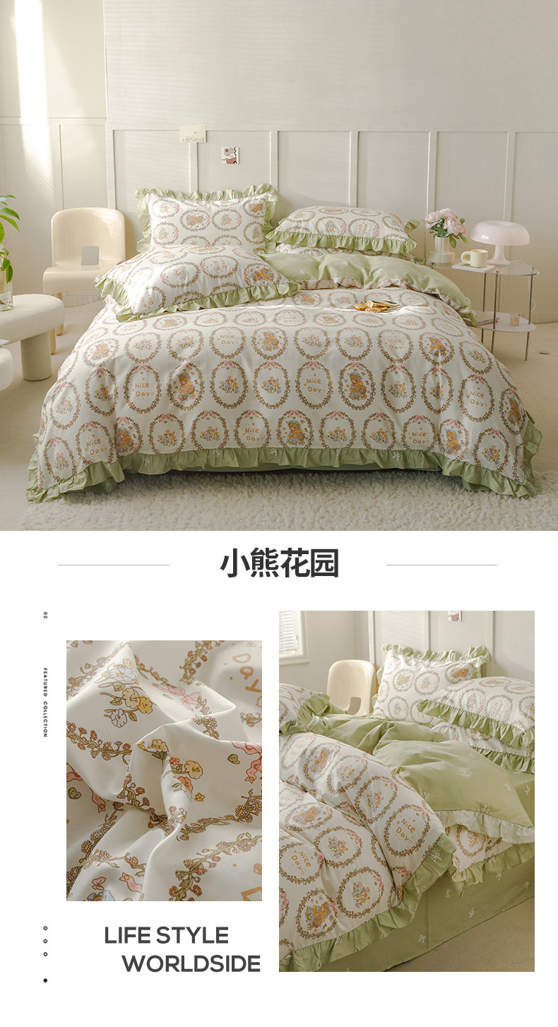 忆生活 2023新款韩版全棉花边印花四件套直播 花边款小熊花园