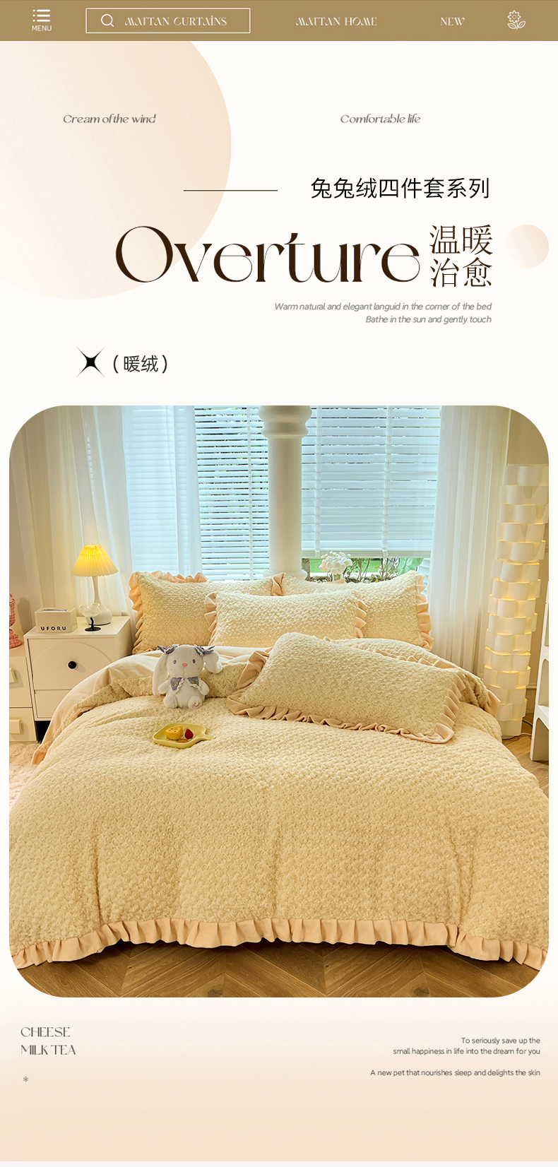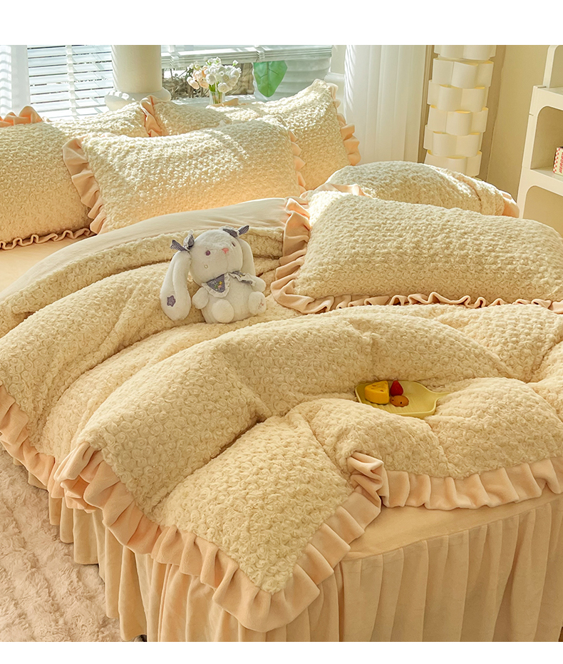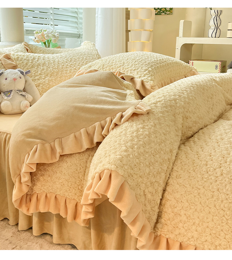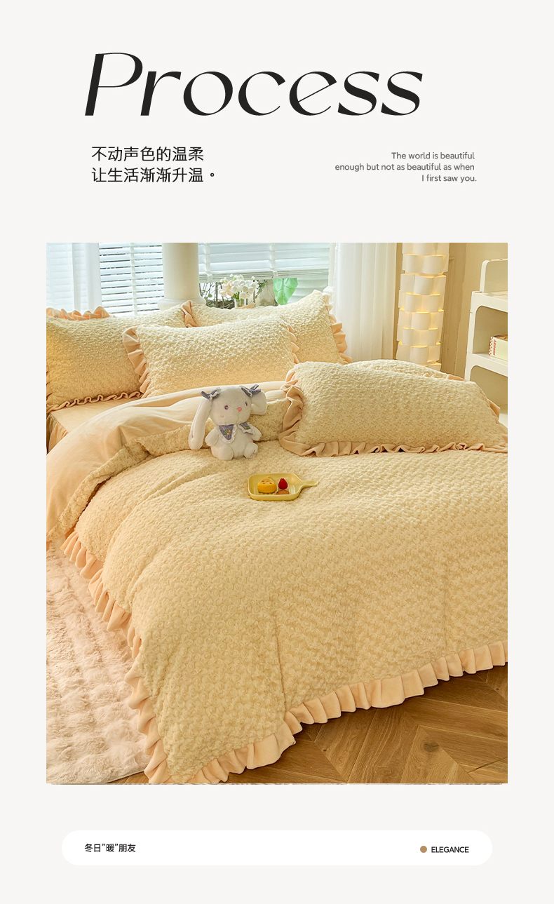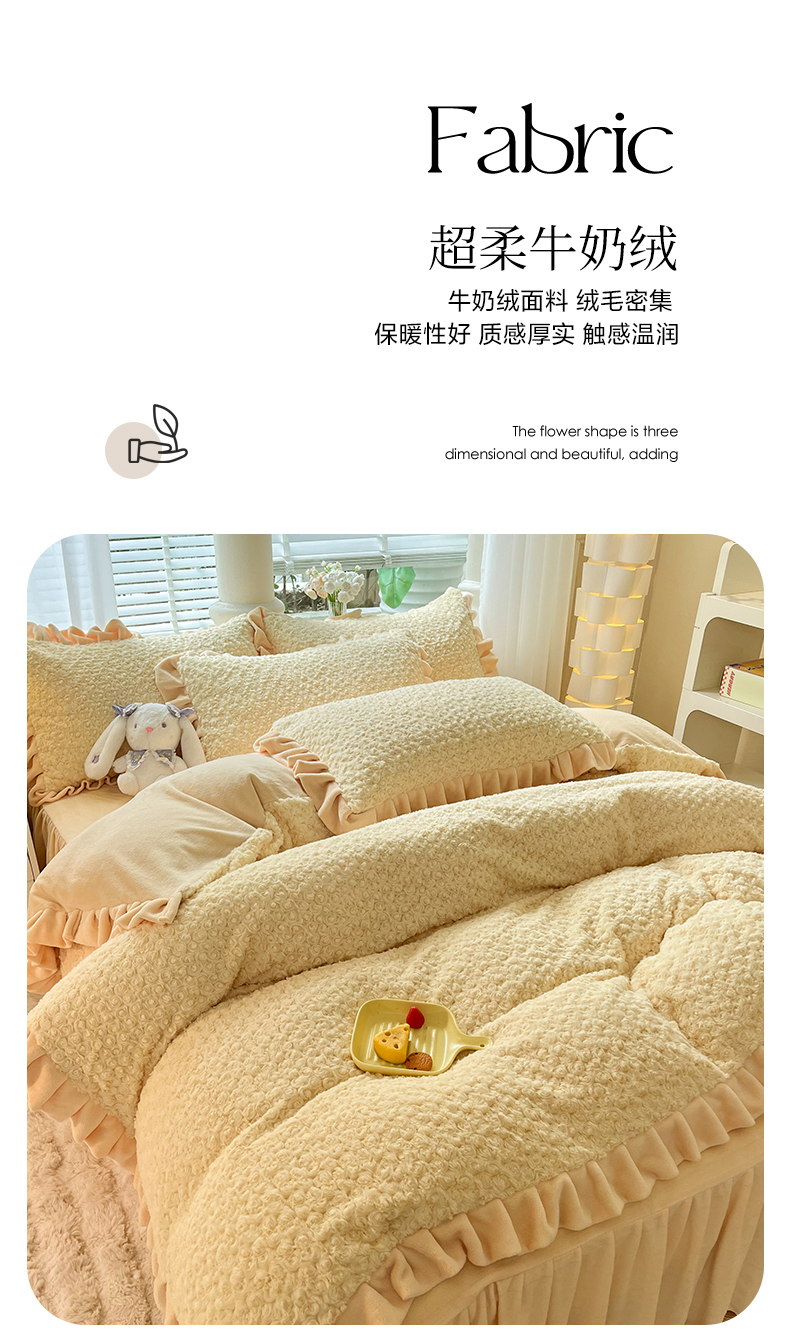 当前位置: 91家纺网 > 商品网购 > 床品套件 > 四件套 > 兔毛绒四件套 > 韩约家纺 2023新款1母婴级兔兔绒牛奶绒韩版四件套-床裙款 约定(奶油黄)