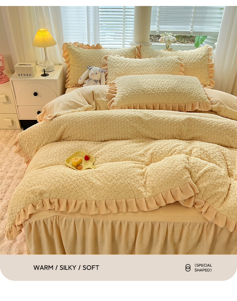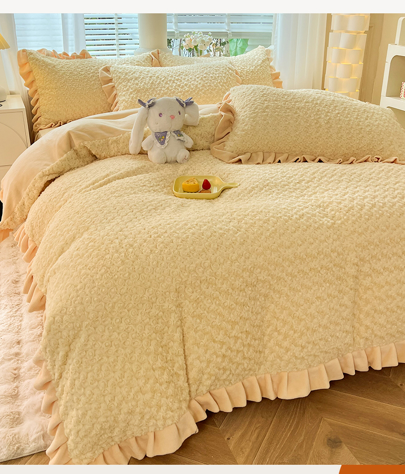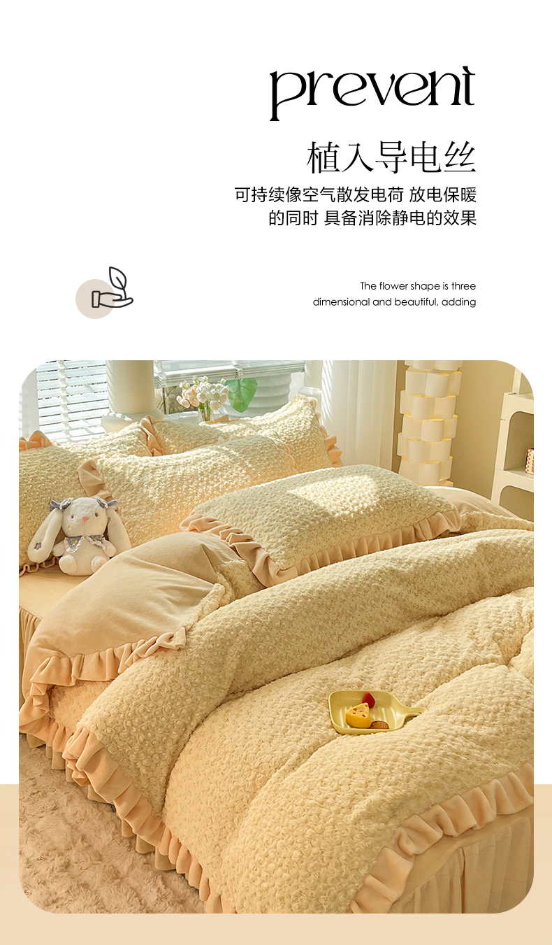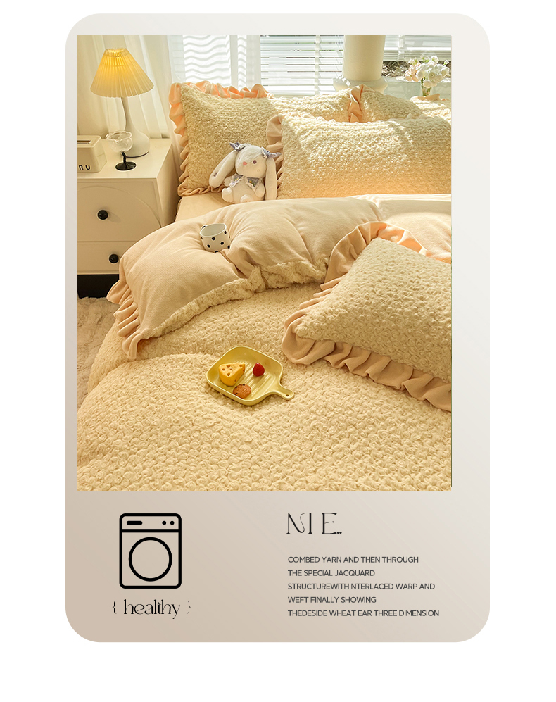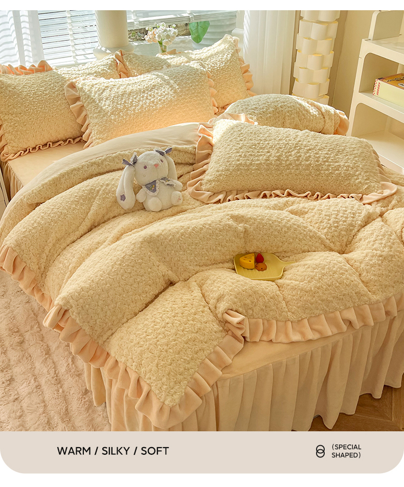 当前位置: 91家纺网 > 商品网购 > 床品套件 > 四件套 > 兔毛绒四件套 > 韩约家纺 2023新款1母婴级兔兔绒牛奶绒韩版四件套-床裙款 约定(奶油黄)