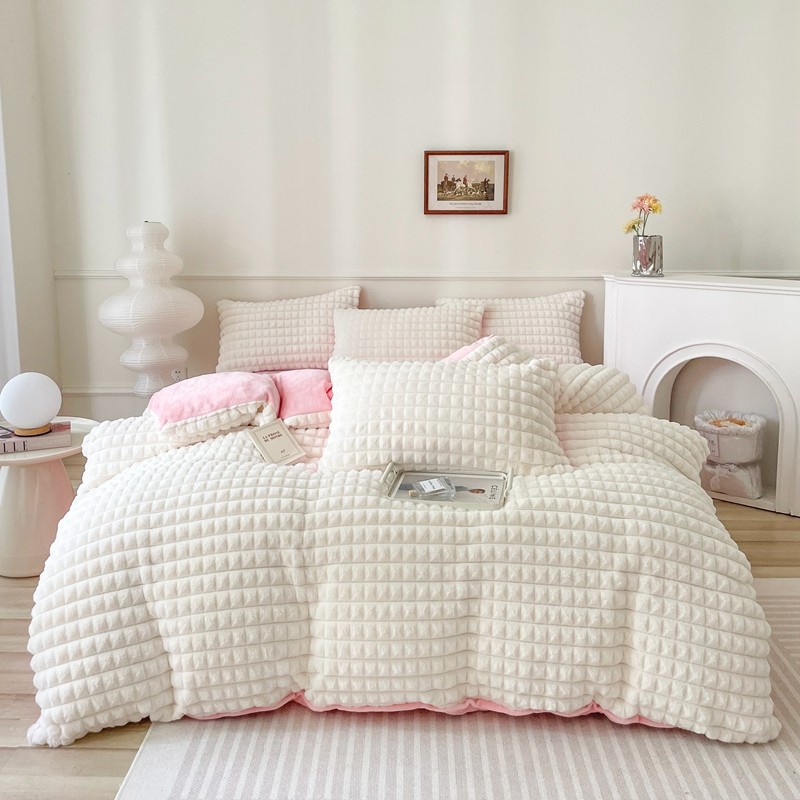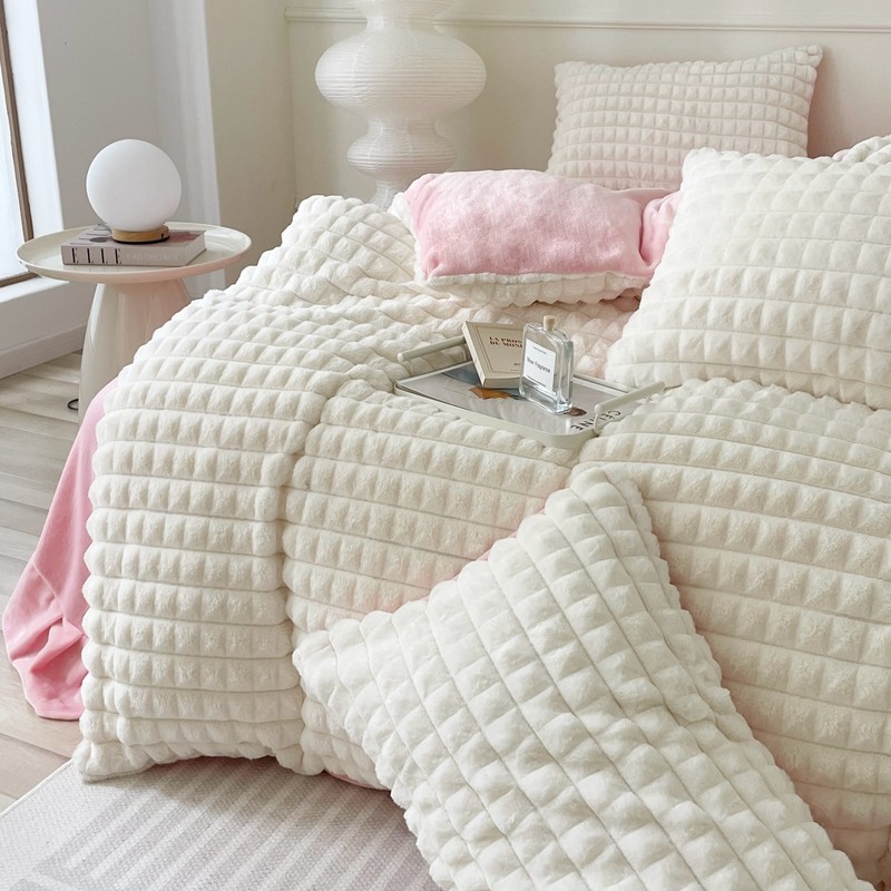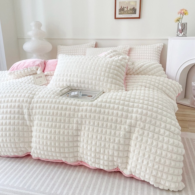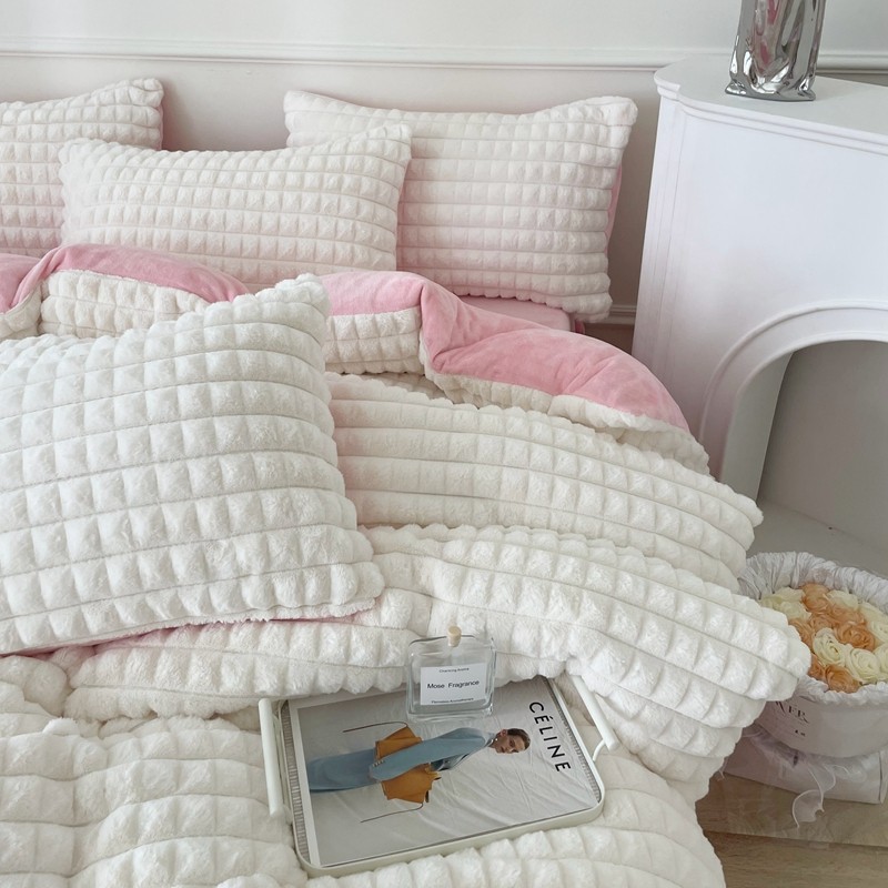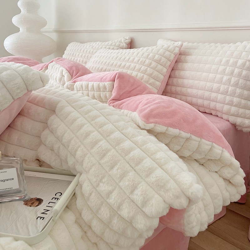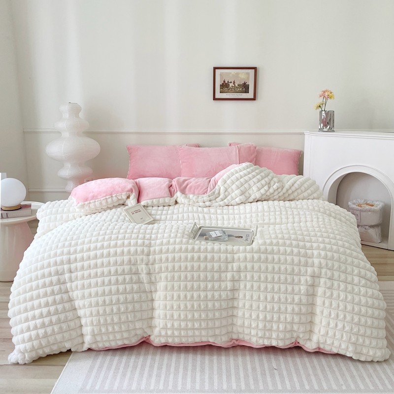 商品名称:畅畅家纺 2023新款兔毛绒兔兔绒懒兔绒立体剪花牛奶绒四件套 泡芙格-白+粉