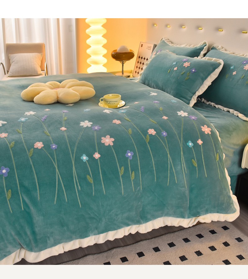 畅畅 2024新款加厚韩版花卉牛奶绒刺绣花四件套婴儿兔毛绒繁花似锦 繁花似锦-湖蓝