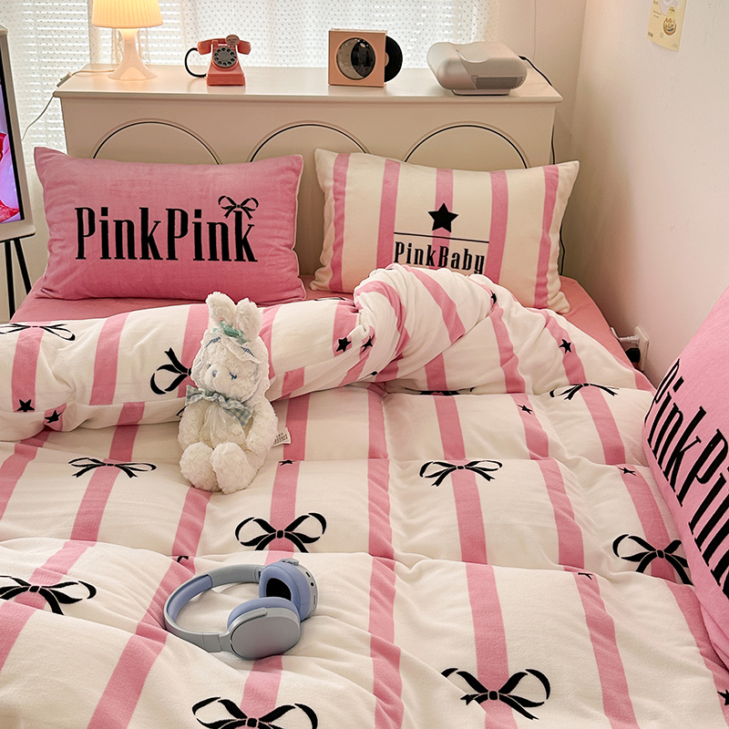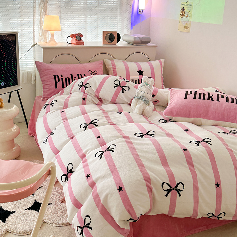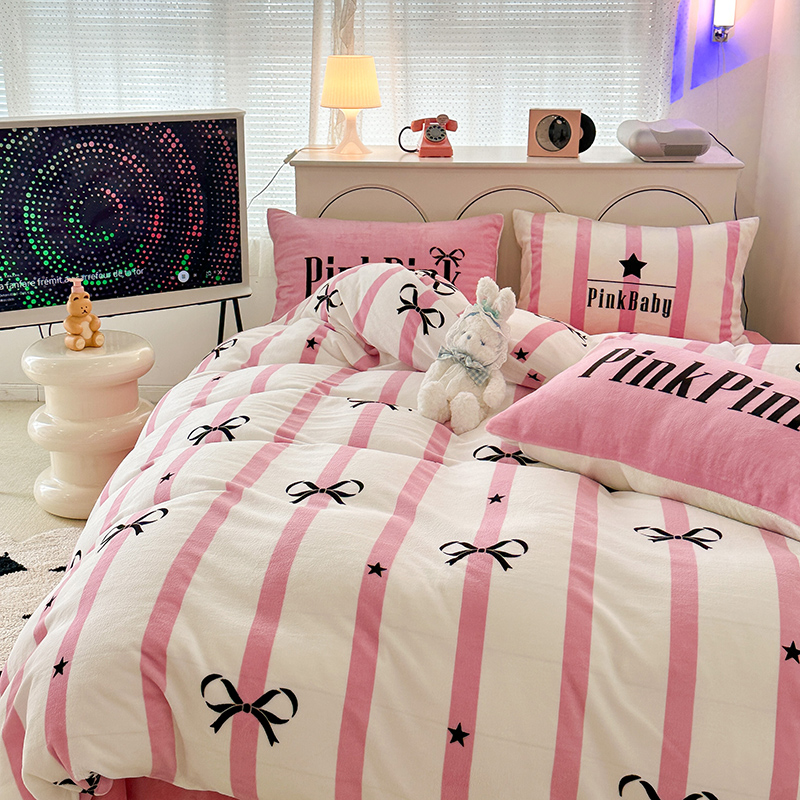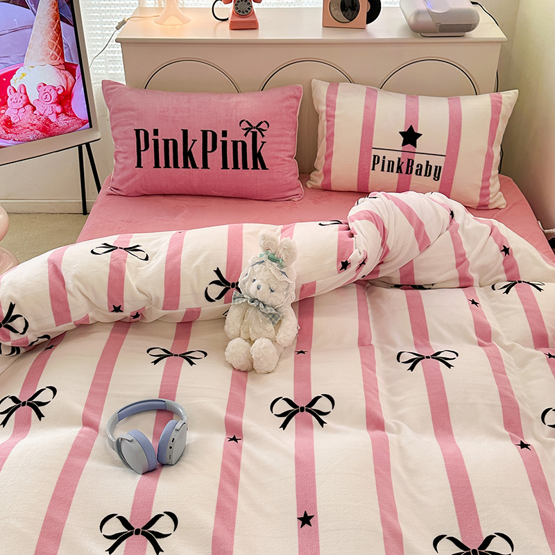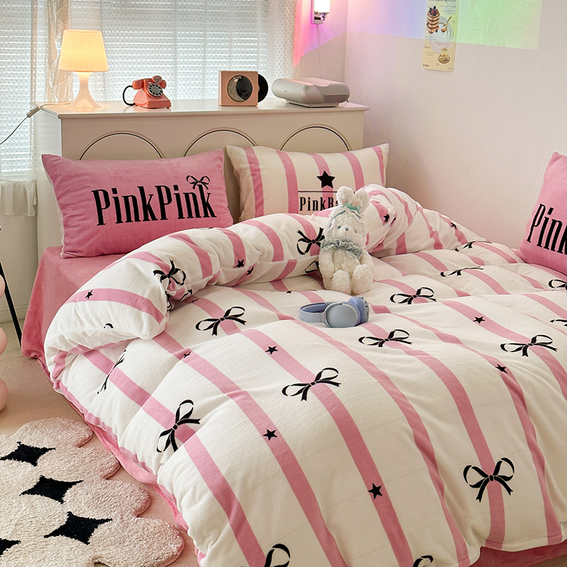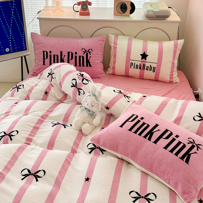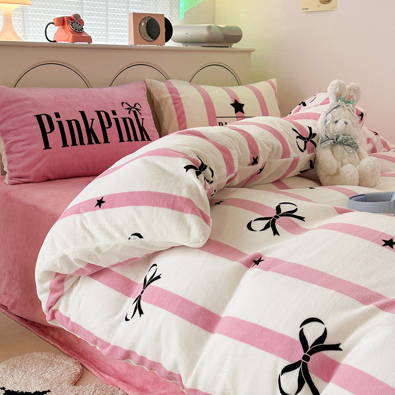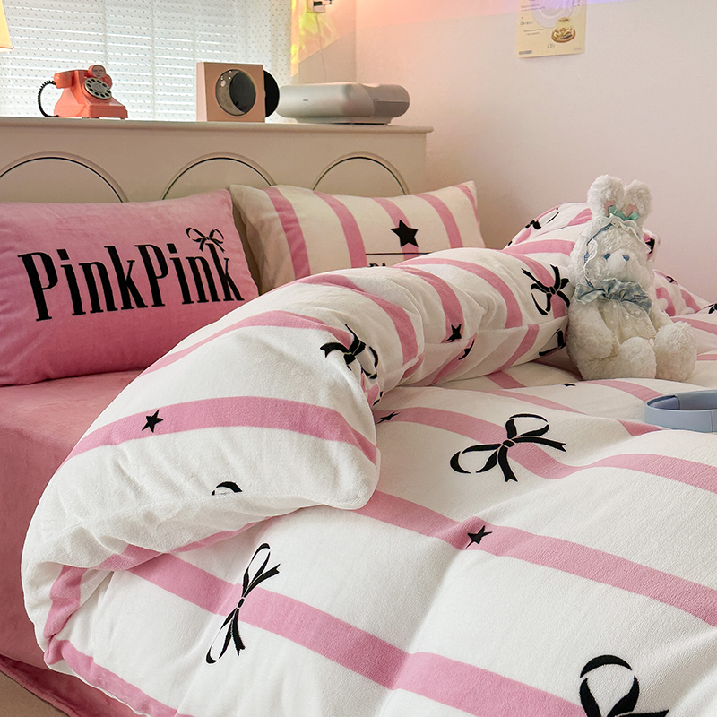 昔可家纺 2023新款大版印花枕套牛奶绒系列四件套 粉条星星蝴蝶结