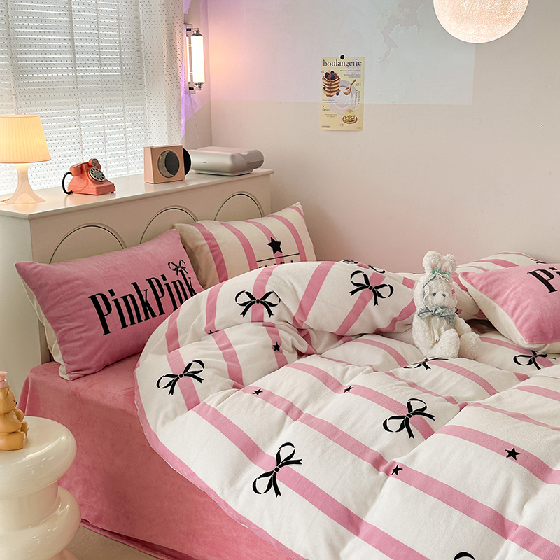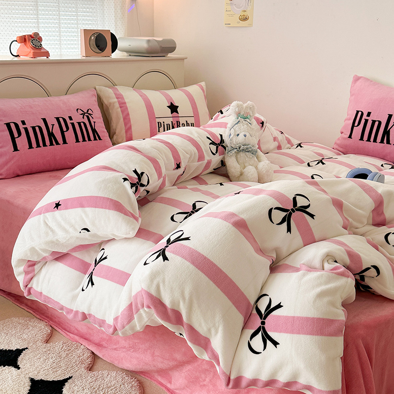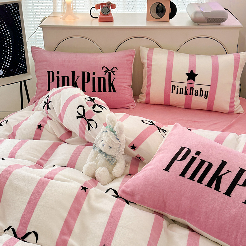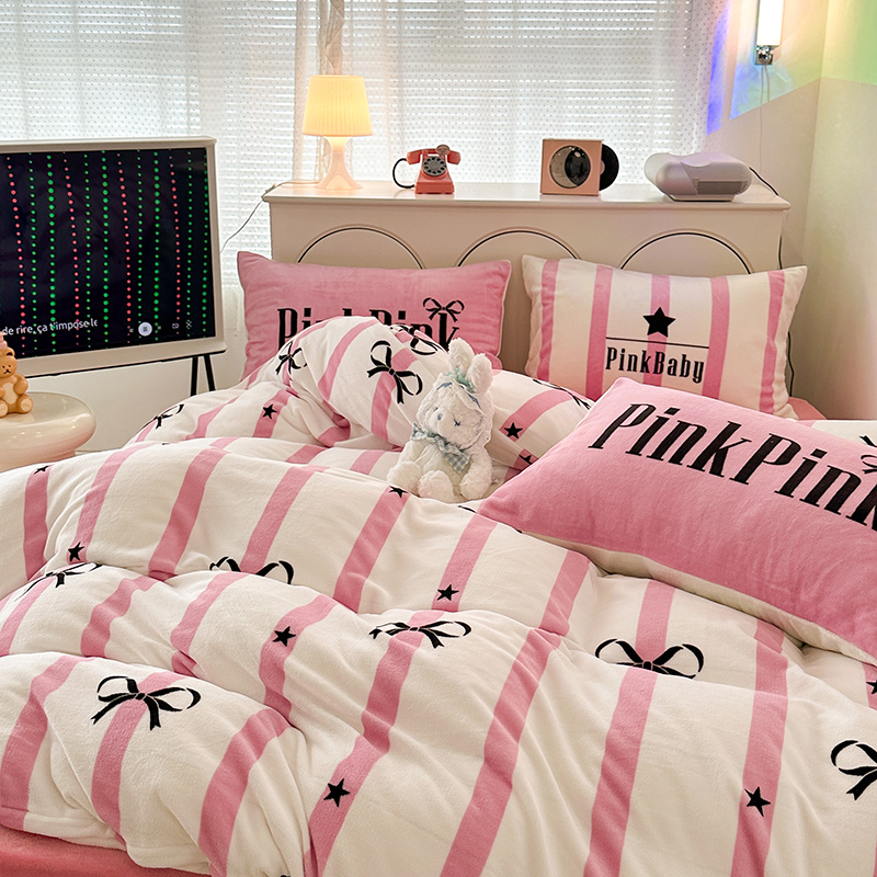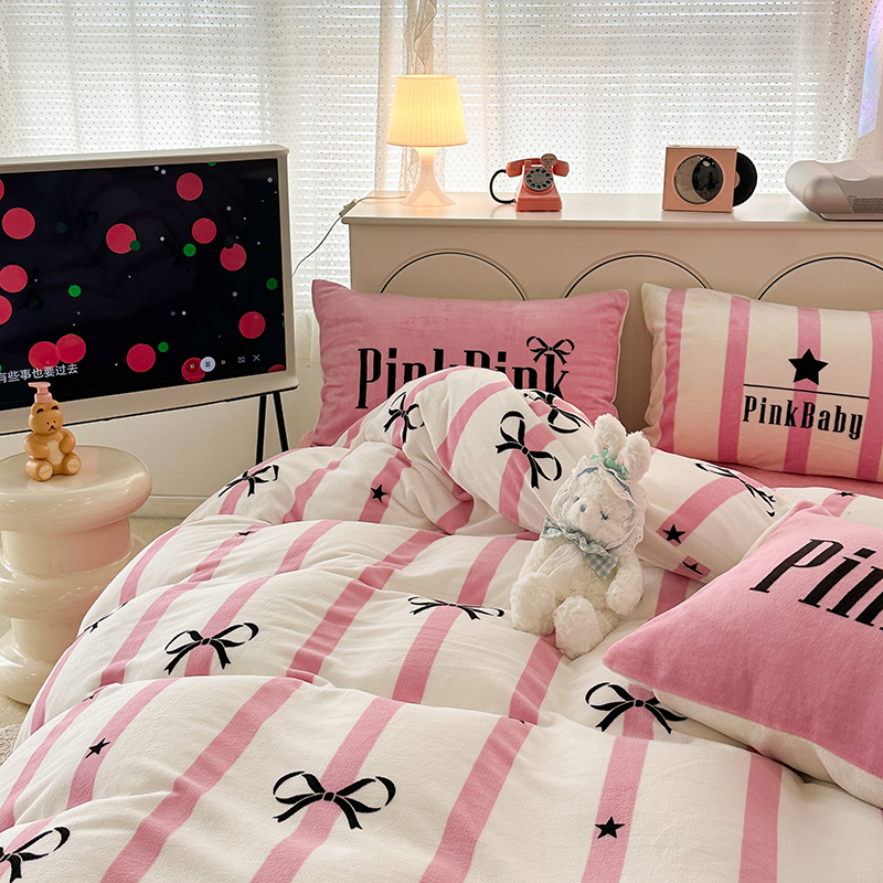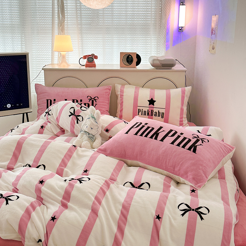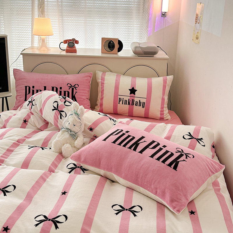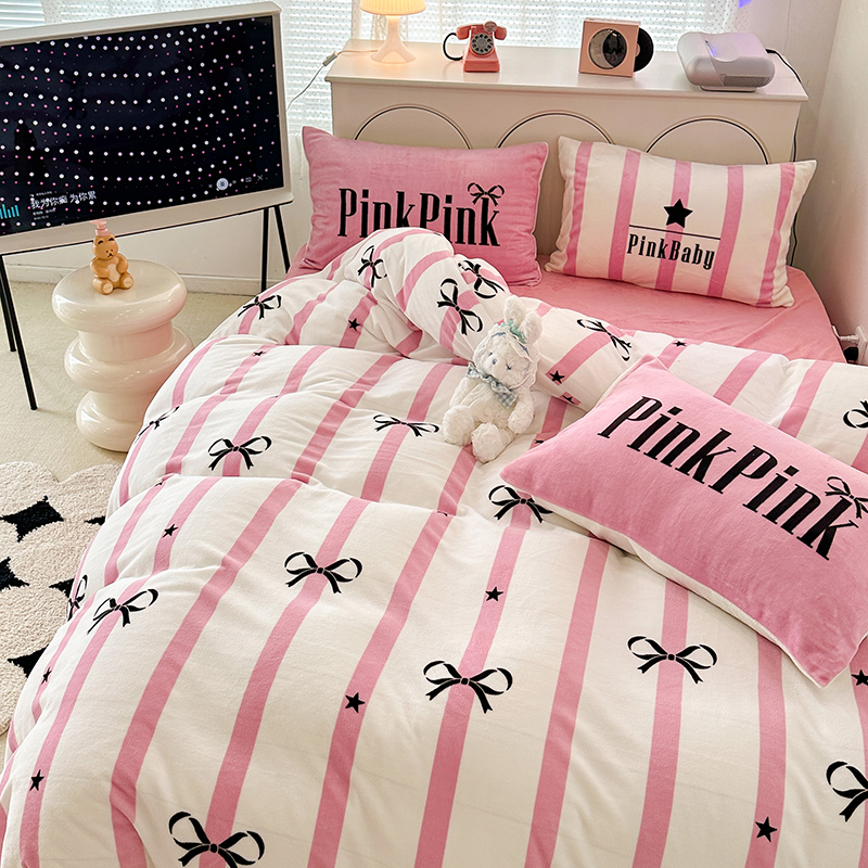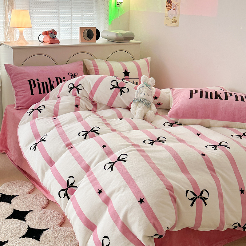 昔可家纺 2023新款大版印花枕套牛奶绒系列四件套 粉条星星蝴蝶结