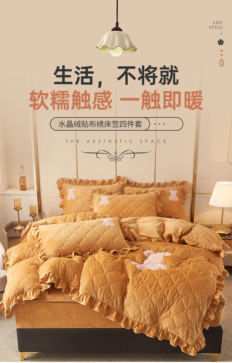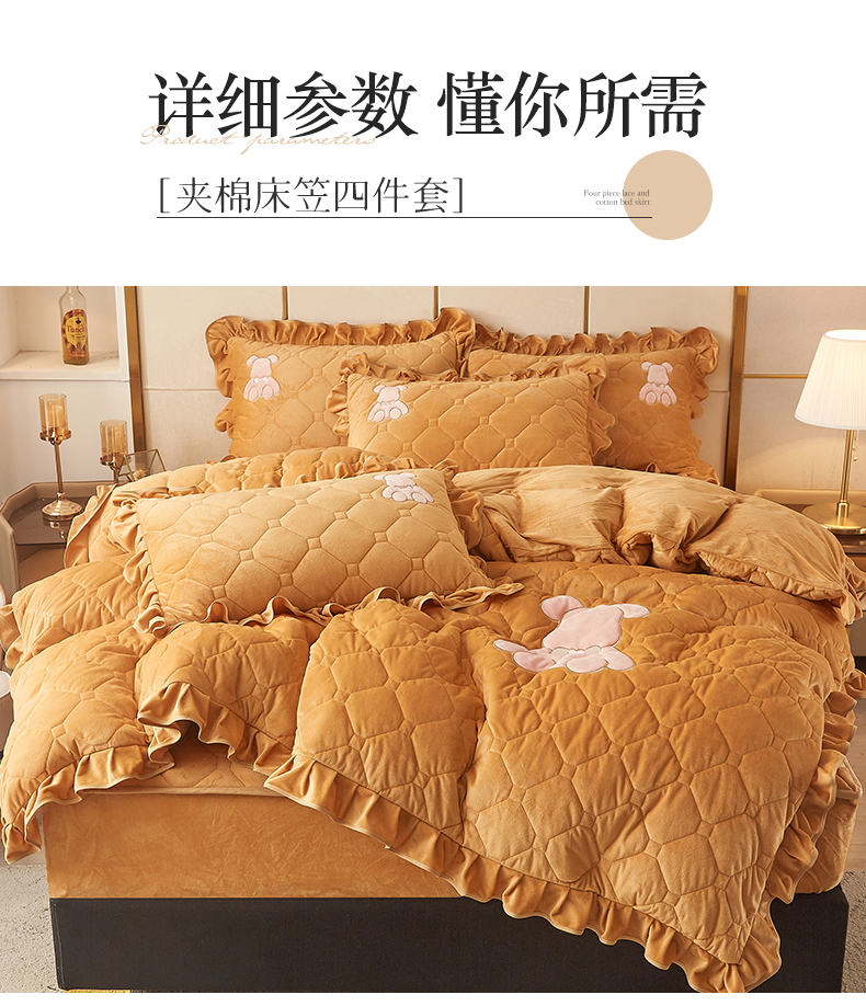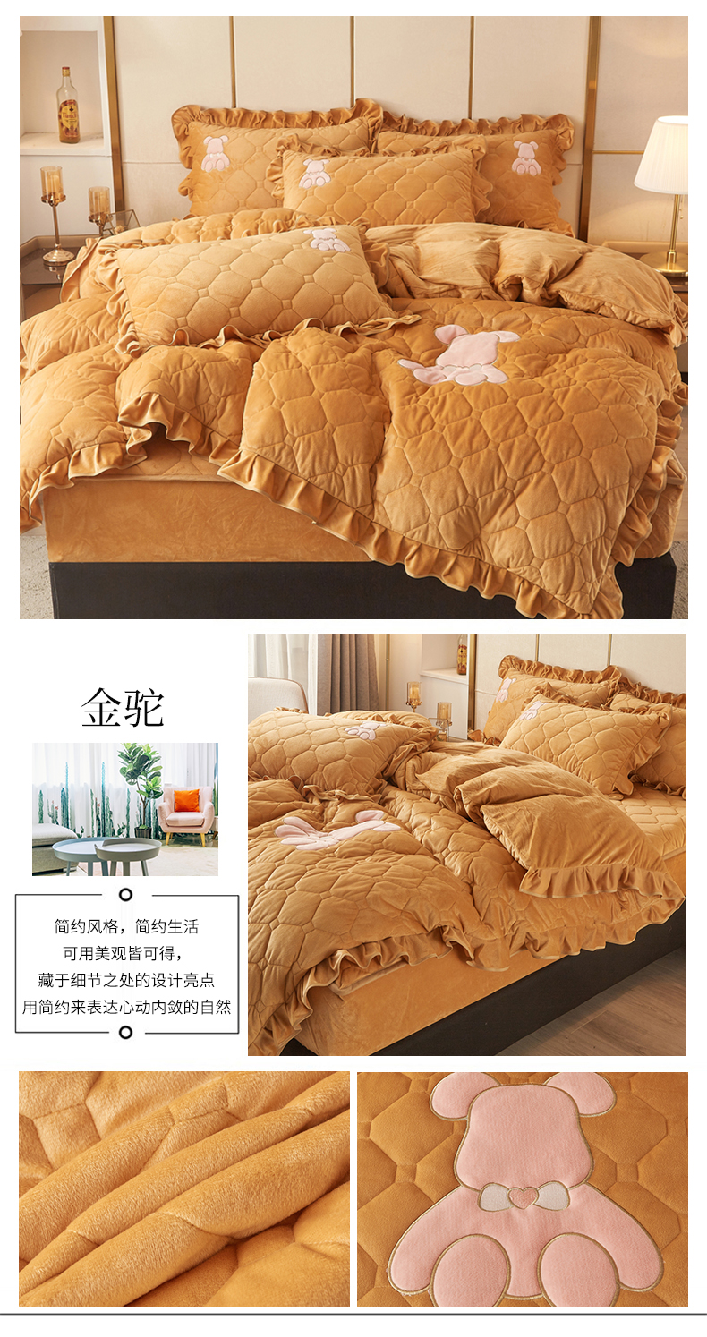 商品名称:屹成 2024新款水晶绒夹棉床笠款四件套贴布绣款-小熊款 金驼