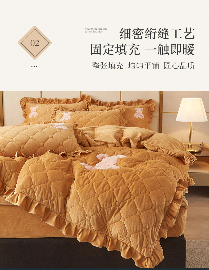 (总)屹成家纺2025新款水晶绒夹棉绗缝床裙四件套(塞纳河畔)四件套起售价不低于230元,大红,豆沙,翡翠绿,粉玉,橄榄绿,蔚蓝,银灰