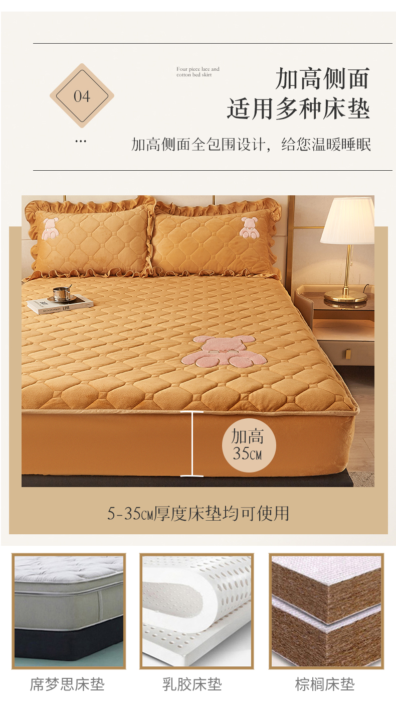 (总)屹成家纺2025新款水晶绒夹棉绗缝蕾丝床裙三件套(塞纳河畔)床裙单件起售价不低于105元,大红,豆沙,翡翠绿,粉玉,橄榄绿,蔚蓝,银灰