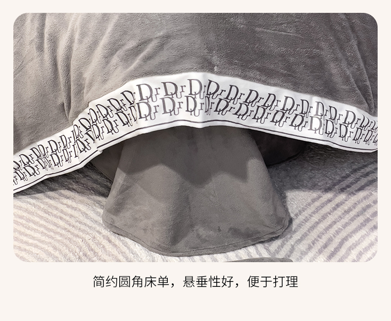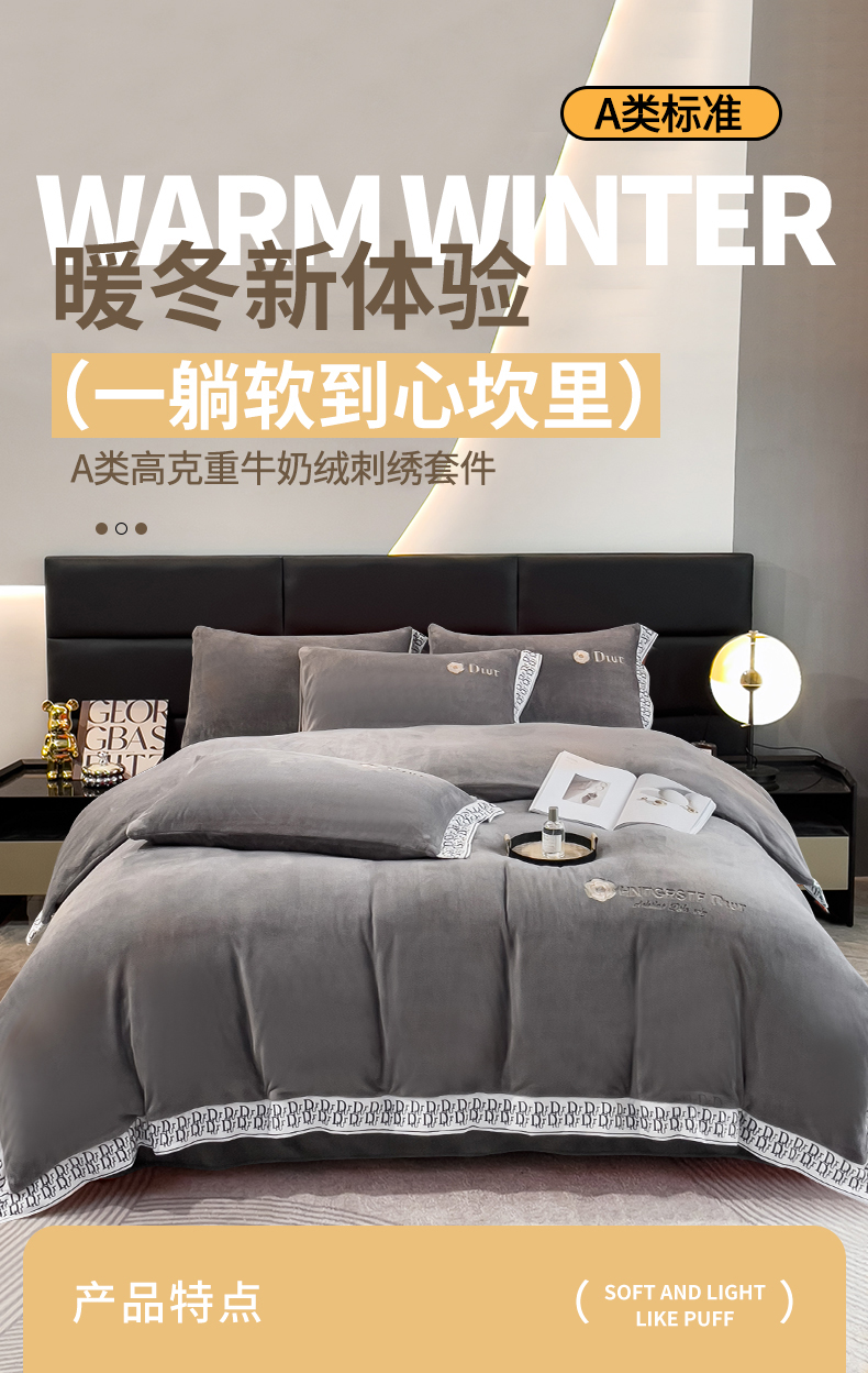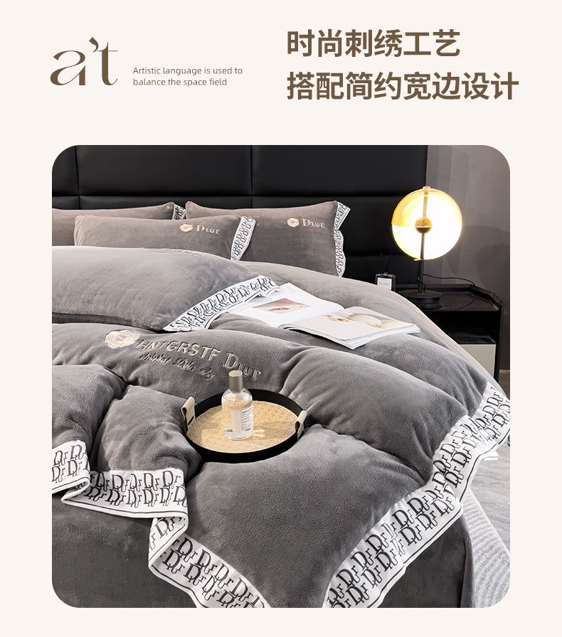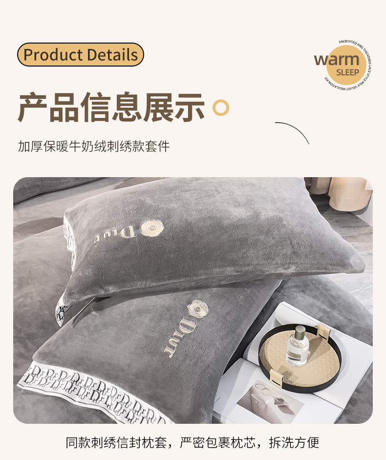商品名称:露梦家纺 2025新款高克重牛奶绒刺绣四件套-简素(风格二) 简素-高级灰