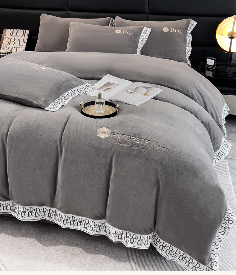 露梦家纺 2025新款加厚保暖牛奶绒刺绣款四件套-轻羽(风格二) 轻羽-银河灰,轻羽-银河灰
