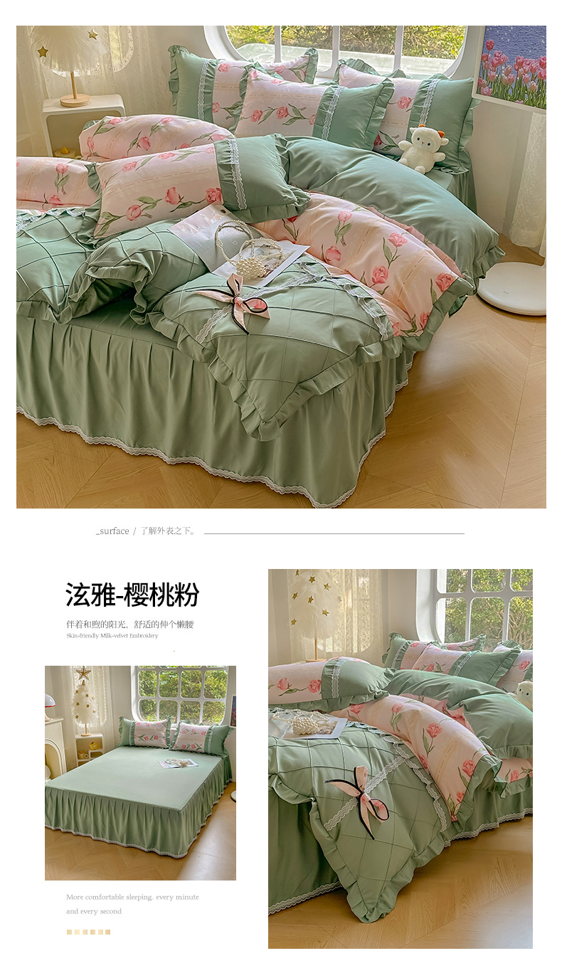金米诺 新款韩版花边水洗棉泡泡纱四件套公主条四件套 褶皱-浅绿,褶皱-浅绿