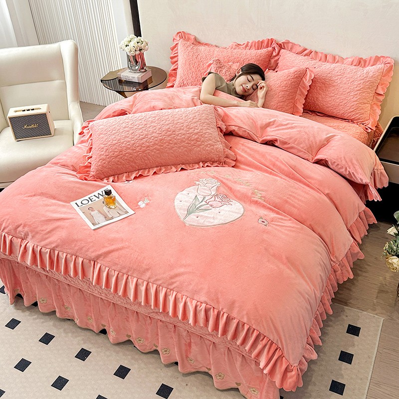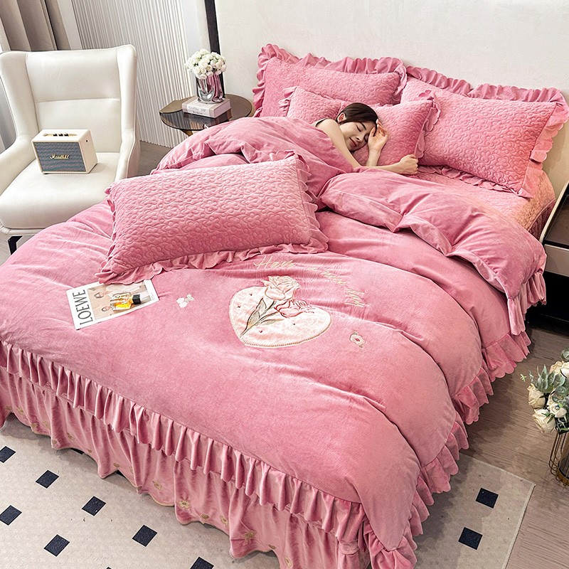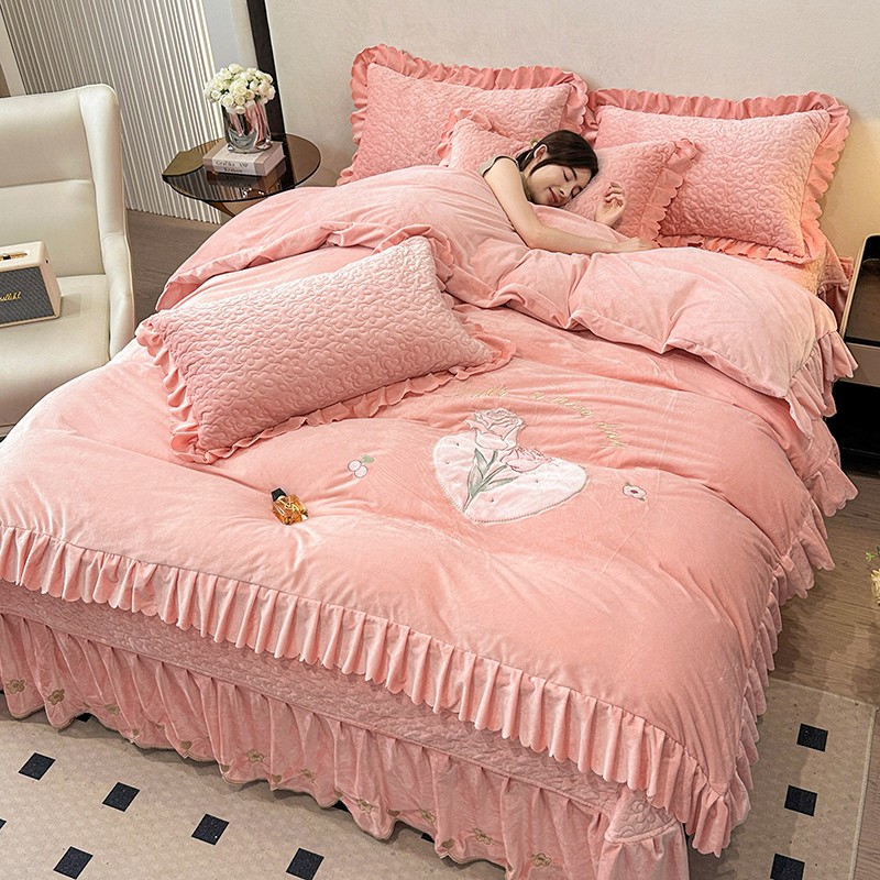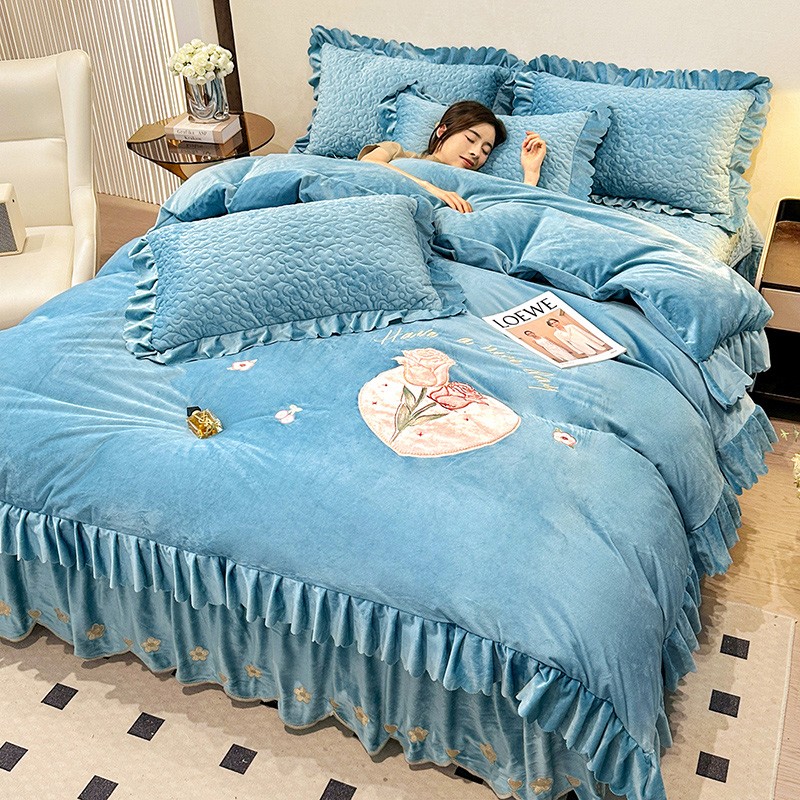 (总)漫布云 2025新款230g高克重韩版立体盘花牛奶蚕丝绒绣花四件套床裙款被套-洛丽塔系列,洛丽塔-嫩黄 ,洛丽塔-香芋紫,洛丽塔-珍珠粉, 洛丽塔-婴儿蓝
