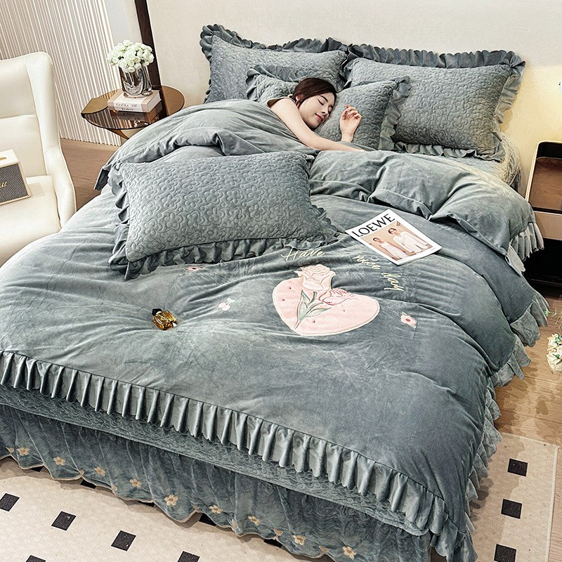 漫布云2025秋冬新款11斤230g全消光牛奶绒夹棉床盖款四件套纯色蕾丝花边刺绣床裙款床盖,蝶恋花-梦幻紫, 蝶恋花-嫩黄 ,蝶恋花-新芽绿, 蝶恋花-婴儿蓝, 蝶恋花-樱花粉