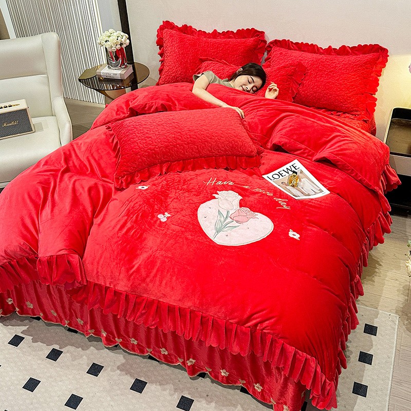 2025秋冬新款高克重9斤全消光牛奶绒大红结婚婚庆四件套大红色龙凤刺绣婴儿绒绒四件套(含精美手提袋),永恒 , 喜结连理,倾城 ,喜嫁,龙凤吉祥 ,爱意浓 ,甜蜜蜜