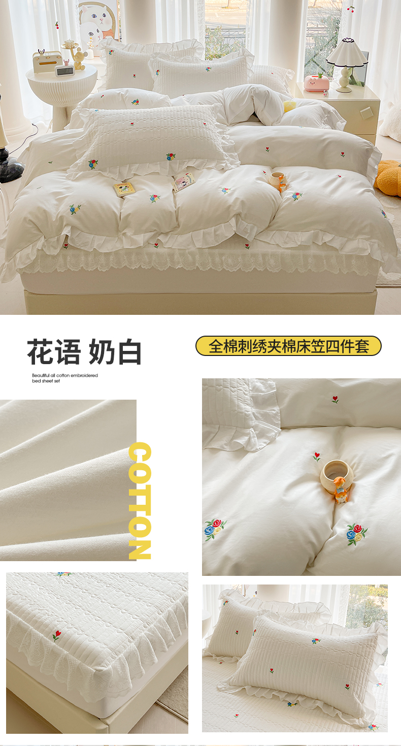 宜凡家纺 2024新款全棉夹棉绣花花边系列床笠四件套 花语 奶白