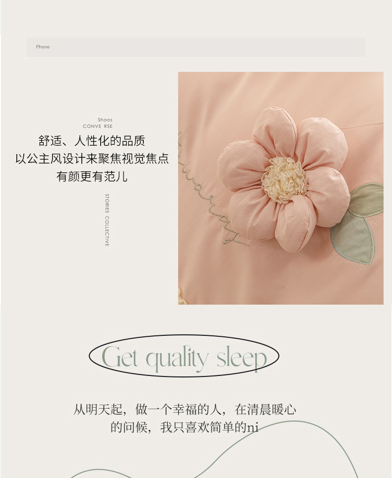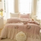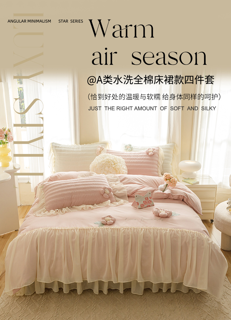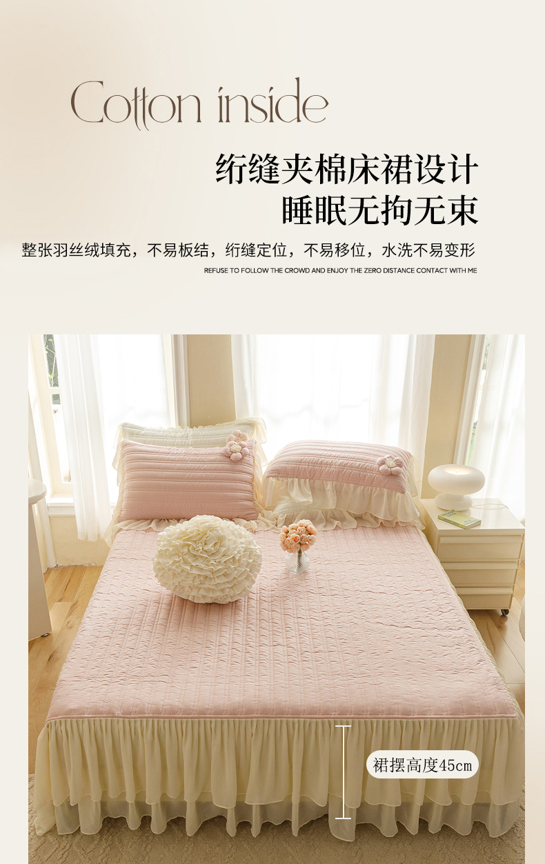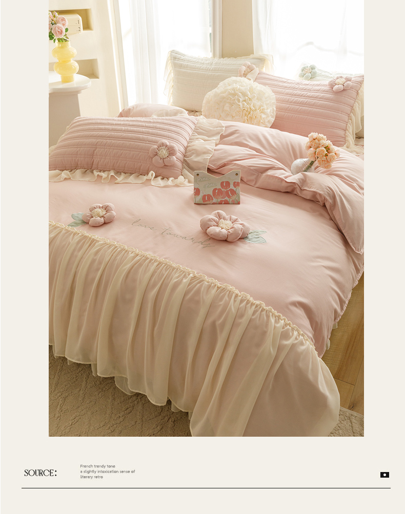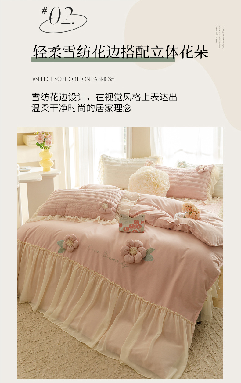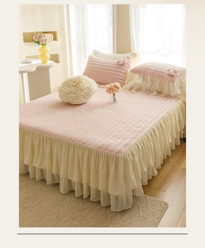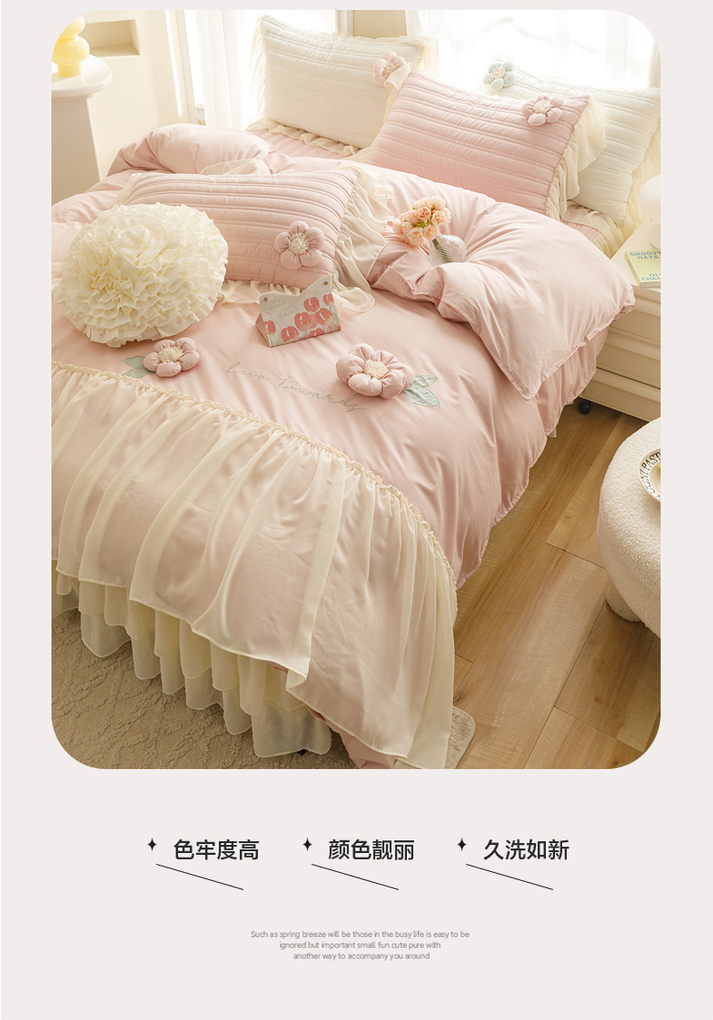 商品名称:胜权家纺 2024新款A类水洗60支全棉工艺款夹棉床裙四件套 花儿朵朵-胭脂粉