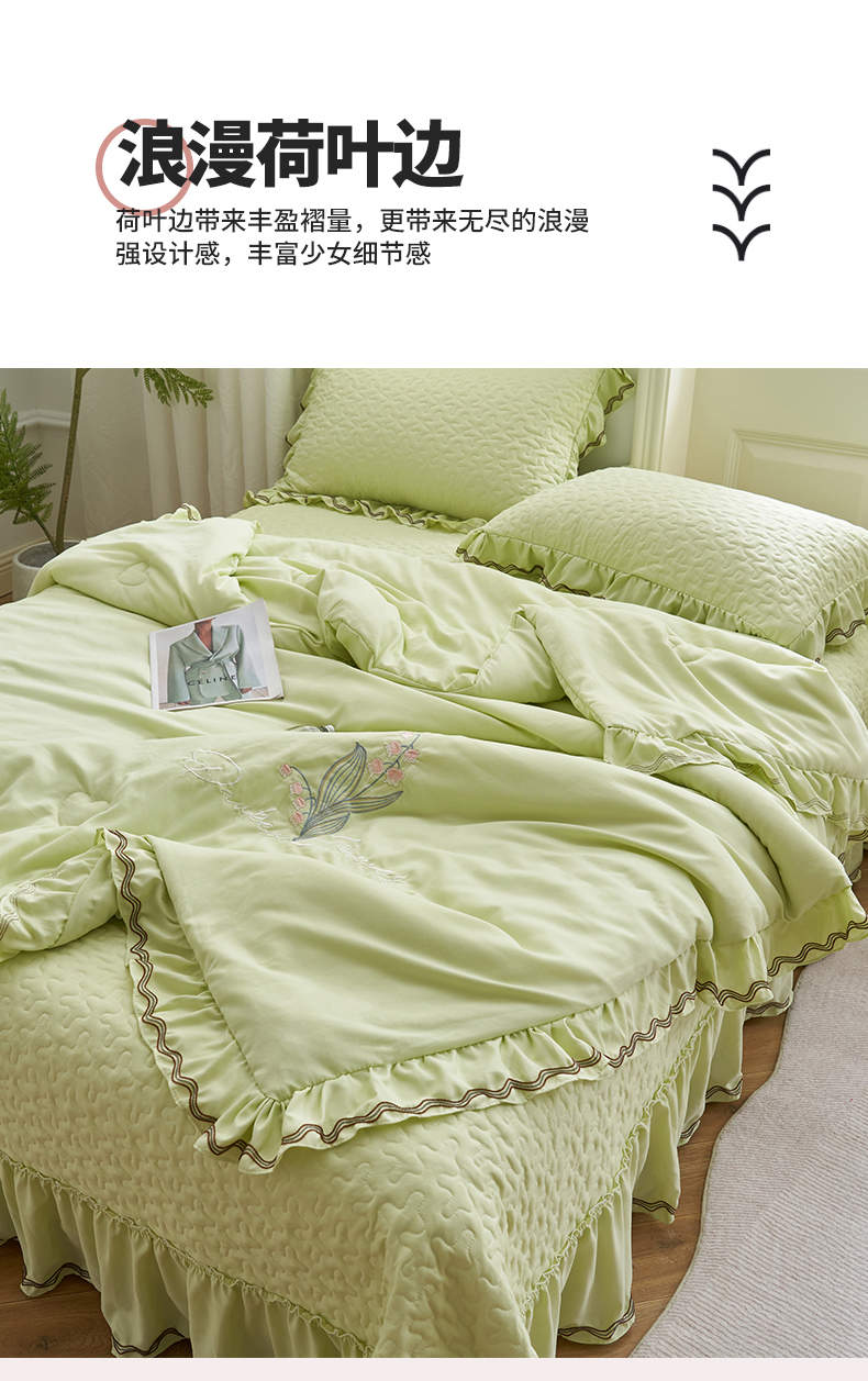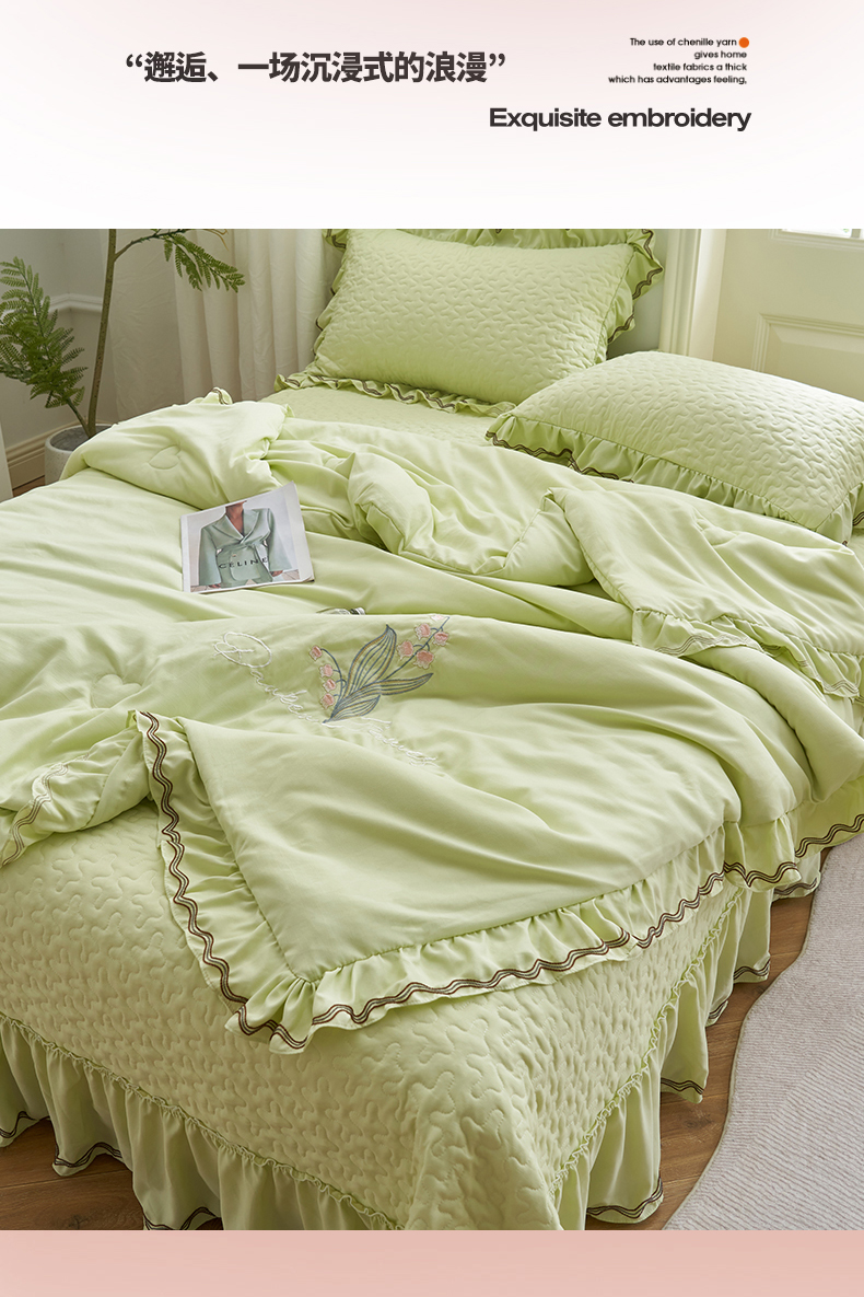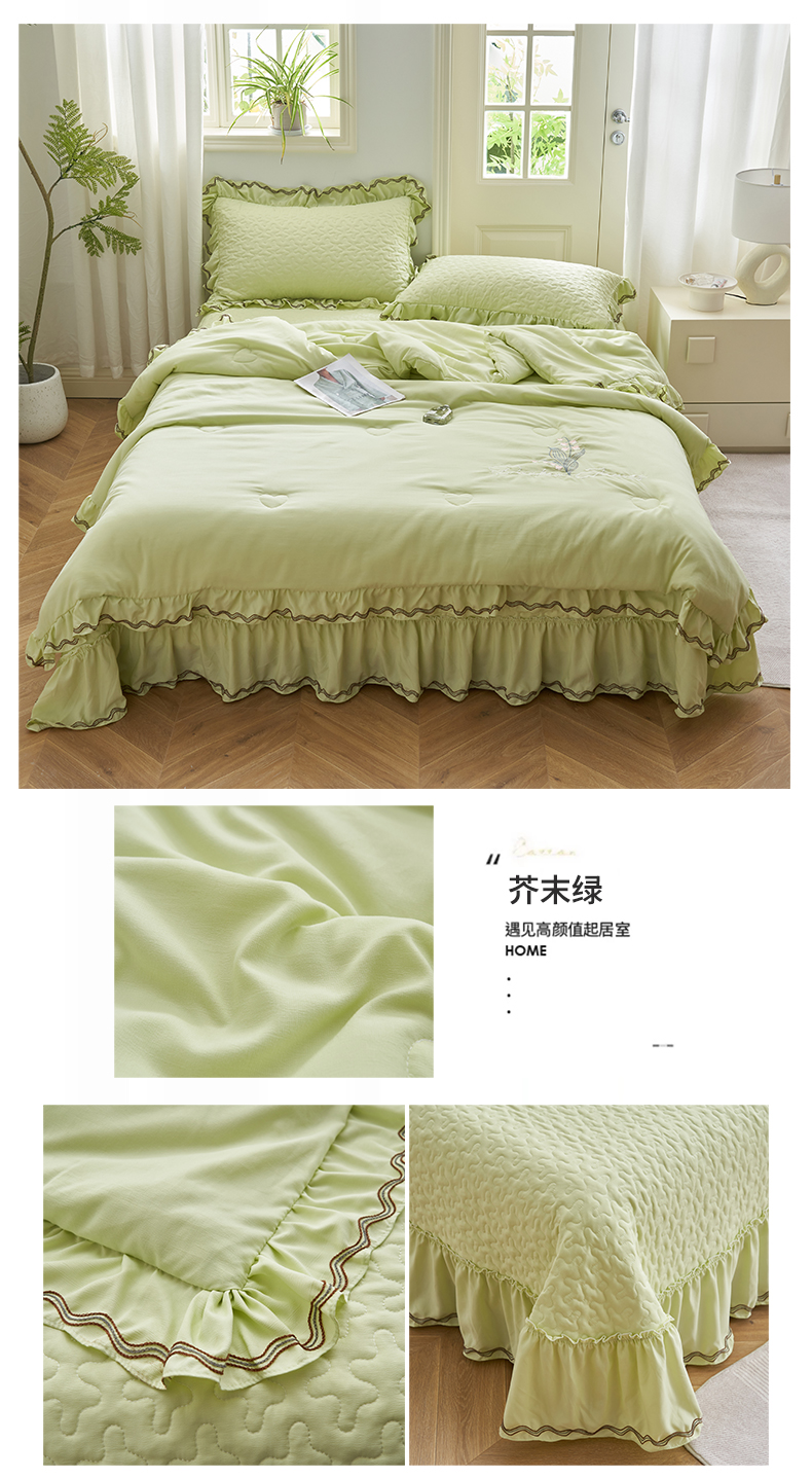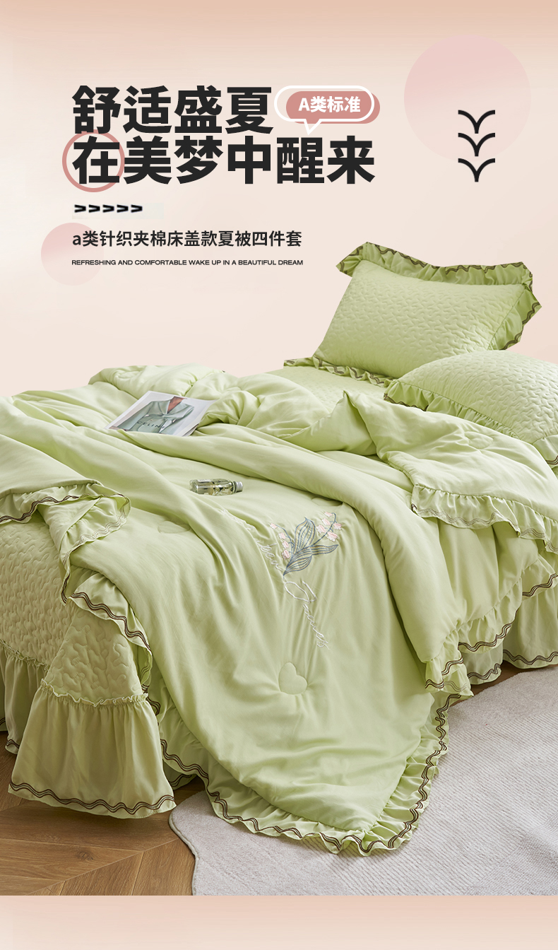 商品名称:恒爱家纺 2024新款A类针织夹棉床盖款夏被四件套-玉玲珑 芥末绿