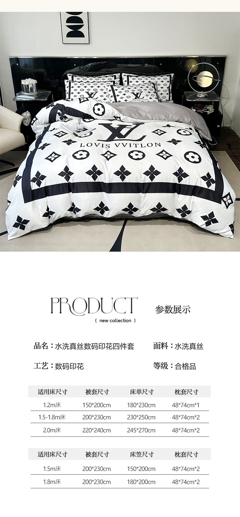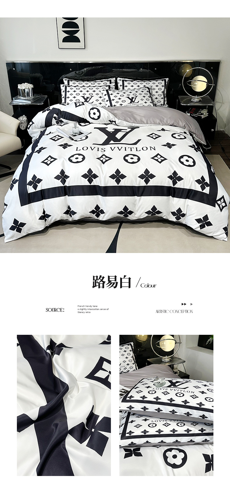 商品名称:色鬼布艺 2024新款水洗真丝轻奢系列数码印花四件套 路易白