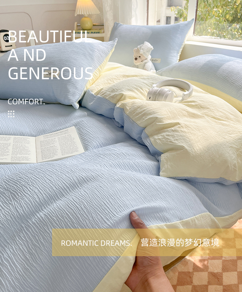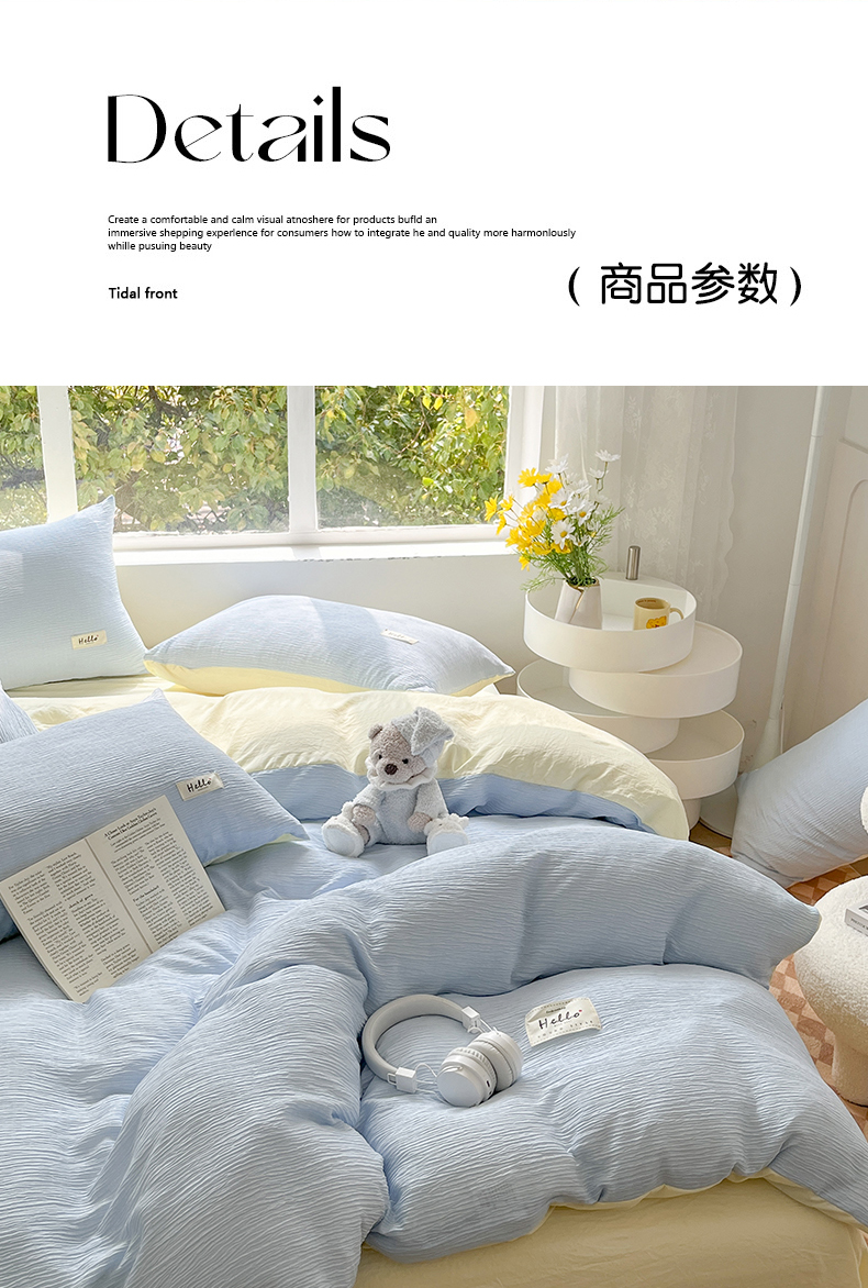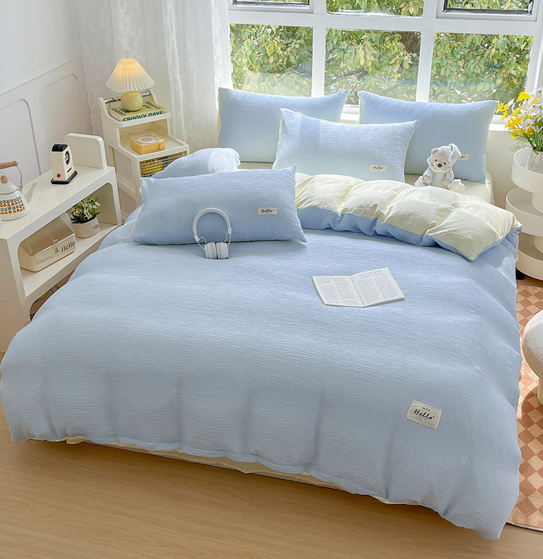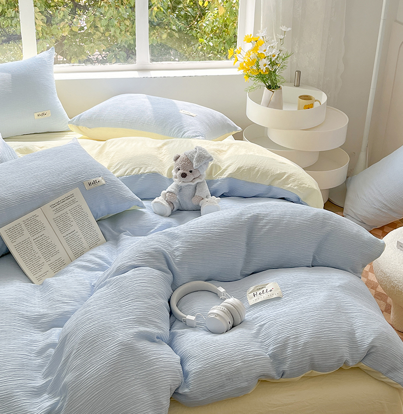 当前位置: 91家纺网 > 商品网购 > 床品套件 > 四件套 > 水洗棉四件套 > 优选 2025新款韩版轻奢皱皱纱水洗棉拼色床单床笠四件套三件套-天空蓝