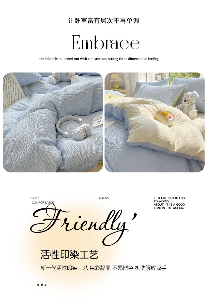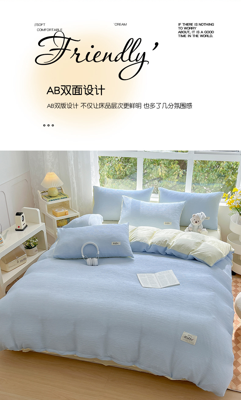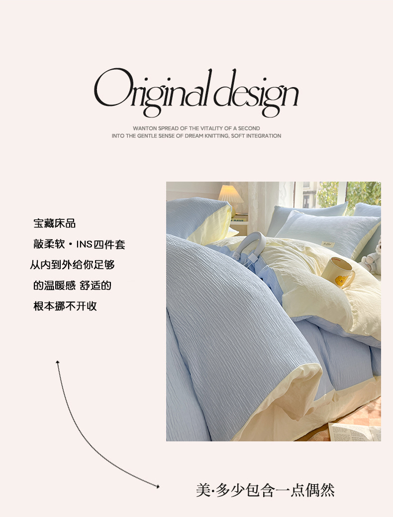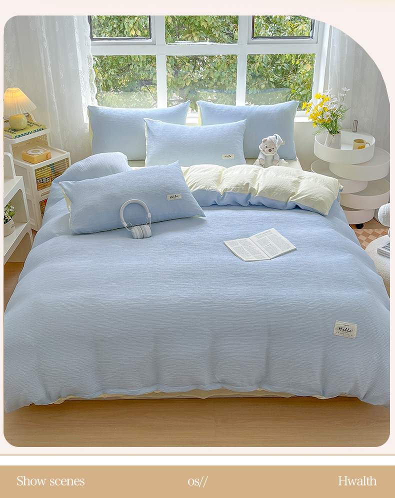 当前位置: 91家纺网 > 商品网购 > 床品套件 > 四件套 > 水洗棉四件套 > 优选 2025新款韩版轻奢皱皱纱水洗棉拼色床单床笠四件套三件套-天空蓝